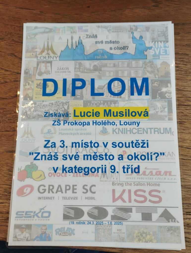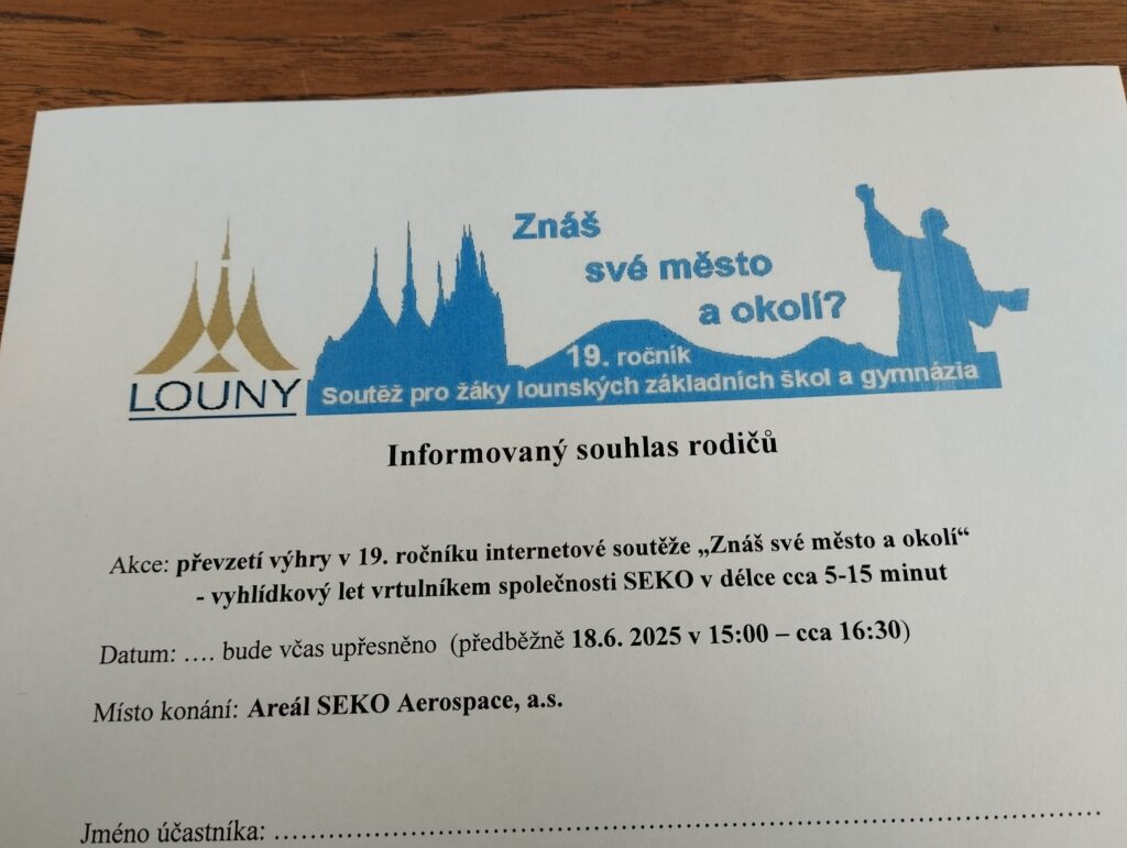 Naše žákyně Lucie Musilová se zúčastnila soutěže Znáš své město a okolí, kterou každoročně vyhlašuje ZŠ Kpt. Otakara Jaroše Louny, a skončila na překrásném 3. místě, za což získala velmi lákavou cenu - let vrtulníkem nad naším městem.