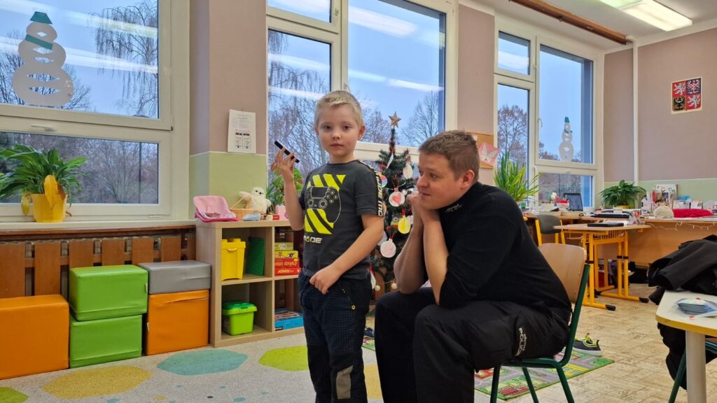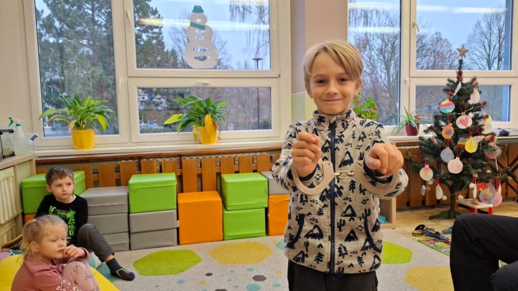 Součástí besedy byla i prevence v parku – pan strážník dětem přiblížil, jak bezpečně používat hřiště, kam chodit a kde si dávat pozor.