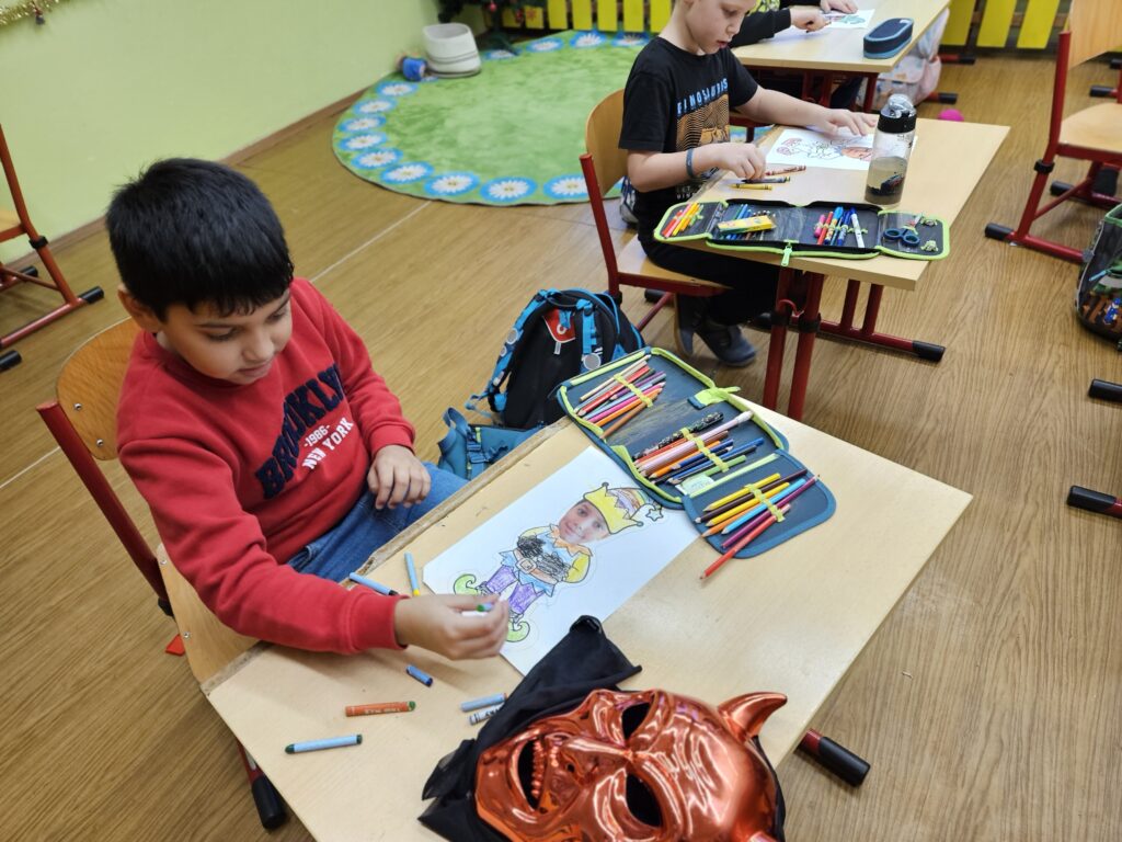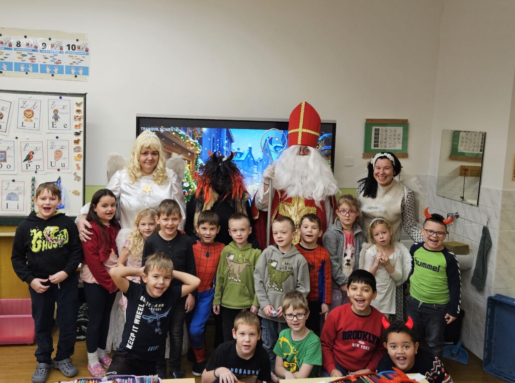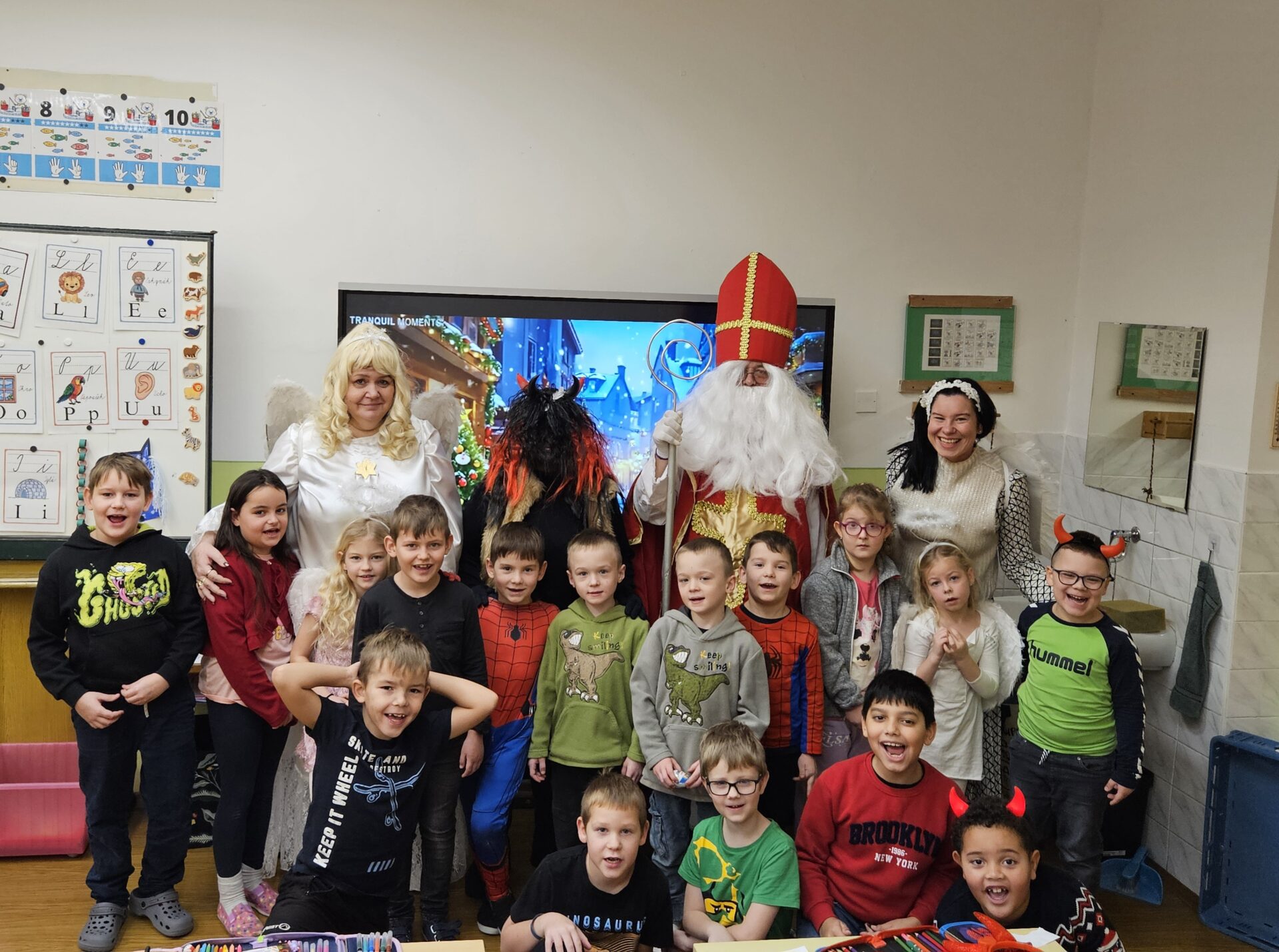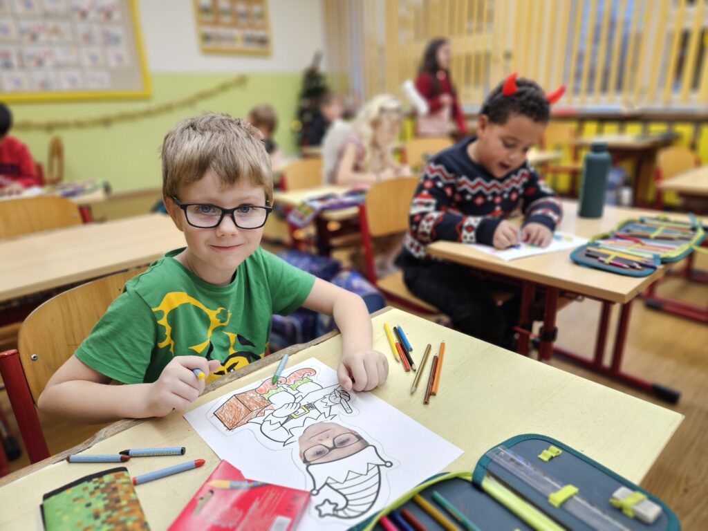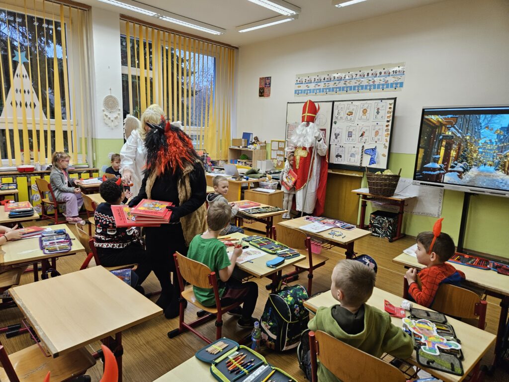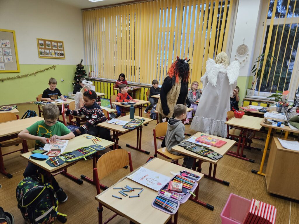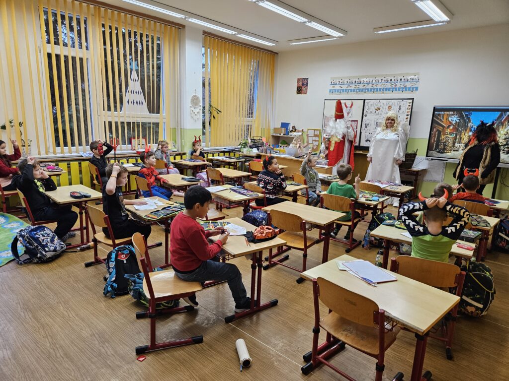 V tom nás vyrušilo hlasité zaklepání na dveře, až jsme nadskočili úlekem. Do třídy vstoupil samotný Mikuláš, doprovázený čertem a andělem. Velmi ho zajímalo, zda se mezi námi najde někdo zlobivý a kdo je naopak hodný. Paní učitelka nám dala možnost, abychom se sami zamysleli a rozhodli, jak to s námi je.
