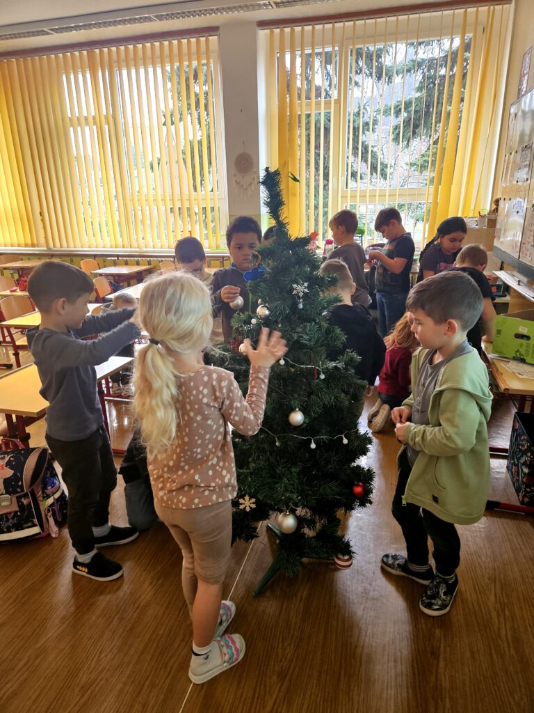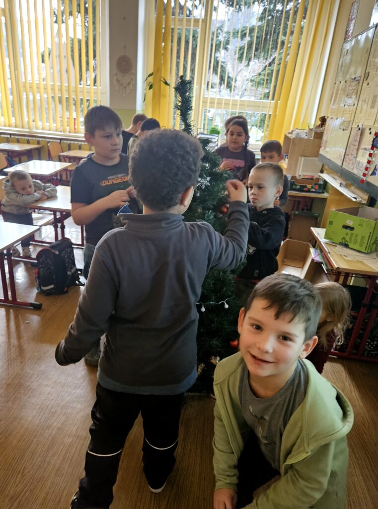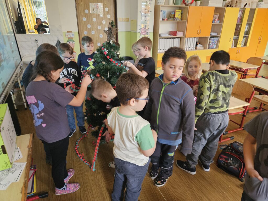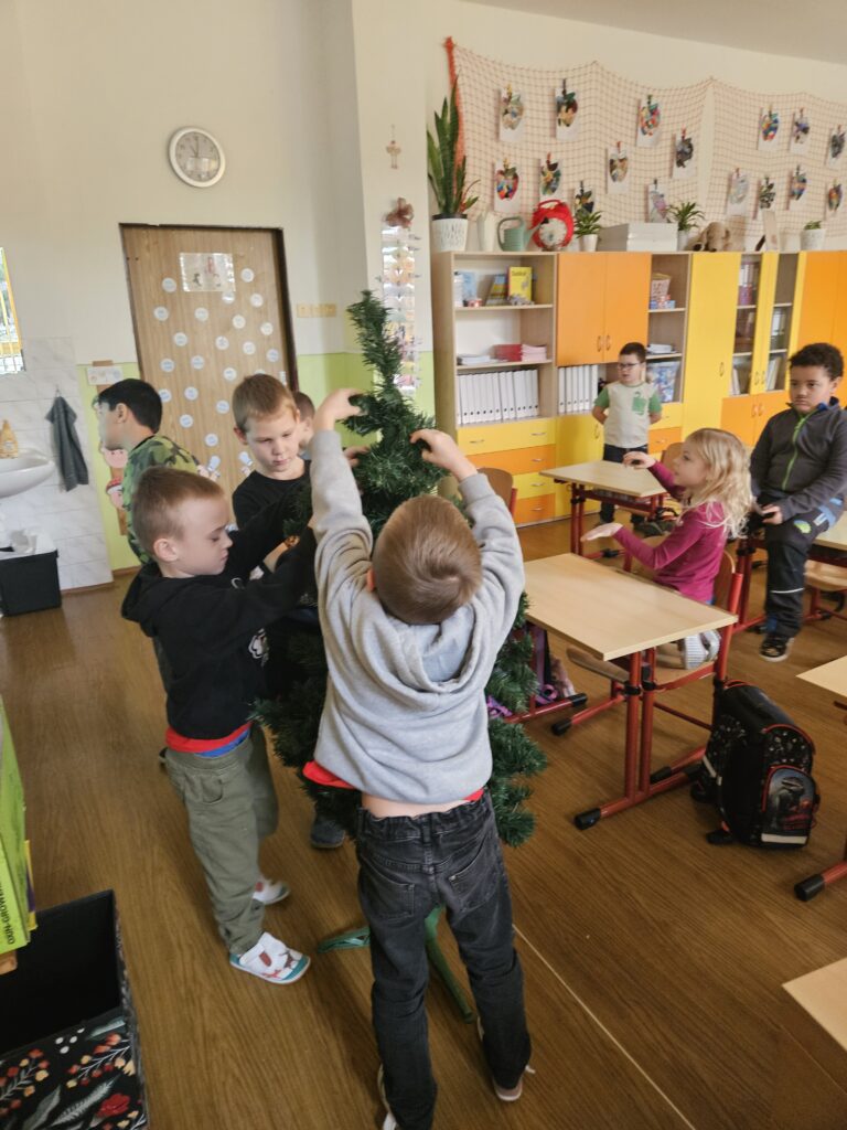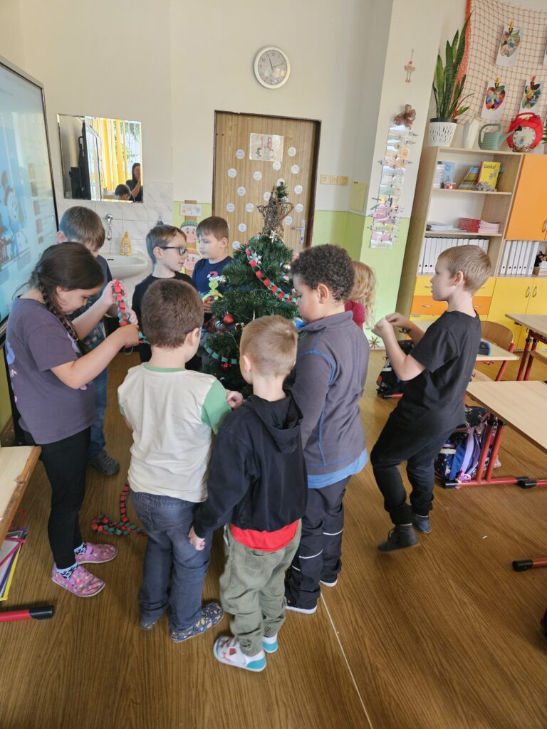 První adventní neděle už klepe na dveře, a tak jsme si s dětmi přenesli kousek vánoční atmosféry přímo do třídy. Za zvuků veselých koled jsme společně ozdobili stromeček a přidali i krásný papírový řetěz, který si pro tyto účely děti samy vyrobily.