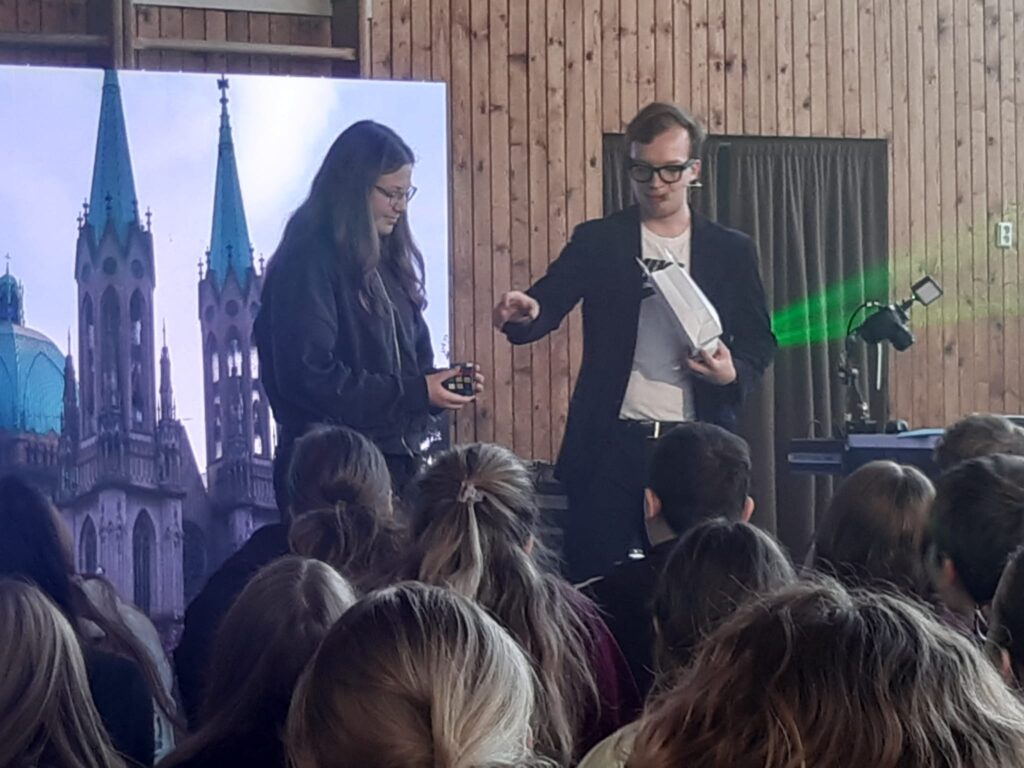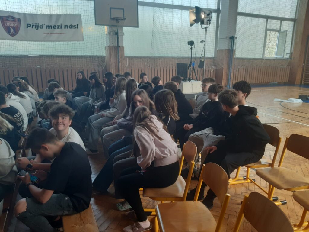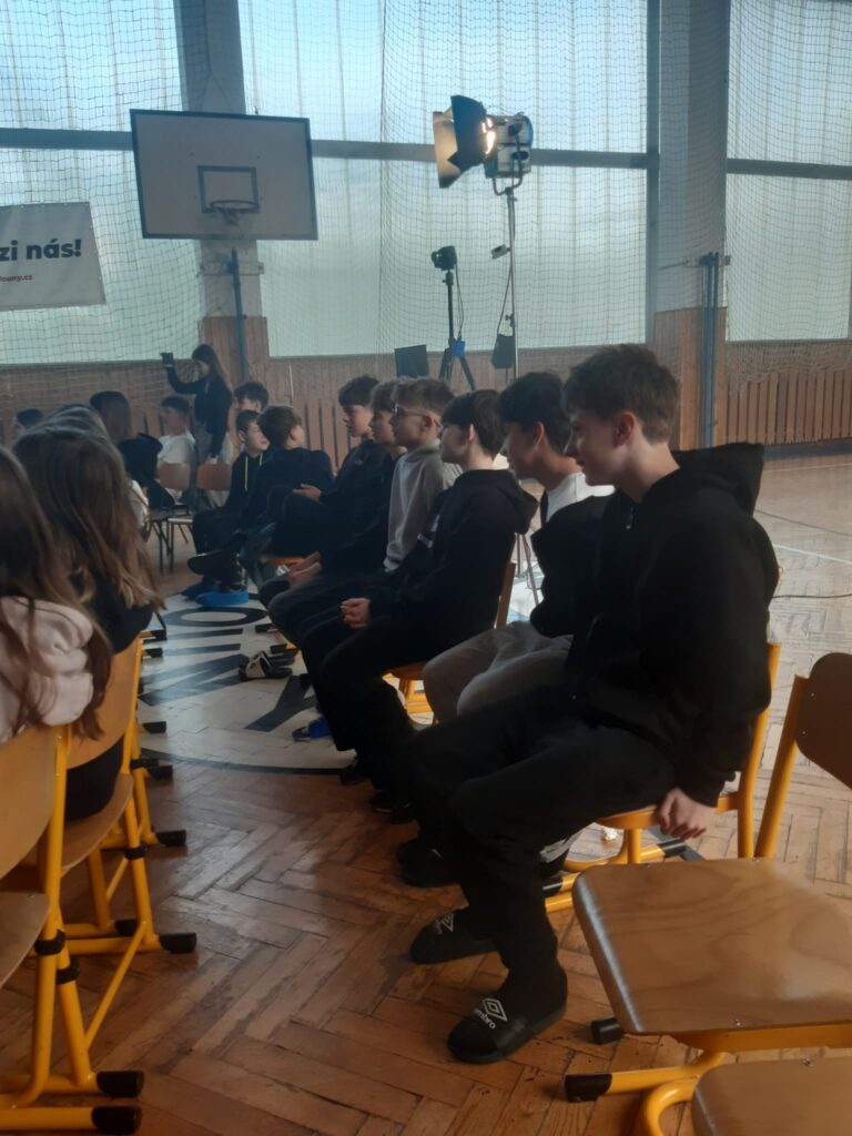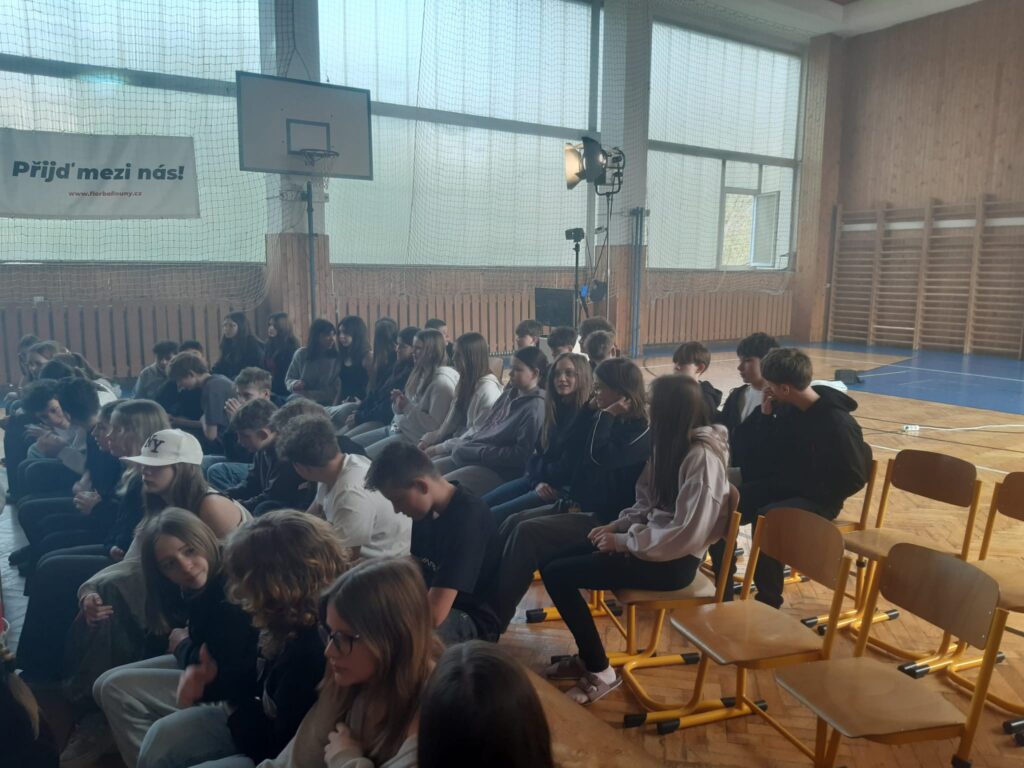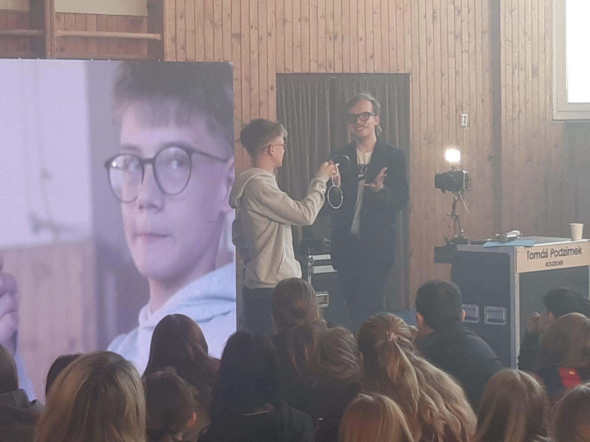 Největší radost a smích ale přišly ve chvíli, kdy se někteří naši spolužáci stali součástí samotného vystoupení a pomáhali kouzelníkovi přímo na improvizovaném pódiu.