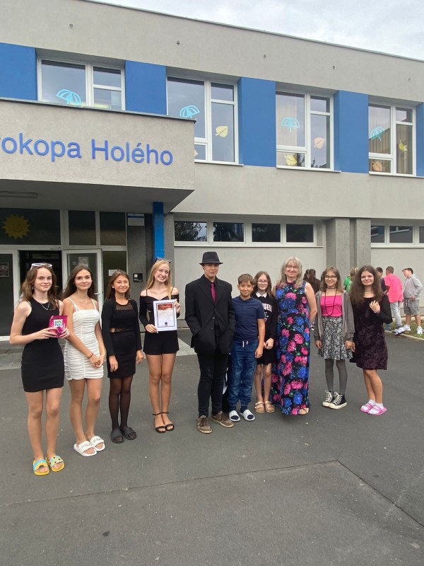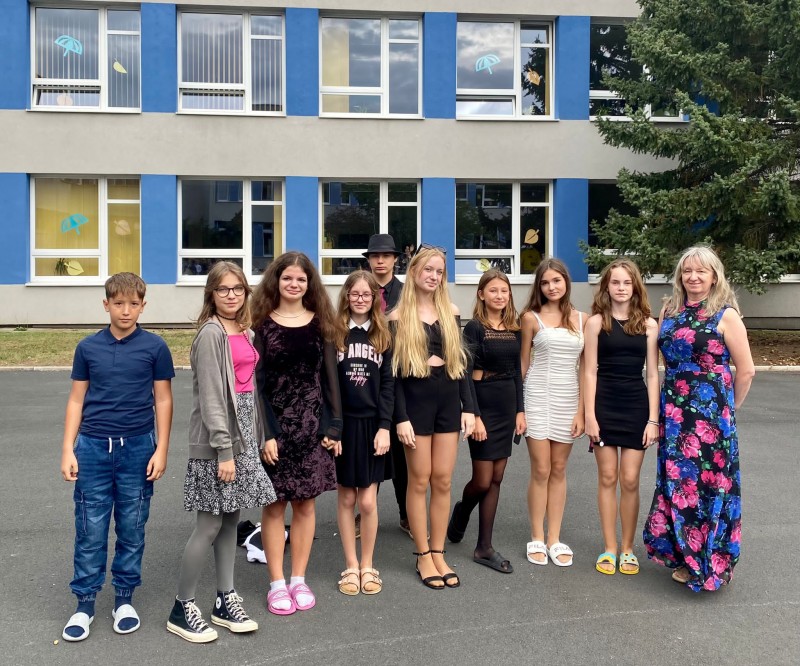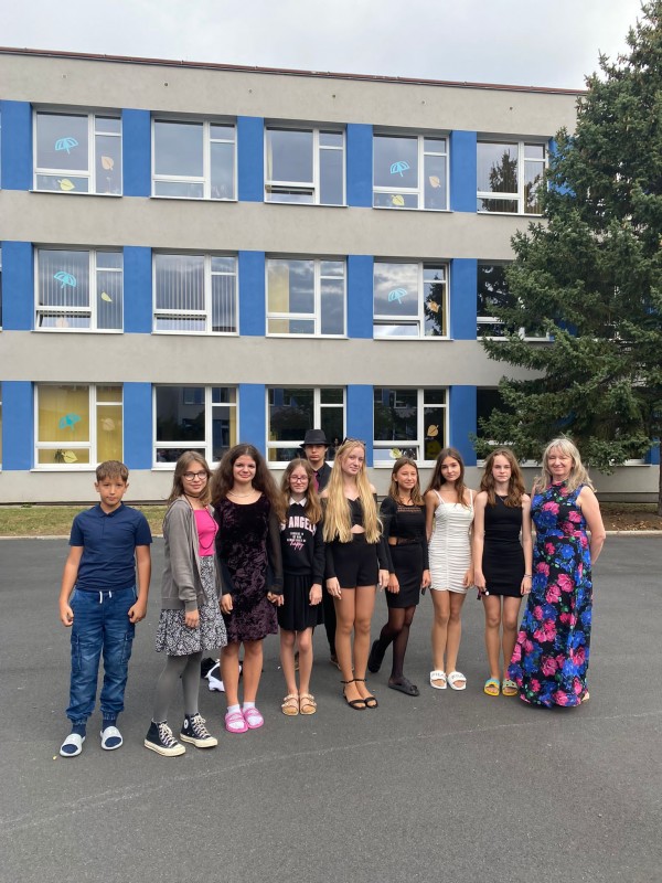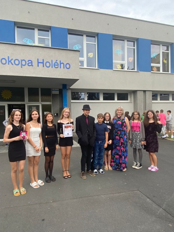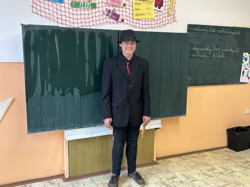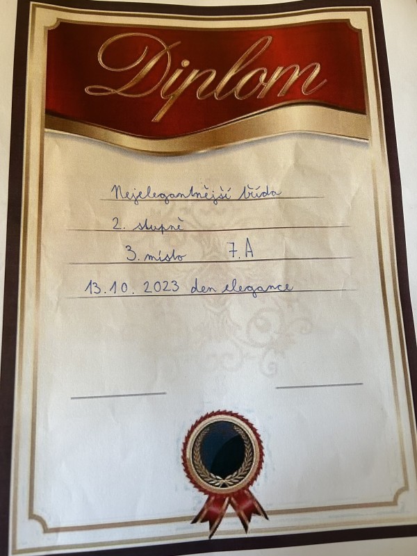 Na pátek 13. října vyhlásila 8.B na naší škole Den elegance. Devět dětí z naší třídy se zapojilo a přišlo v krásném, elegantním oblečení. Umístili jsme se na 3. místě a dostali diplom a sladkou odměnu. Hodinu slohu jsme potom věnovali povídání o etiketě - zásadách slušného chování.