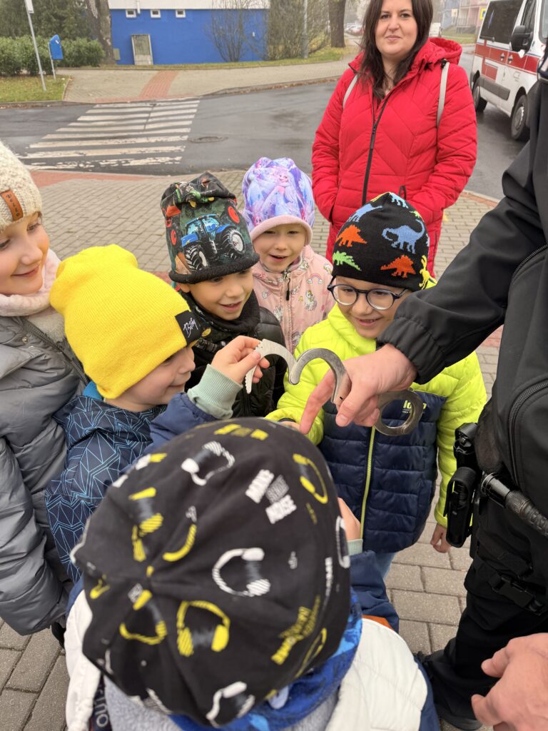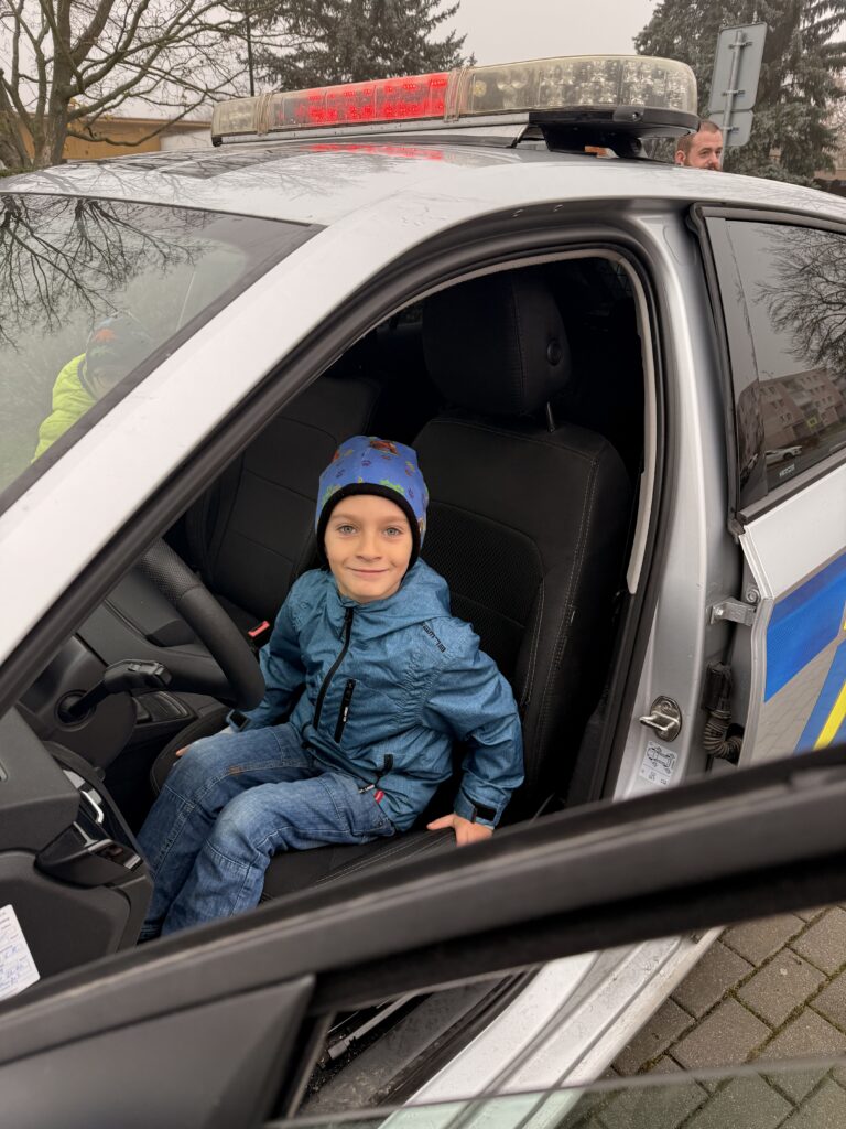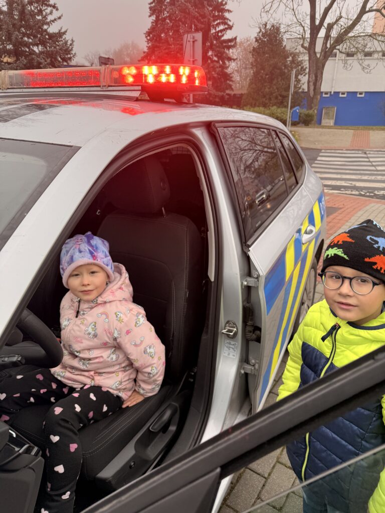 Cestou do knihovny 📚 děti potkaly Policii ČR 👮‍♂️👮‍♀️ a dozvěděly se spoustu zajímavostí o tom, co má správný policista u sebe 🦺📻. Mohly si také vyzkoušet policejní auto 🚓 a viděly i blikající majáky 🔵🔴 a slyšely houkačku 📣 – to byl velký zážitek!