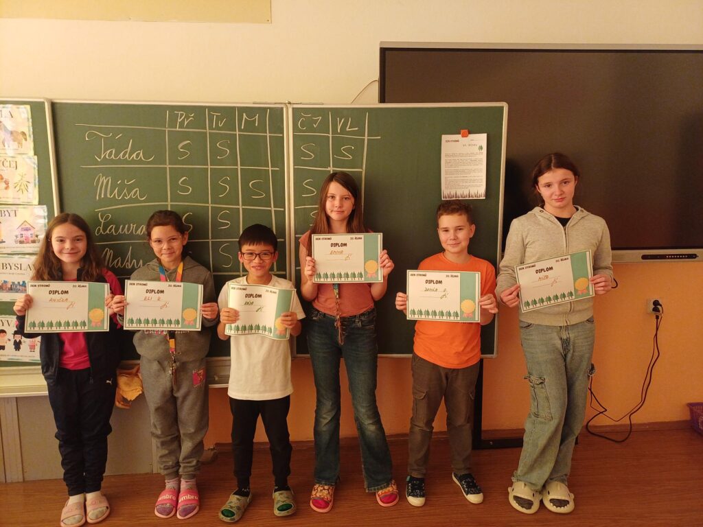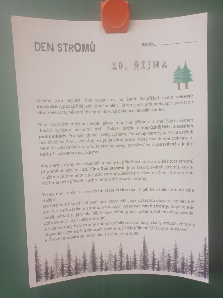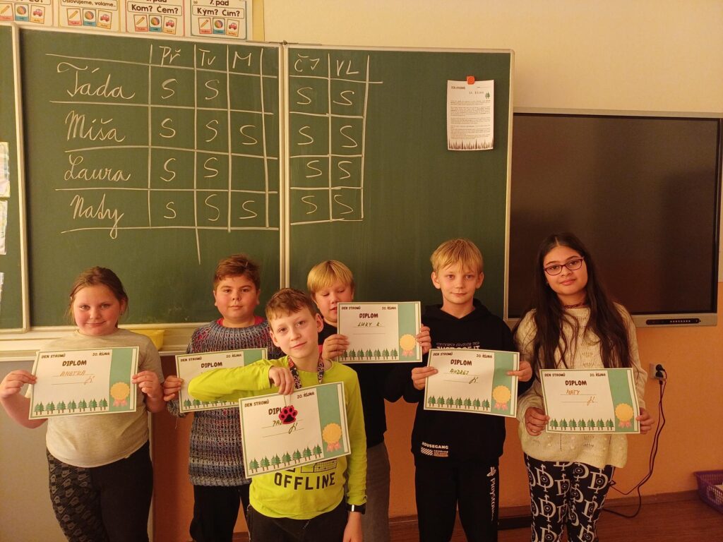 Den stromů jsme oslavili venku i ve třídě. Pomocí QR kódů jsme hledali informace o stromech, řešili křížovky, v přírodovědě poznávali druhy stromů, v matematice měřili a počítali, ve vlastivědě zjišťovali, jaké stromy rostou v našem kraji, v českém jazyce psali krátké texty a v tělocviku si zahráli hry v přírodě. Pracovali jsme ve skupinách a zjistili, jak důležité jsou pro nás stromy. 🌿