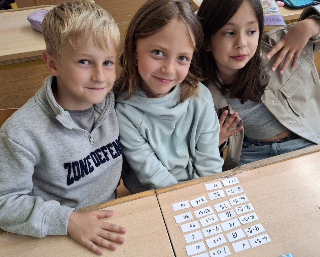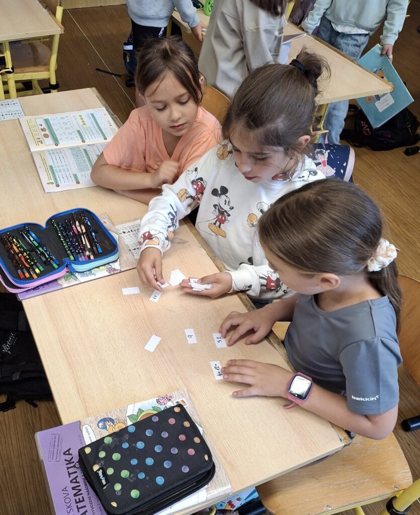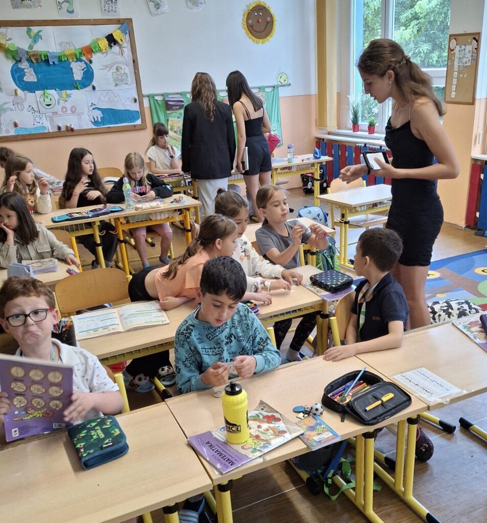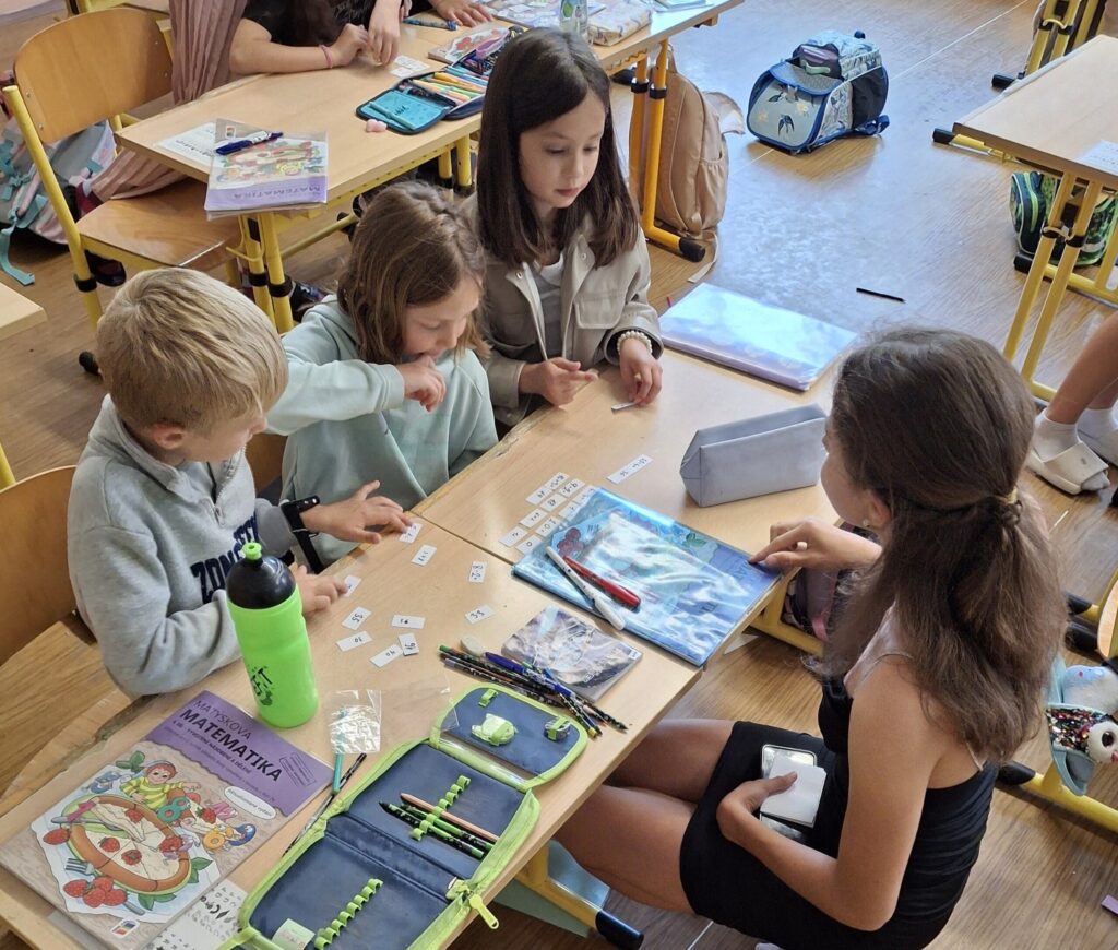 Holky z devítky si na chvíli vyzkoušely roli paní učitelky a stouply si před tabuli místo ní. Druháky to bavilo a "nové paní učitelky" taky.
