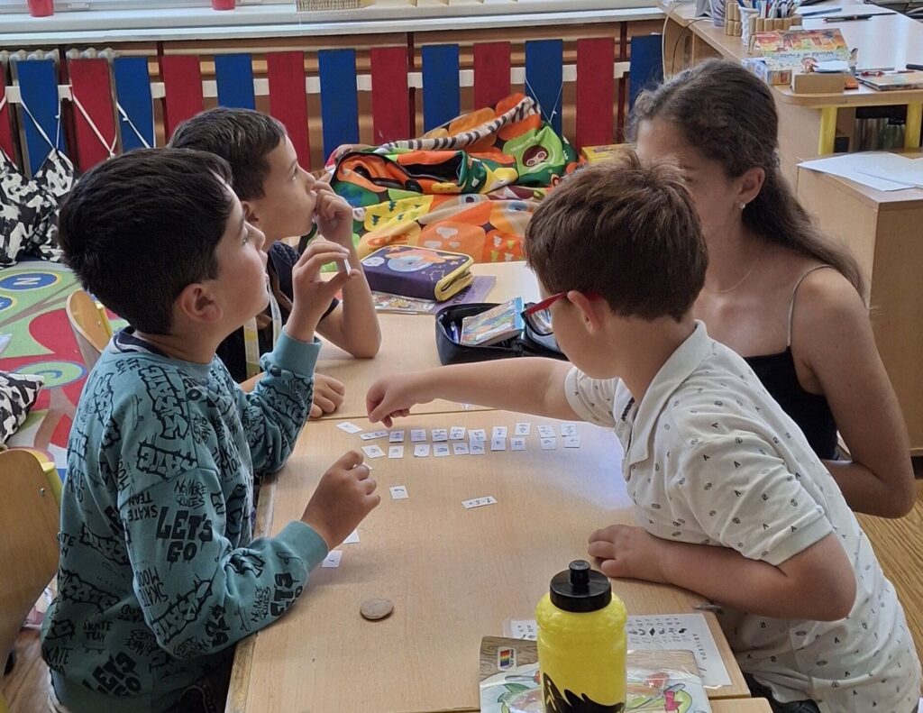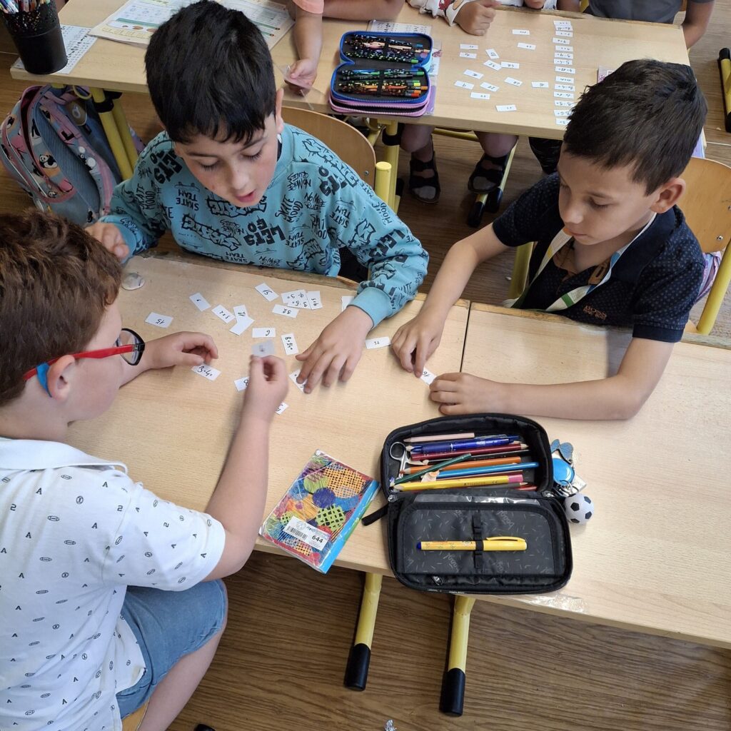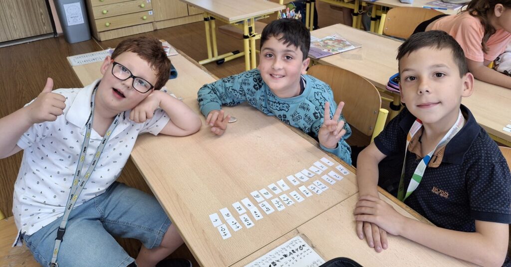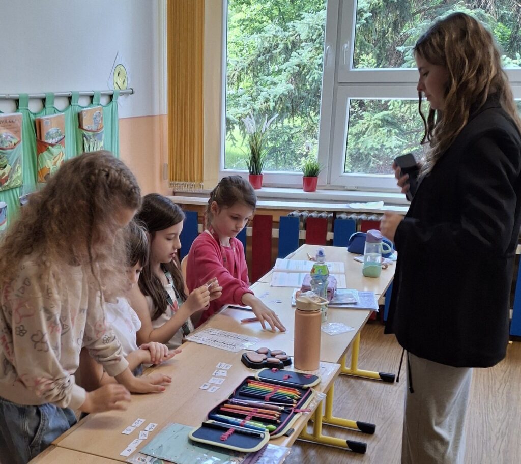 Holky z devítky si na chvíli vyzkoušely roli paní učitelky a stouply si před tabuli místo ní. Druháky to bavilo a "nové paní učitelky" taky.