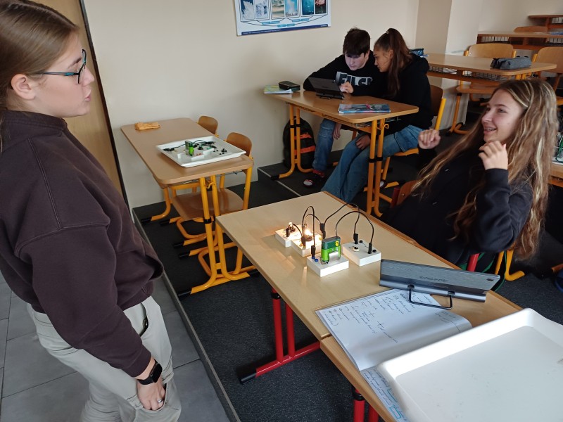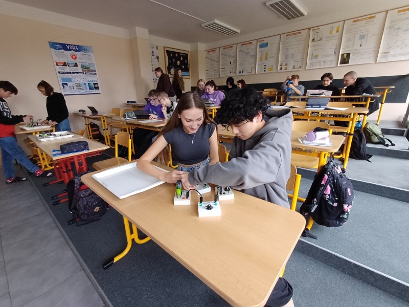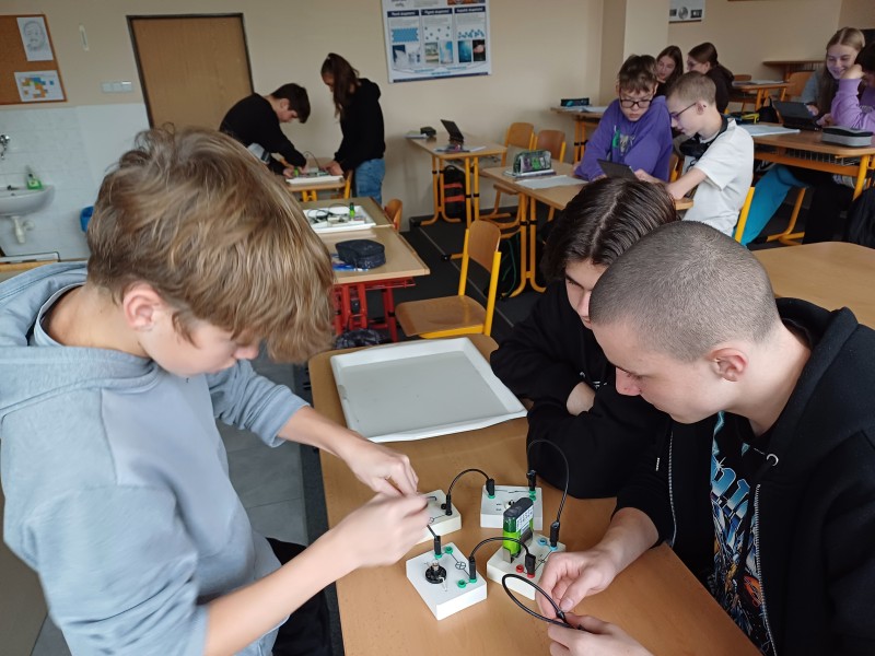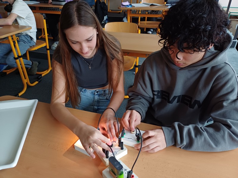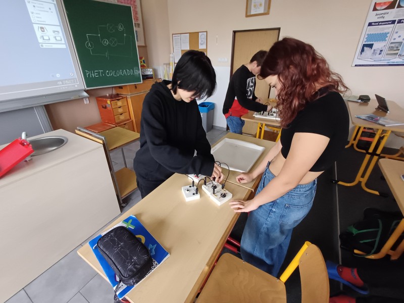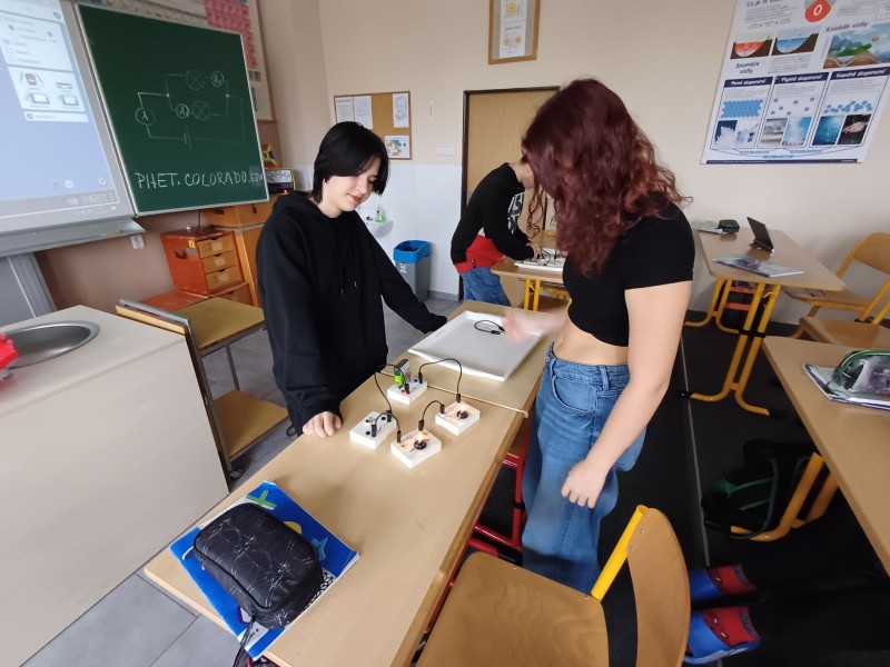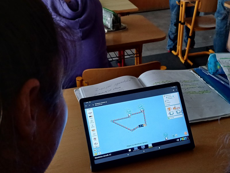 V hodině fyziky jsme při práci s tablety využili digitální laboratoř a sestavili jsme si různé elektrické obvody, zapojili měřicí přístroje a změřili el. proud a el. napětí. Zcela neplánovaně se nám podařilo zjistit, co je to zkrat, kdy k němu dochází a jaké nebezpečí hrozí při vzniku zkratu. Elektrické obvody jsme zapojili i prakticky a vyzkoušeli si, jak se chovají žárovky v sériovém a jak v paralelním zapojení.