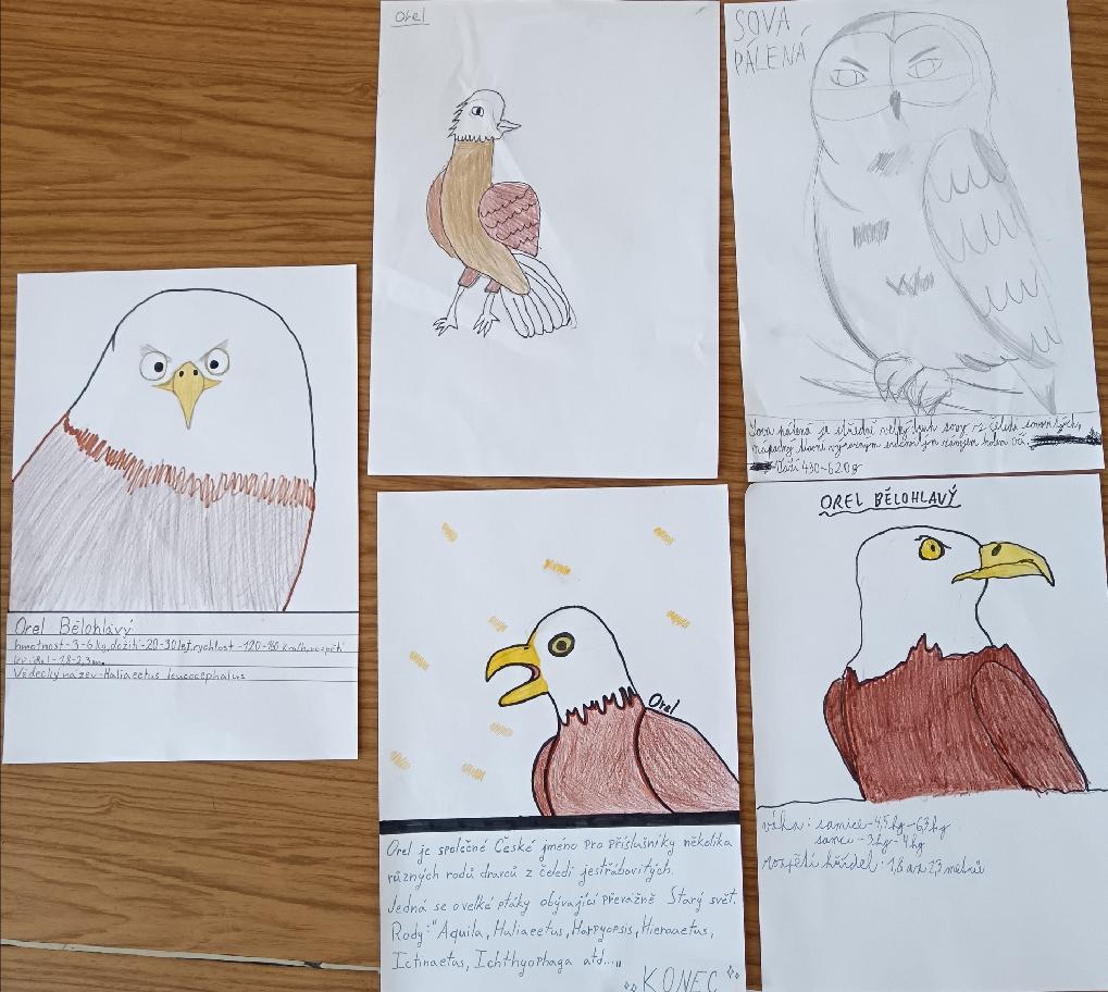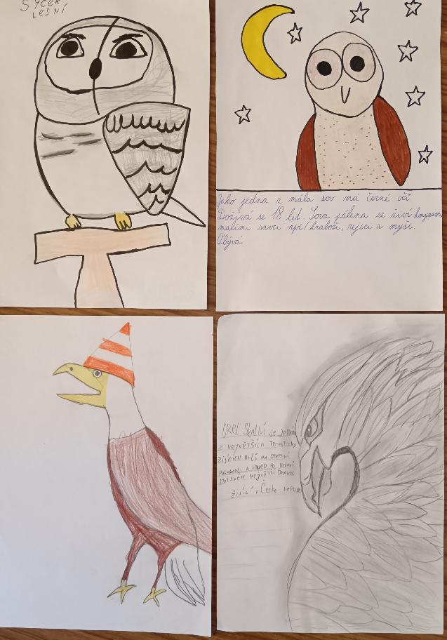 Z Lednice k nám do školy přijela skupina sokolníků. Přivezli s sebou různé dravce, o kterých nám zajímavě vyprávěli, a předvedli, co umí. Po skončení akce jsme si ještě o nich ve třídě vyprávěli a taky jsme je nakreslili.