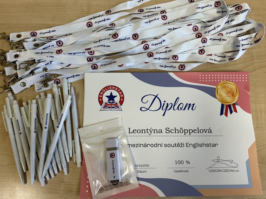 ENGLISHSTAR je název mezinárodní jazykové soutěže v anglickém jazyce. V letošním roce se jí v České republice zúčastnilo 329 škol a 7940 soutěžících. Mezi nimi bylo i našich 13 odvážných dětí. Díky nim se naše škola dostala na 12. místo ve své skupině s průměrnou úspěšností 86,15% (skupiny jsou podle počtu zúčastněných žáků, aby byly výsledky porovnatelné). Nejlepšího výsledku dosáhla Leontýna Schöppelová, která získala plný počet bodů. Všichni soutěžící dostali diplom, propisku a klíčenku s logem soutěže, Leontýnka navíc ještě USB klíč s logem soutěže. Všem moc blahopřejeme a děkujeme za reprezentaci školy.