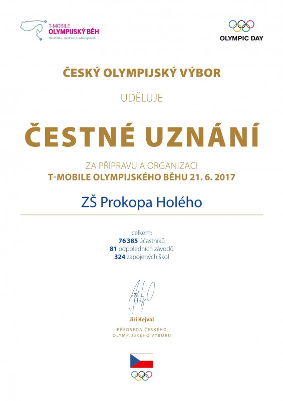 Naše škola získala od Olympijského výboru Čestné uznání za organizaci T- mobile Olympijského běhu, který se konal 21.6.2017.