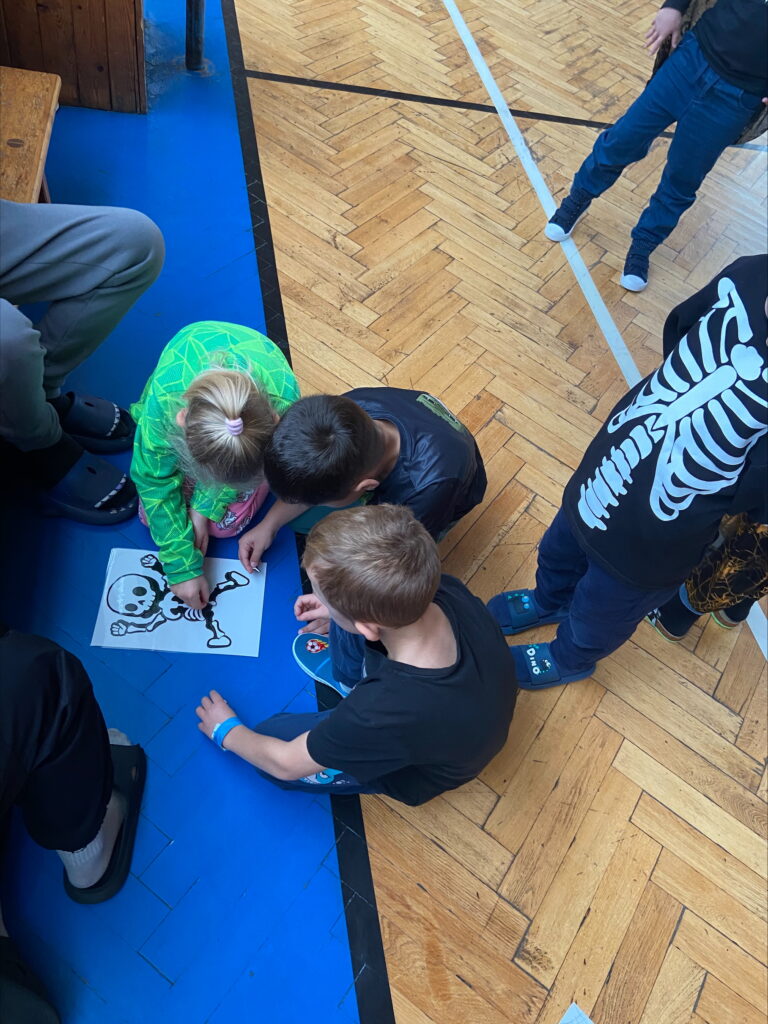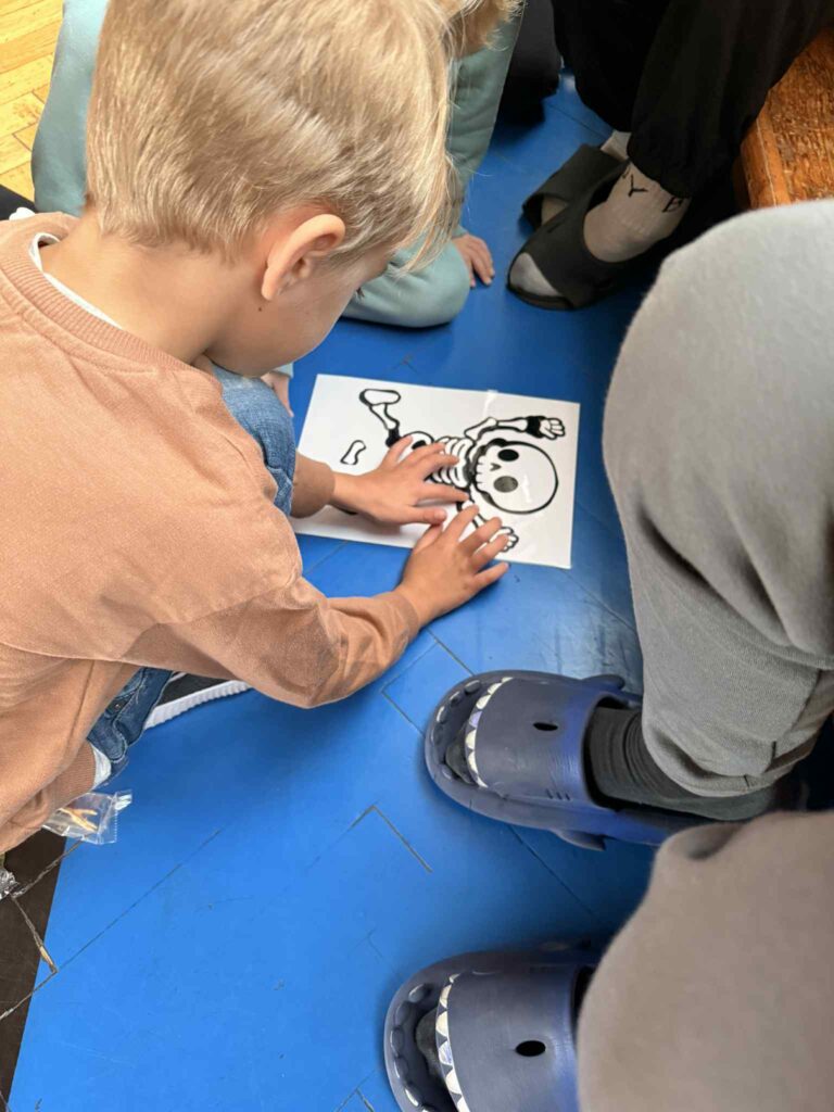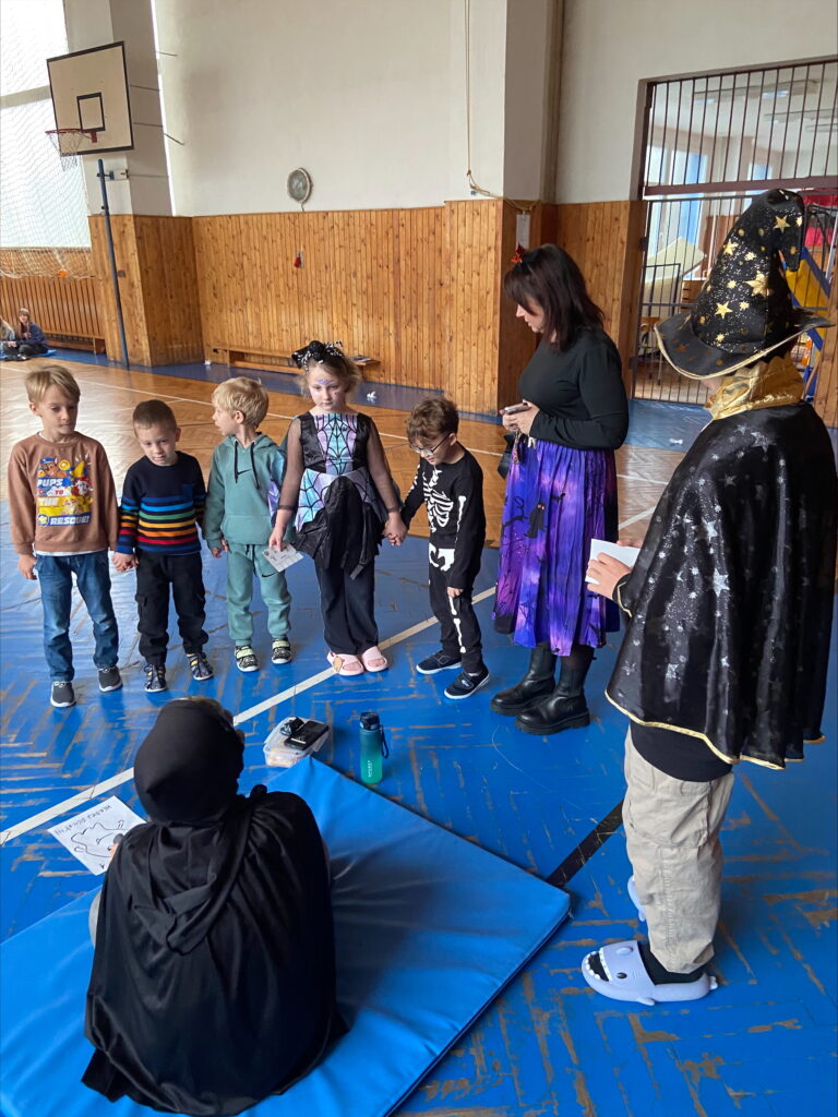 Malí předškoláci procházeli jednotlivá stanoviště, kde je čekaly různé hry, úkoly a výzvy, od skládání kostlivce až po poznávání tajemných předmětů. Všichni si to užili s úsměvem, i když občas se někdo trochu bál!