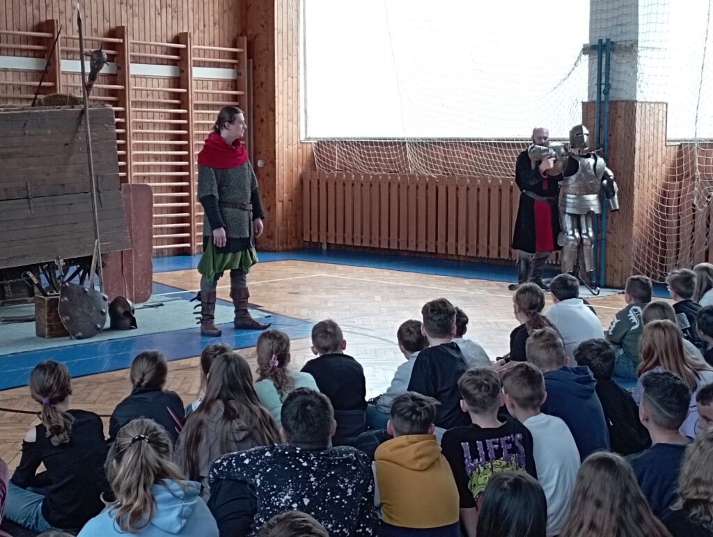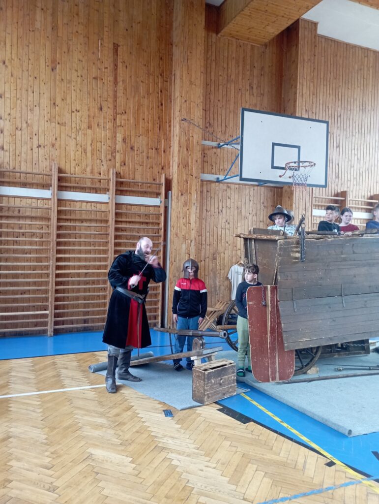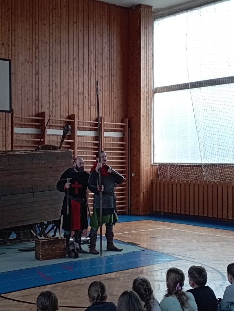Naše tělocvična se ve středu proměnila v bitevní pole středověké historie. Zavítala k nám skupina historického šermu Pernštejni, která si pro žáky připravila poutavé představení "Jak válčili husité".