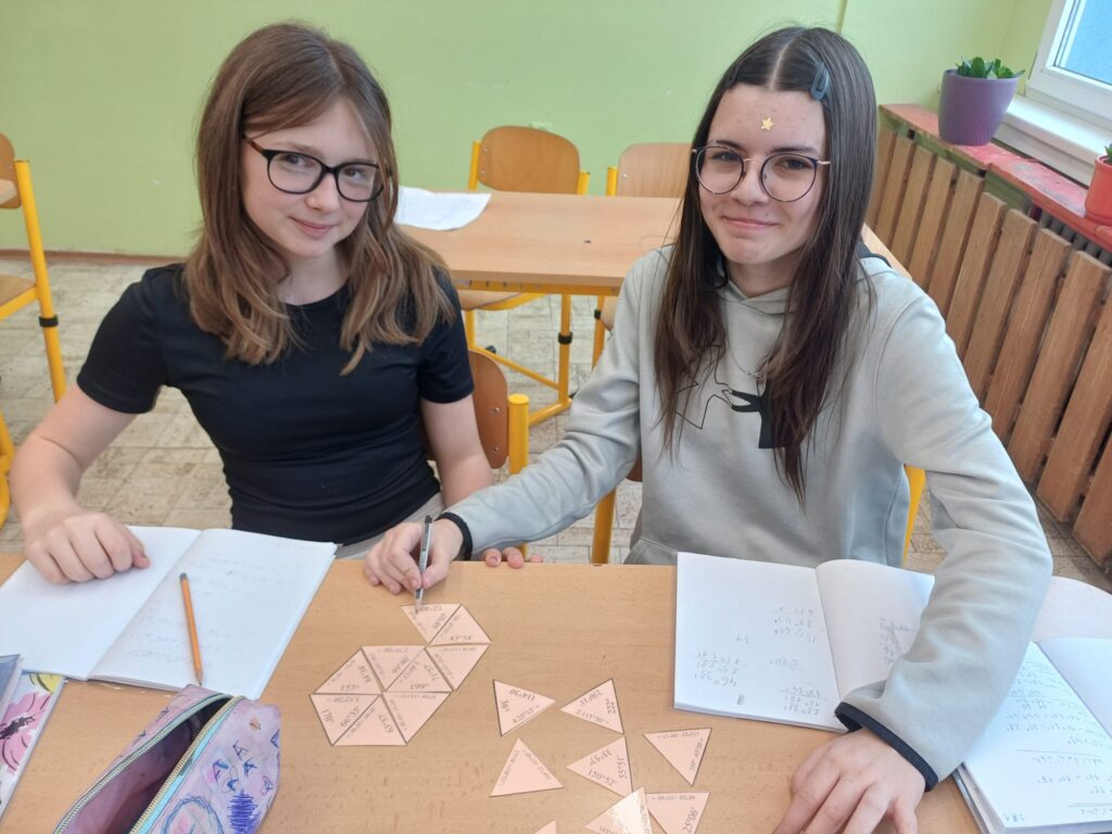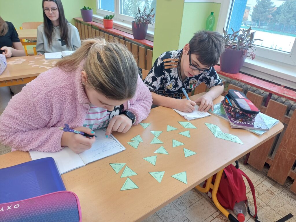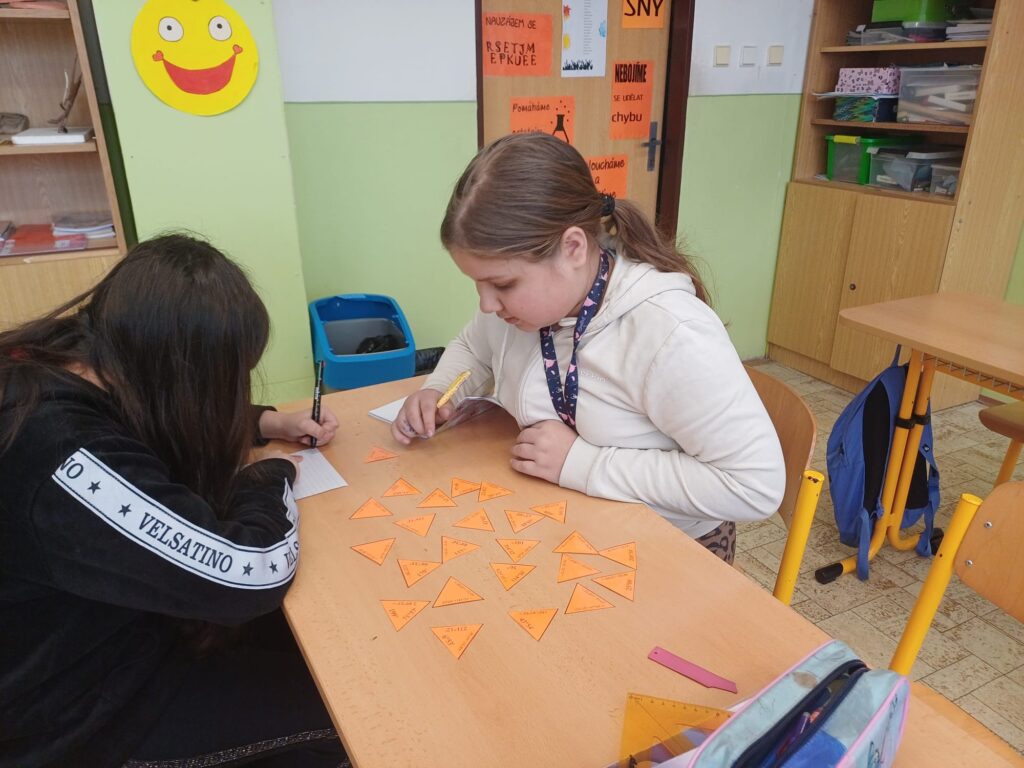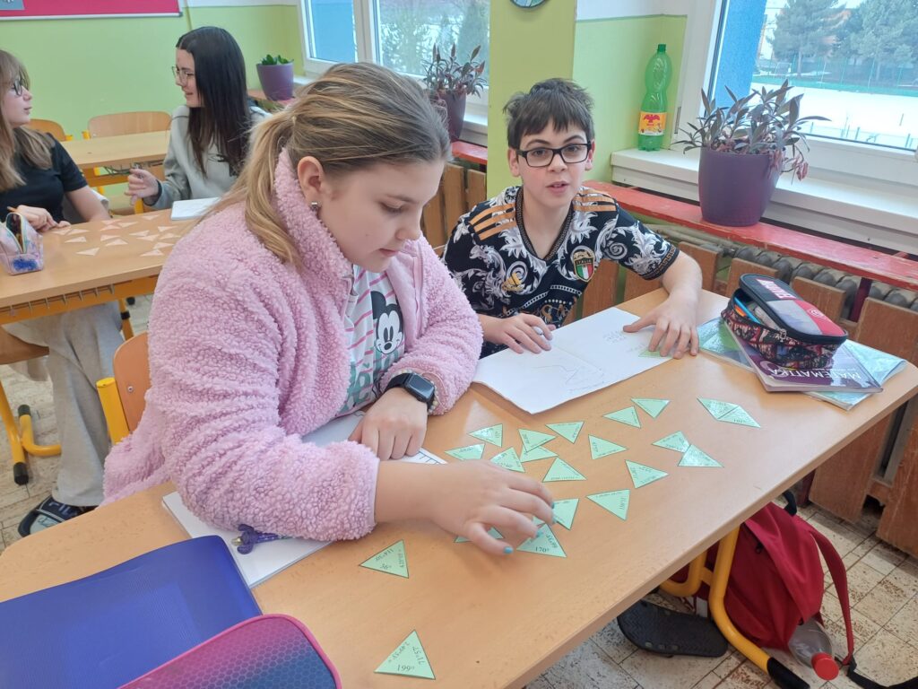 V hodině matematiky si žáci procvičovali sčítání a odčítání úhlů hravou formou. Pracovali s matematickou hrou trimino, ve které správně spojovali dílky podle vypočítaných výsledků.