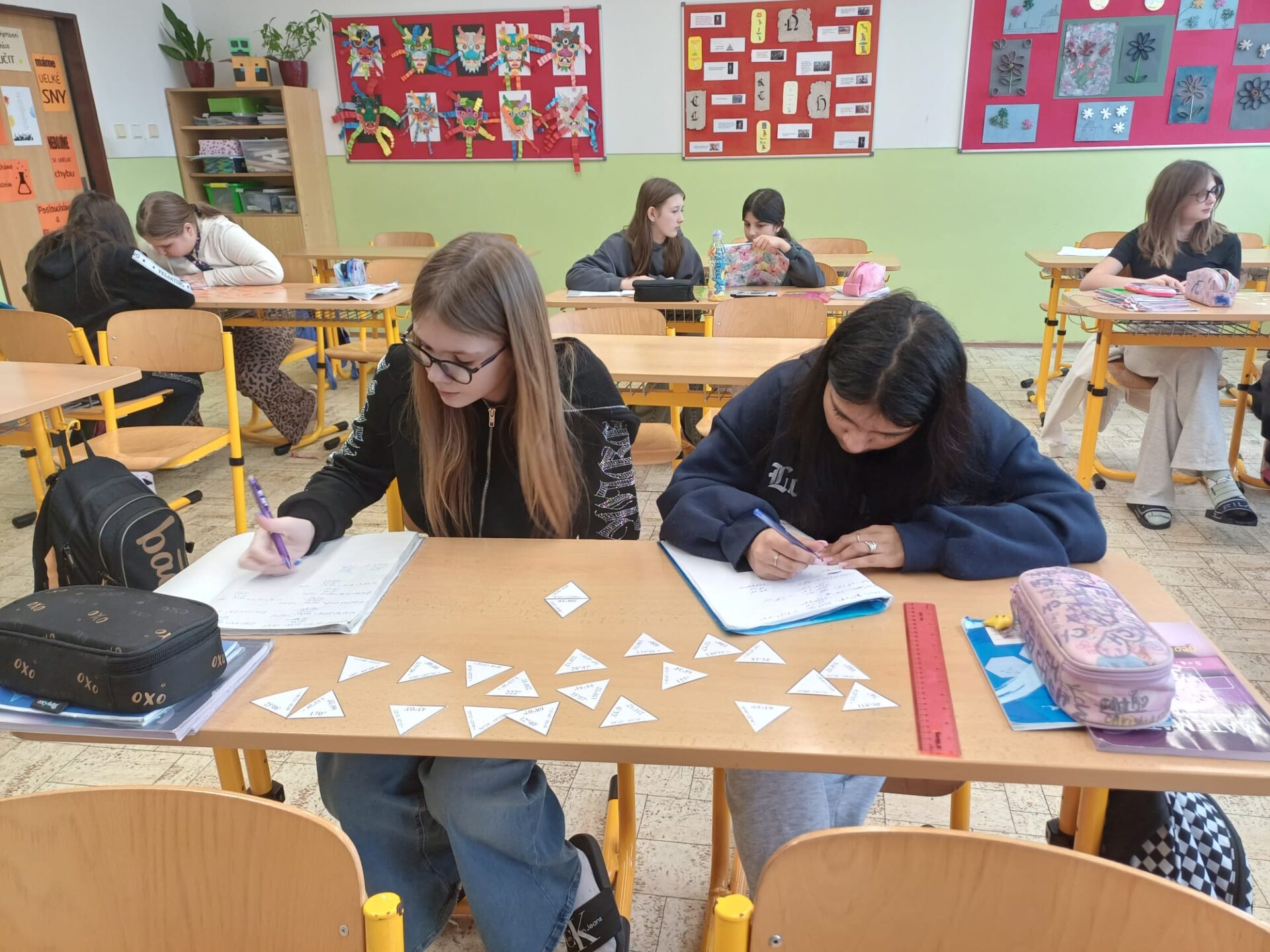 V hodině matematiky si žáci procvičovali sčítání a odčítání úhlů hravou formou. Pracovali s matematickou hrou trimino, ve které správně spojovali dílky podle vypočítaných výsledků.