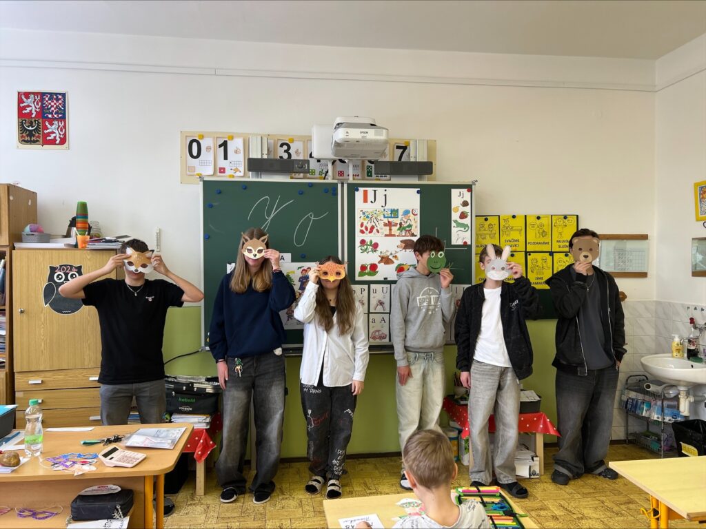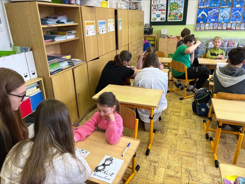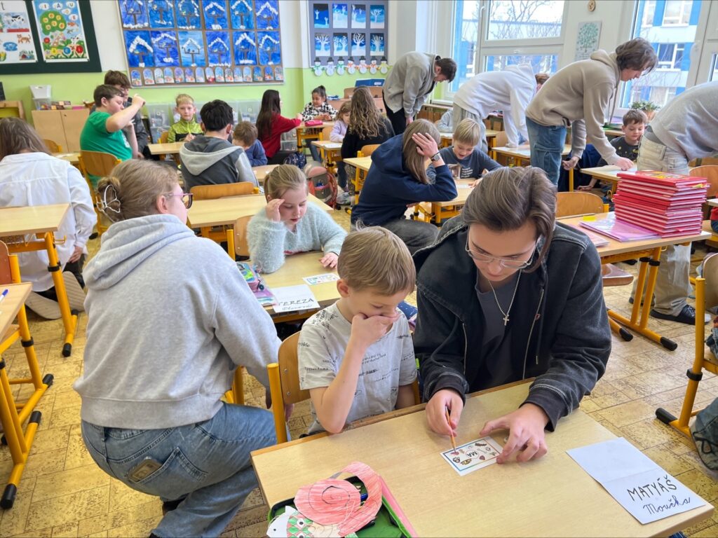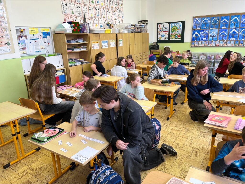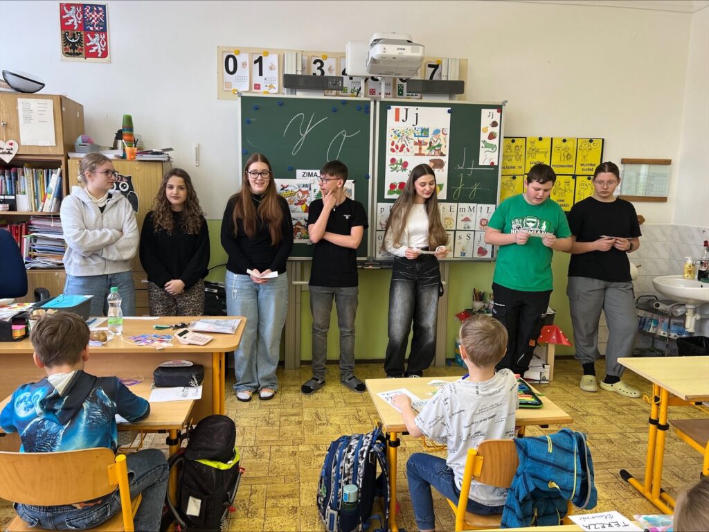 V pátek nás při příležitosti Světového dne mateřštiny navštívili žáci z 9. D. Přečetli nám kousek pohádky o zvířátkách nejprve anglicky, pak německy, a nakonec jsme je uprosili, že ji chceme česky, protože pak jsme jí teprve porozuměli. Počítali jsme zvířátka, malovali je a procvičovali slabiky při hře domino. Bylo to prima setkání.