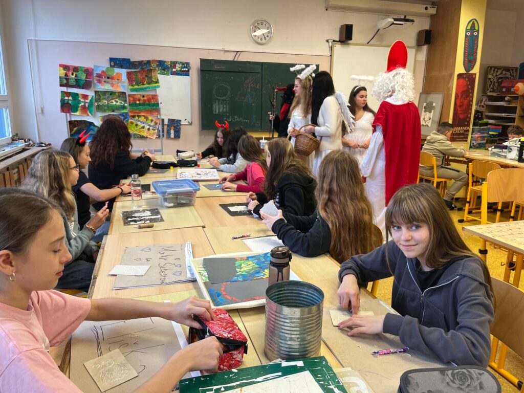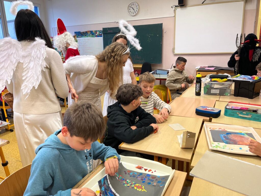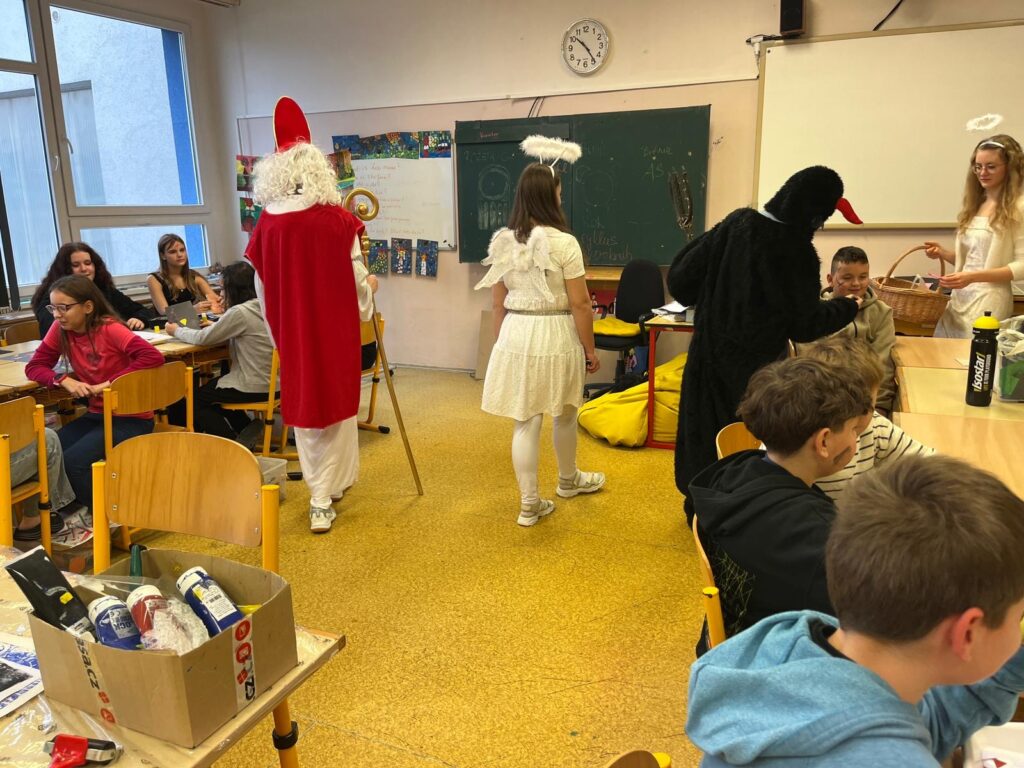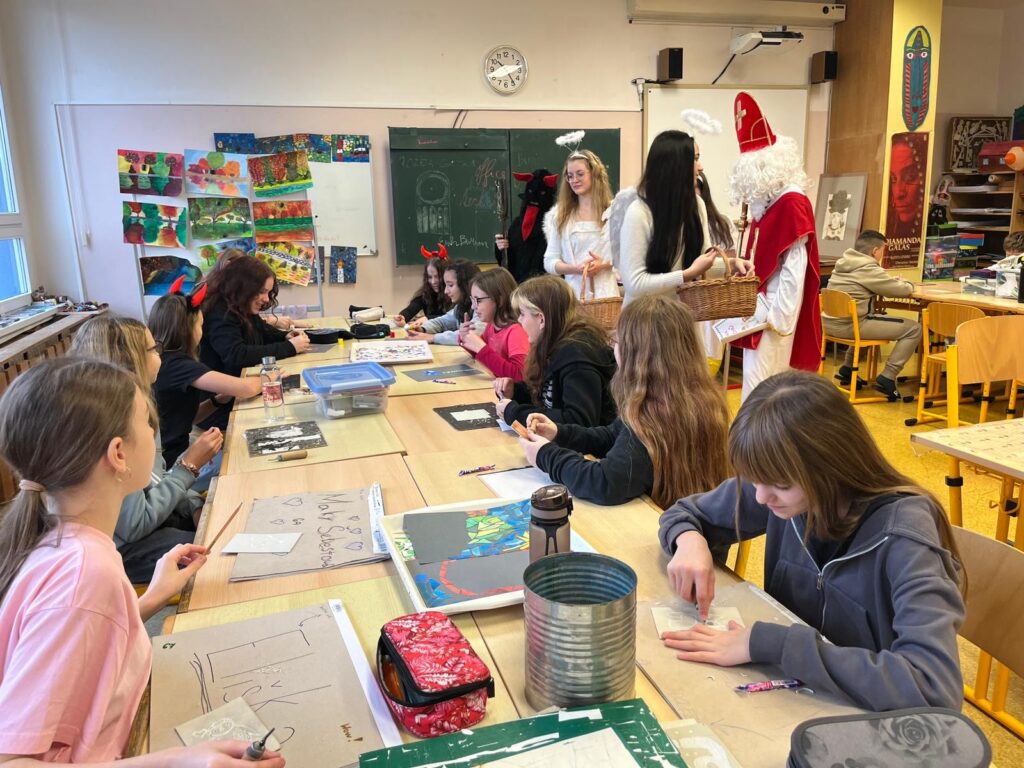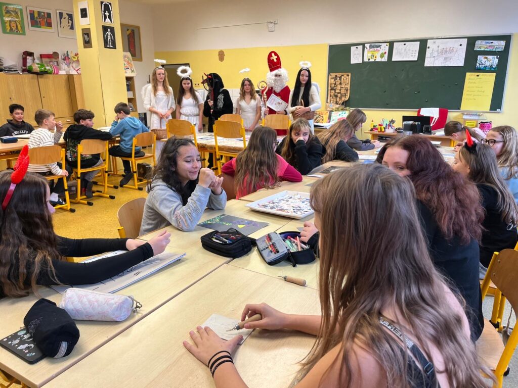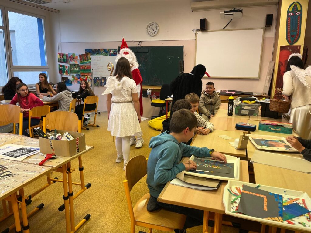 Dnes naši školu navštívil Mikuláš s anděly a čertem. Zavítali také do naší třídy, kde si Mikuláš přečetl, kdo byl celý rok hodný a kdo má ještě co zlepšovat. Hodné děti dostaly pochvalu i malou sladkost od andělů, zatímco čert občas zachřestil řetězem u těch, kteří zlobí, vše ale v dobré náladě.