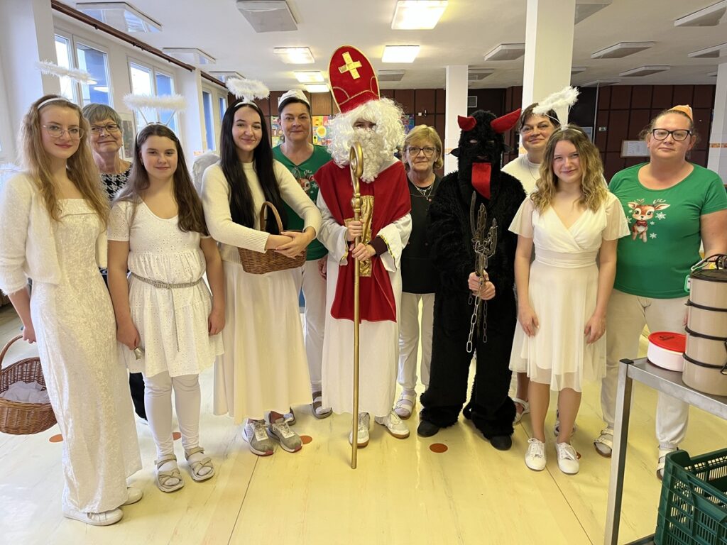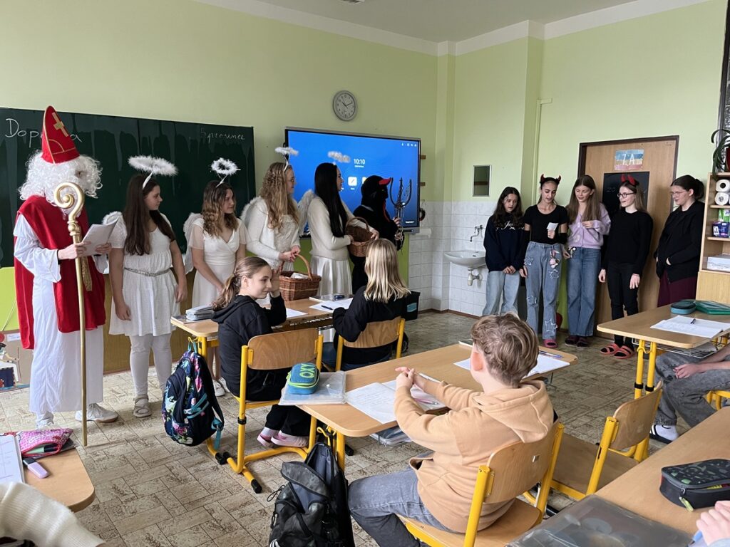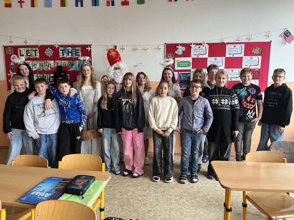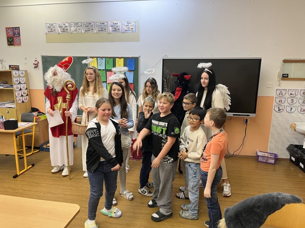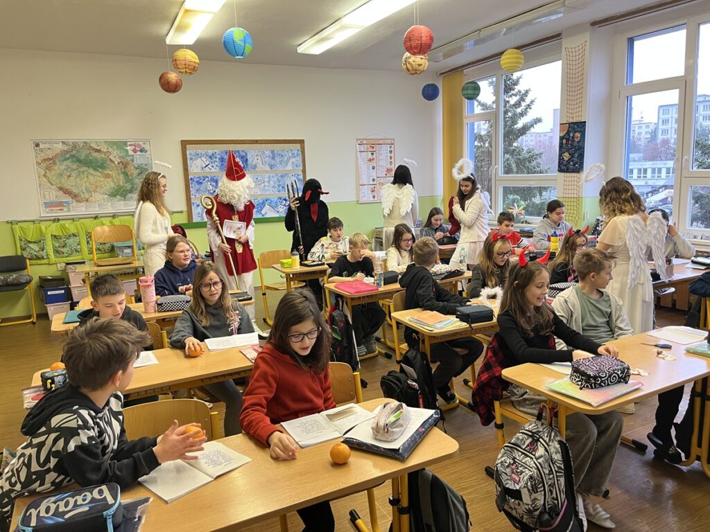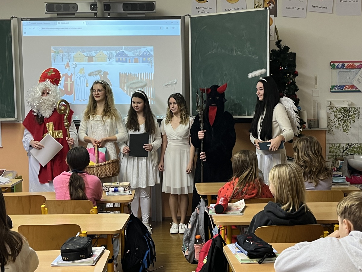 Do školy dorazil Mikuláš. Dětem se hezky představil, vysvětlil, odkud pochází a proč je mezi lidmi oblíbený. Jeho pomocník čert moc nezlobil, andělky si ho hlídaly. Hodné děti byly pochválené, zlobidla dostala šanci se polepšit.