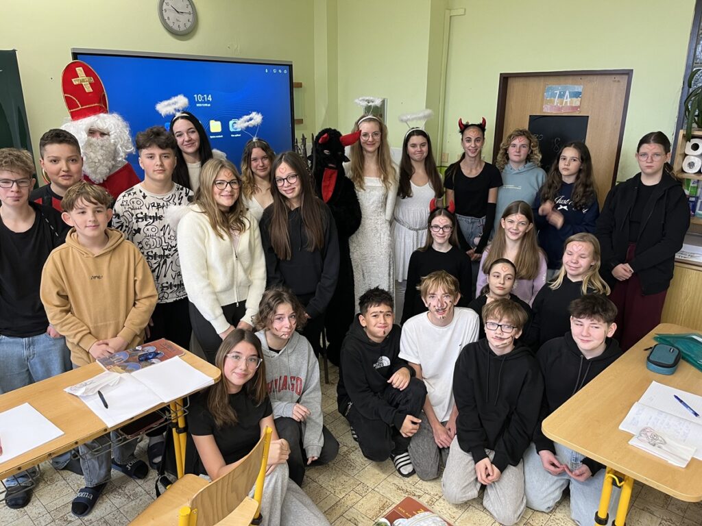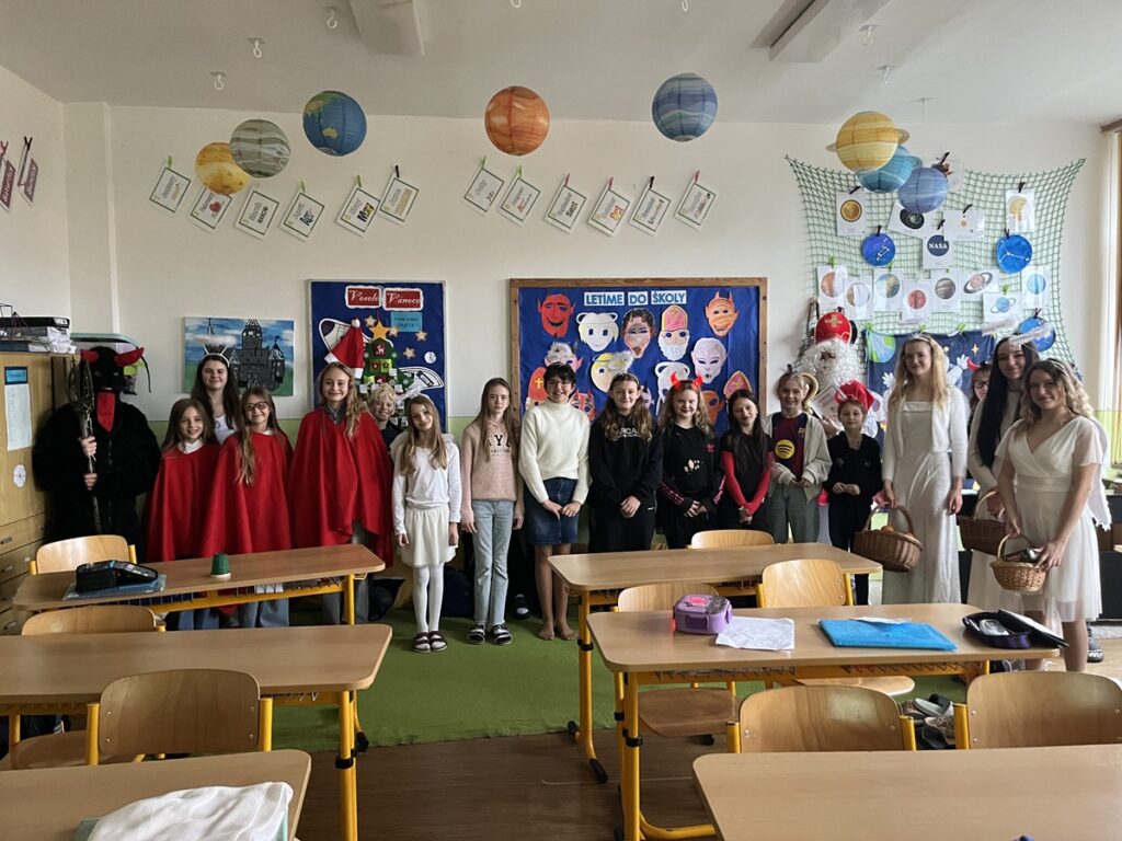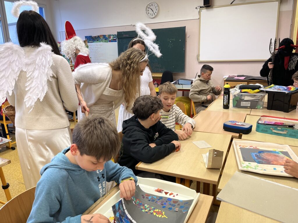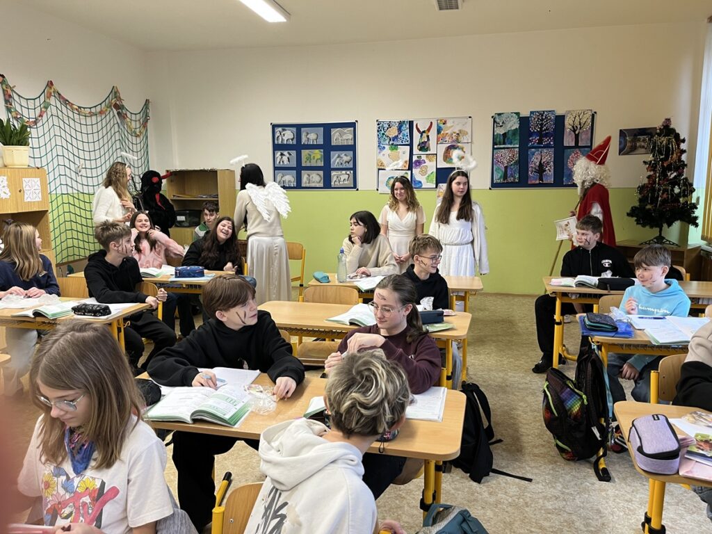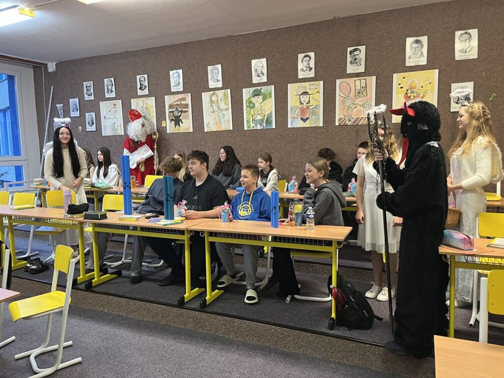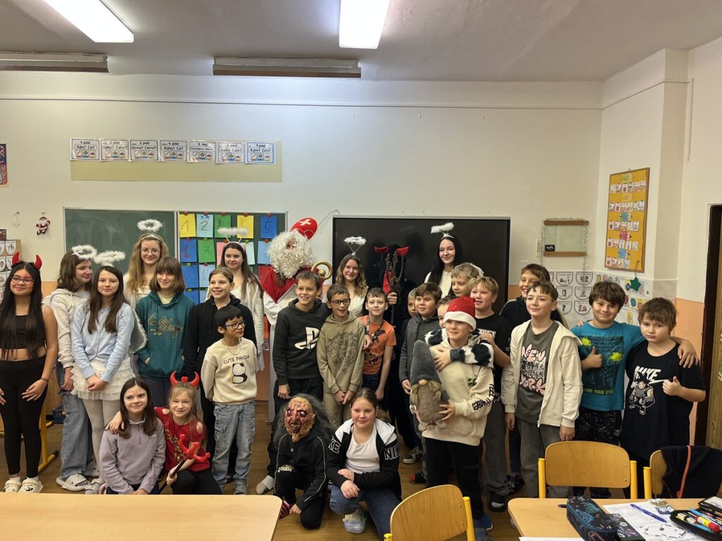 Do školy dorazil Mikuláš. Dětem se hezky představil, vysvětlil, odkud pochází a proč je mezi lidmi oblíbený. Jeho pomocník čert moc nezlobil, andělky si ho hlídaly. Hodné děti byly pochválené, zlobidla dostala šanci se polepšit.