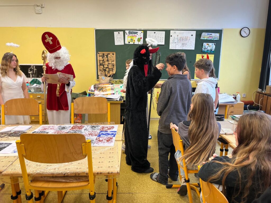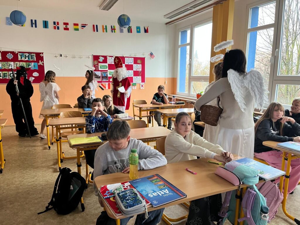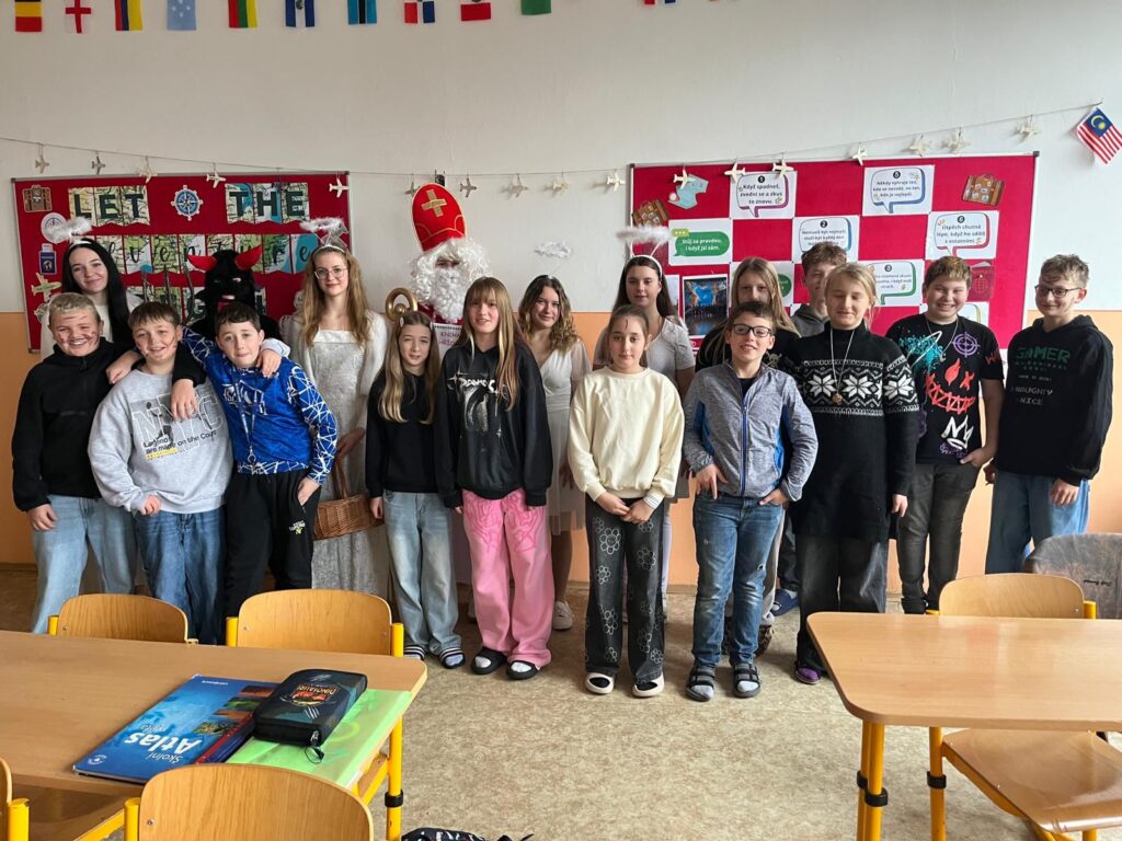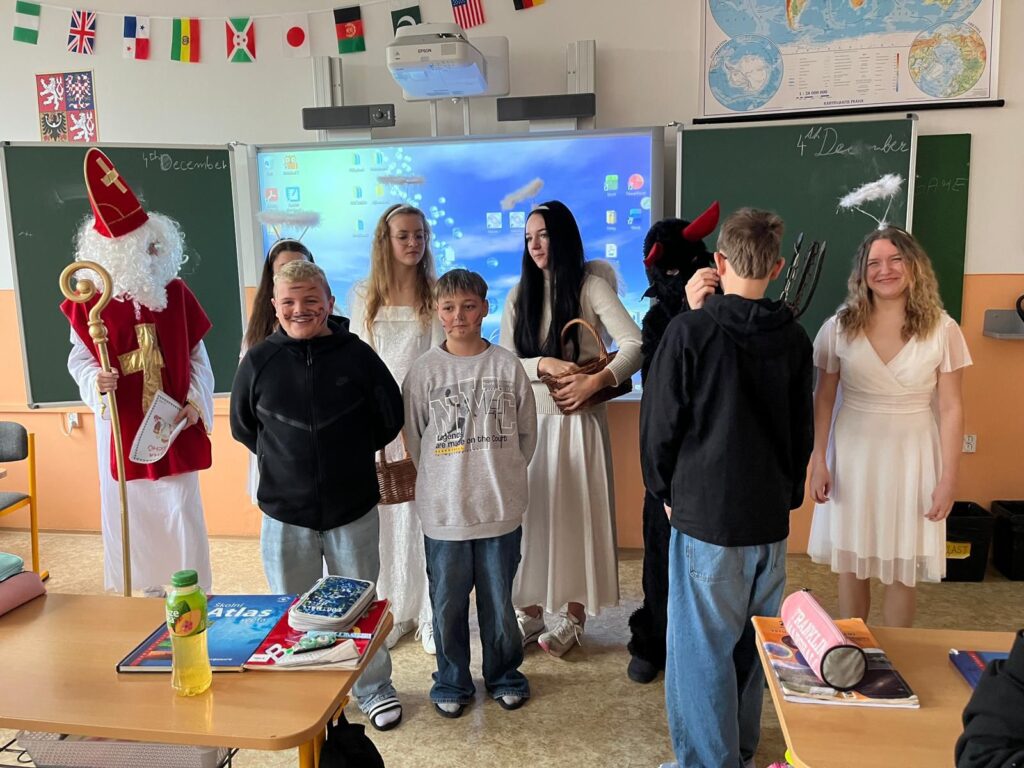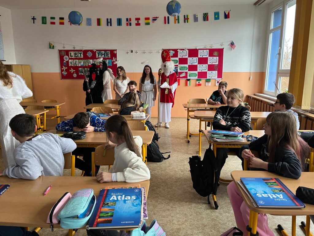 V pátek navštívil naši třídu 6.B svatý Mikuláš se svojí tradiční družinou andělů a čerta. Děti si připravily básničky a písničky, za které byly odměněny sladkostmi. Celá návštěva proběhla v příjemné a veselé atmosféře a přinesla do třídy příjemnou předvánoční náladu.