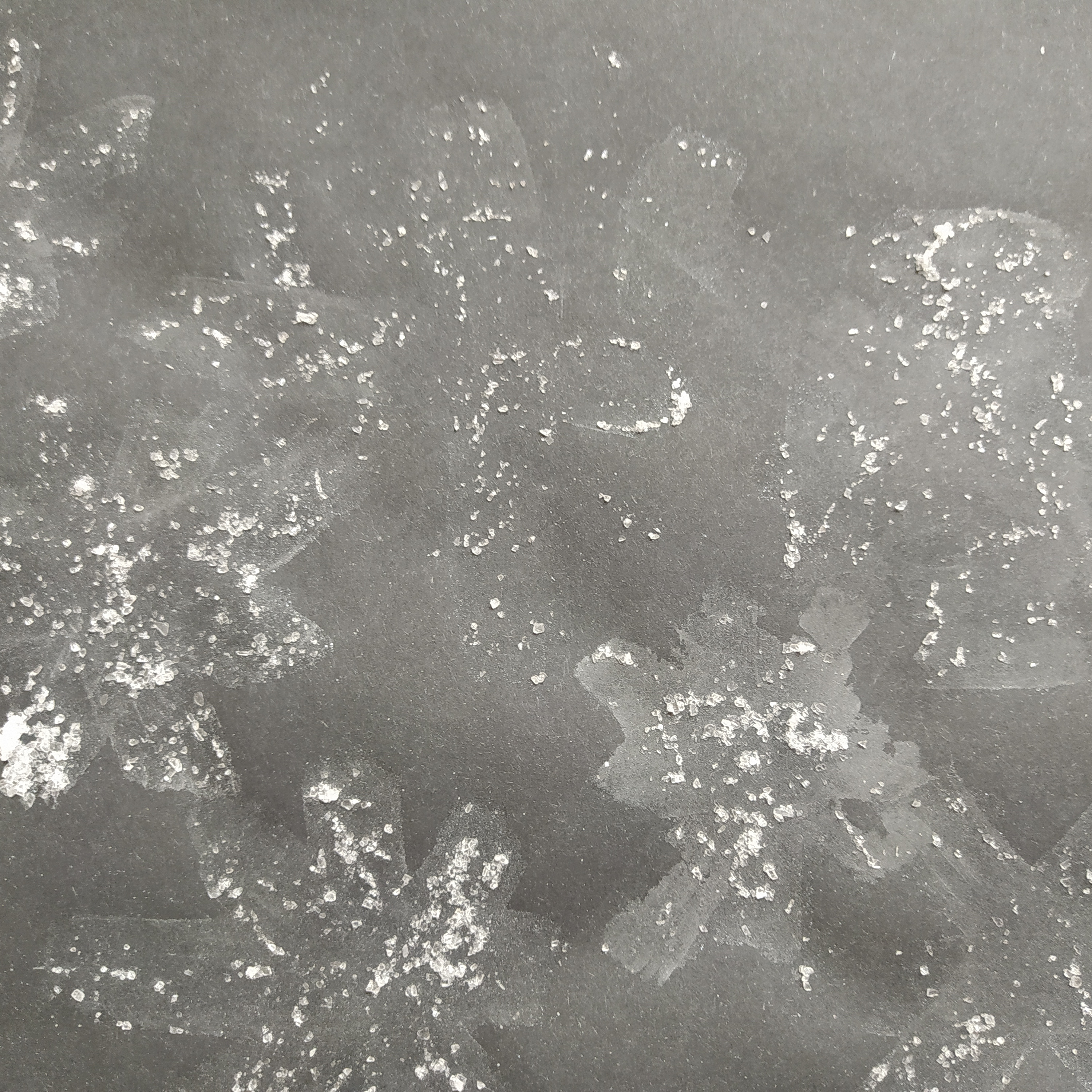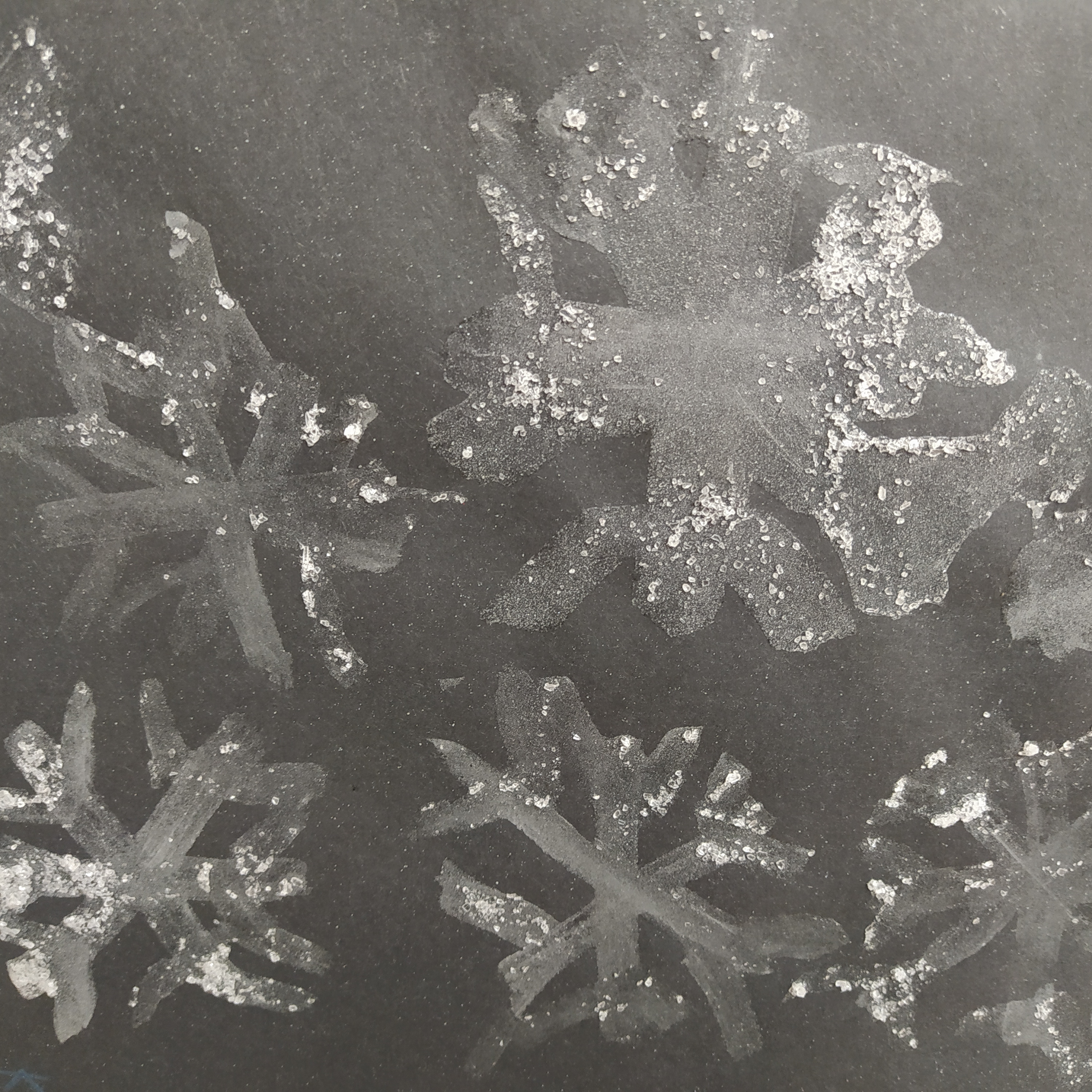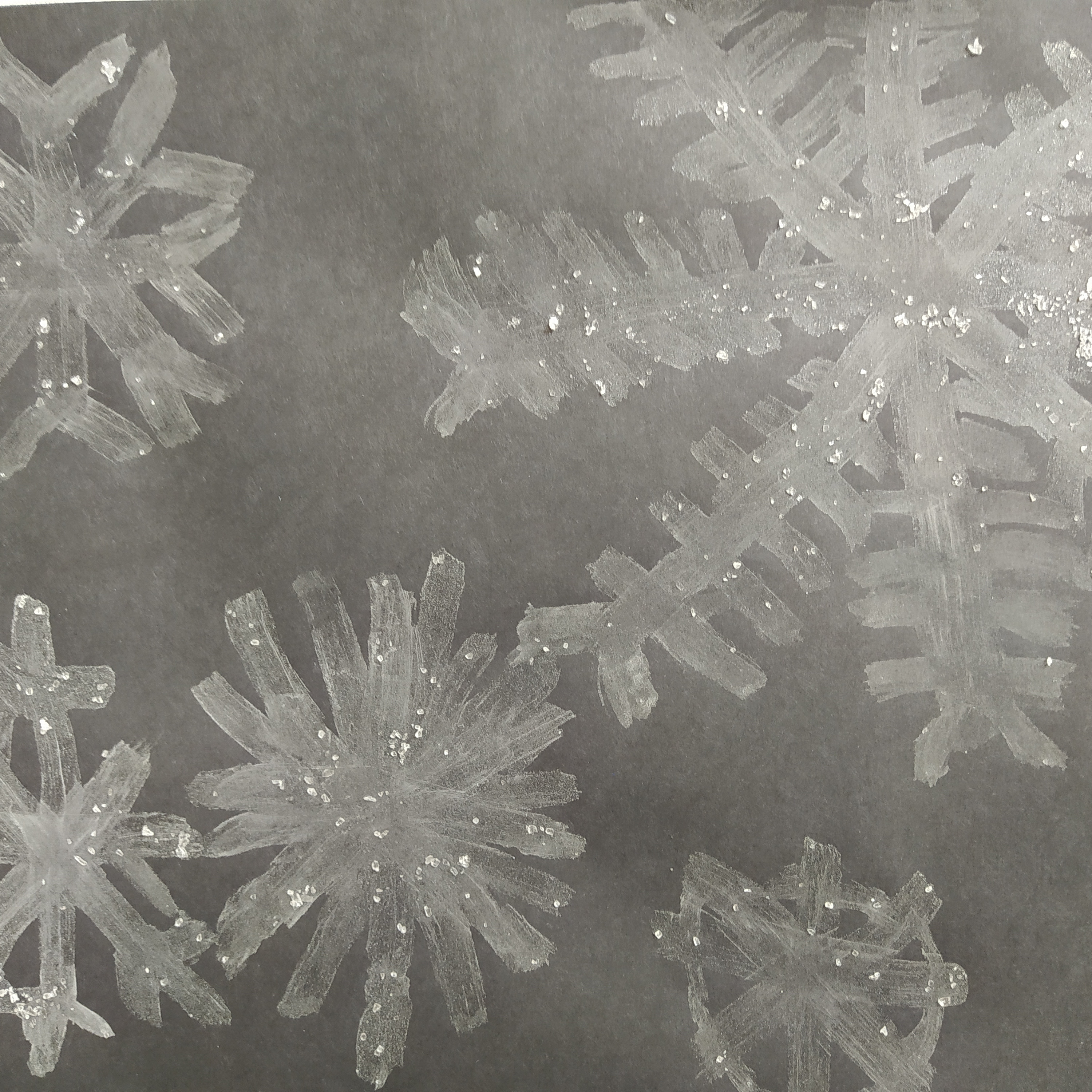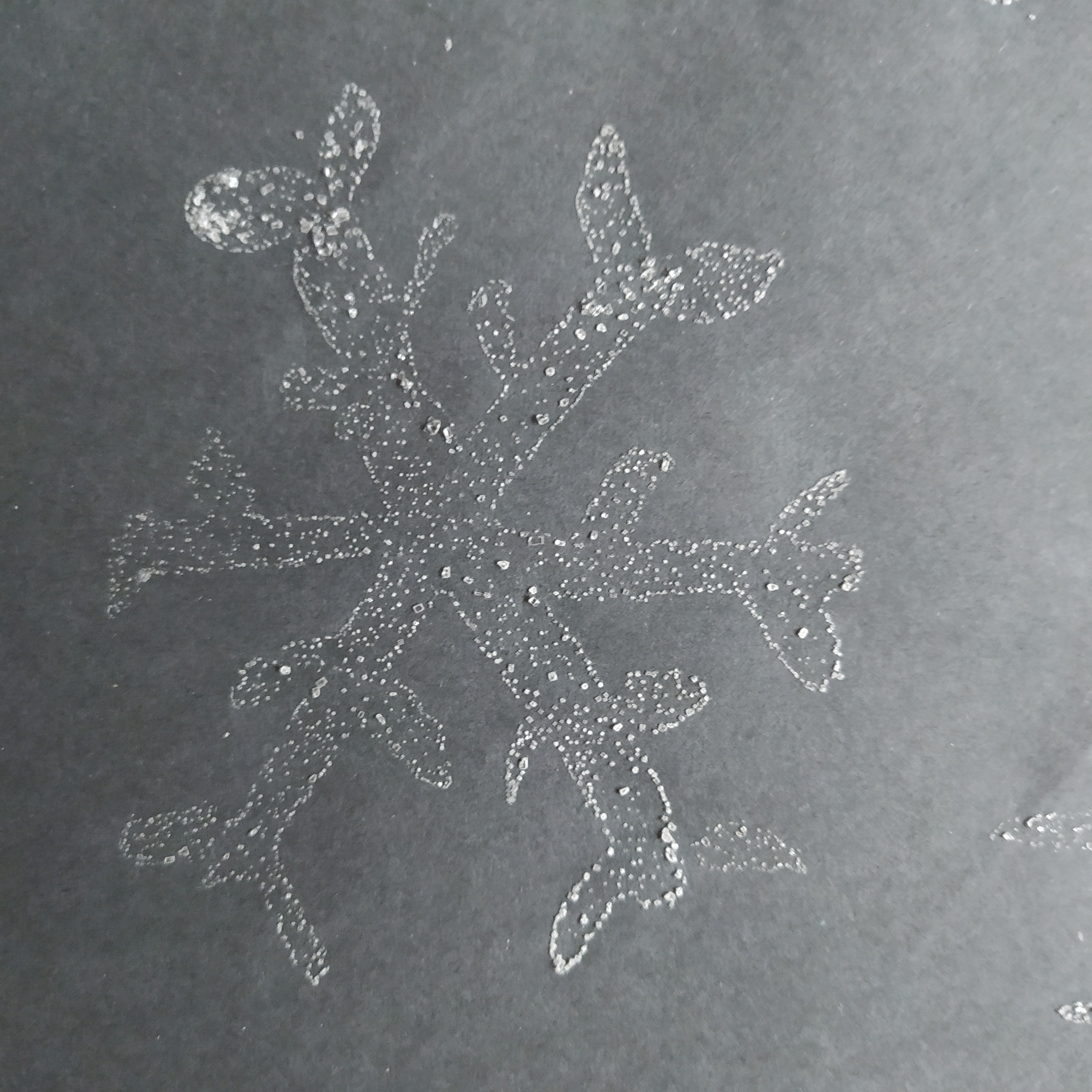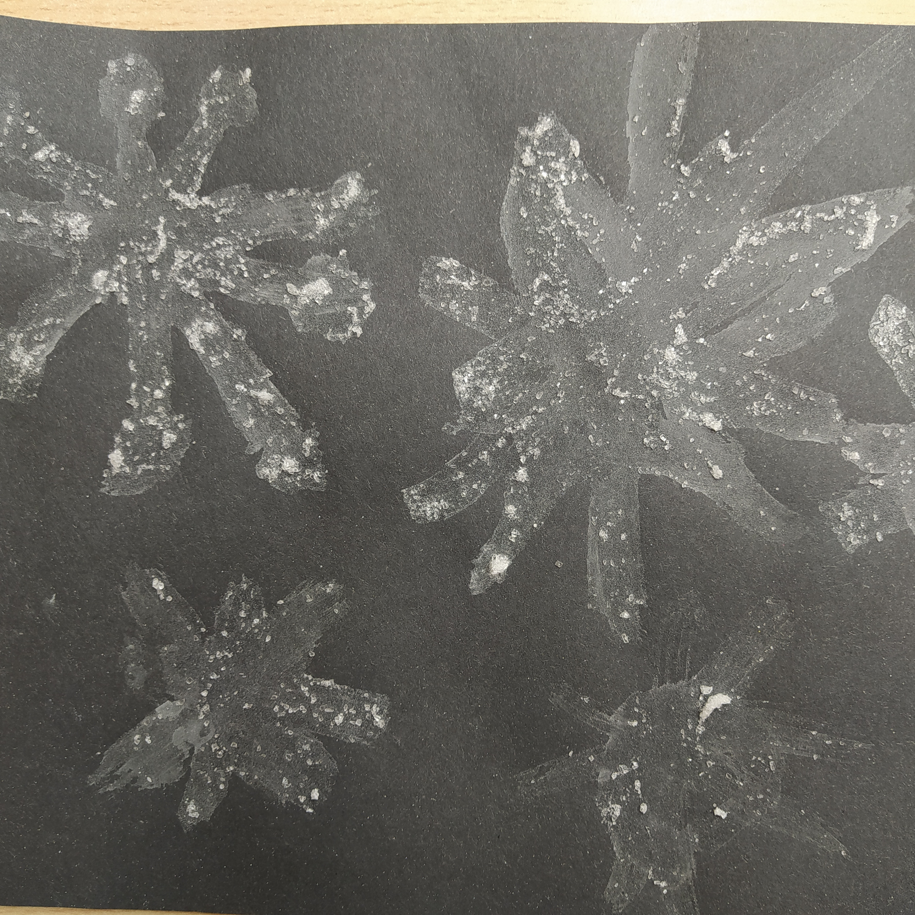 Solí a vodou jsme si namalovali sněhové vločky. Někteří z nás si nejdříve udělali návrh, jak by vločka měla vypadat.