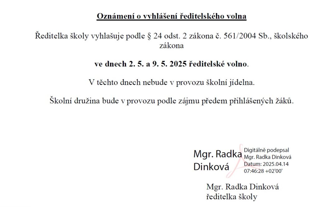 Ředitelka školy vyhlašuje podle § 24 odst. 2 zákona č. 561/2004 Sb., školského zákona ve dnech 2. 5. a 9. 5. 2025 ředitelské volno. V těchto dnech nebude v provozu školní jídelna. Školní družina bude v provozu podle zájmu předem přihlášených žáků.