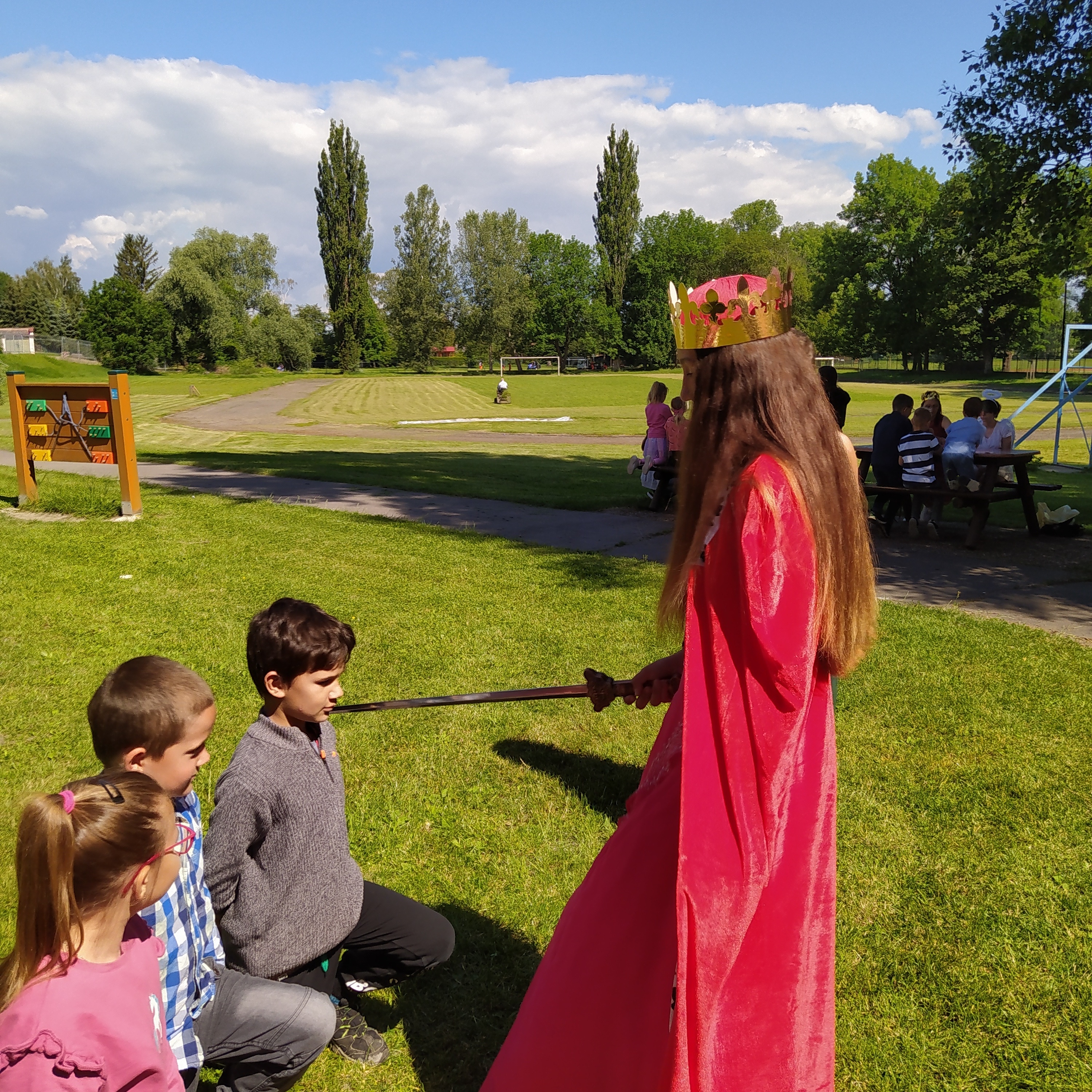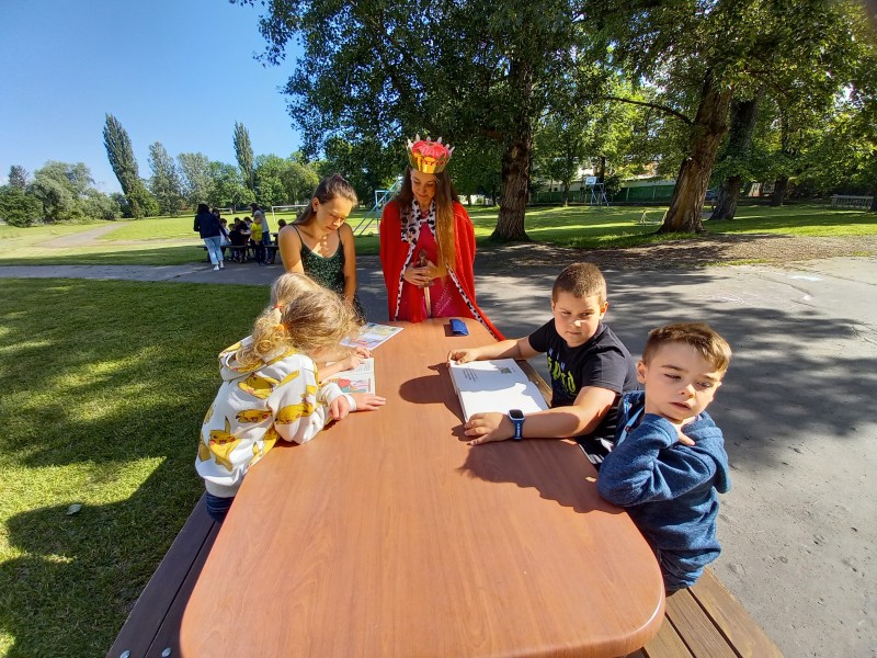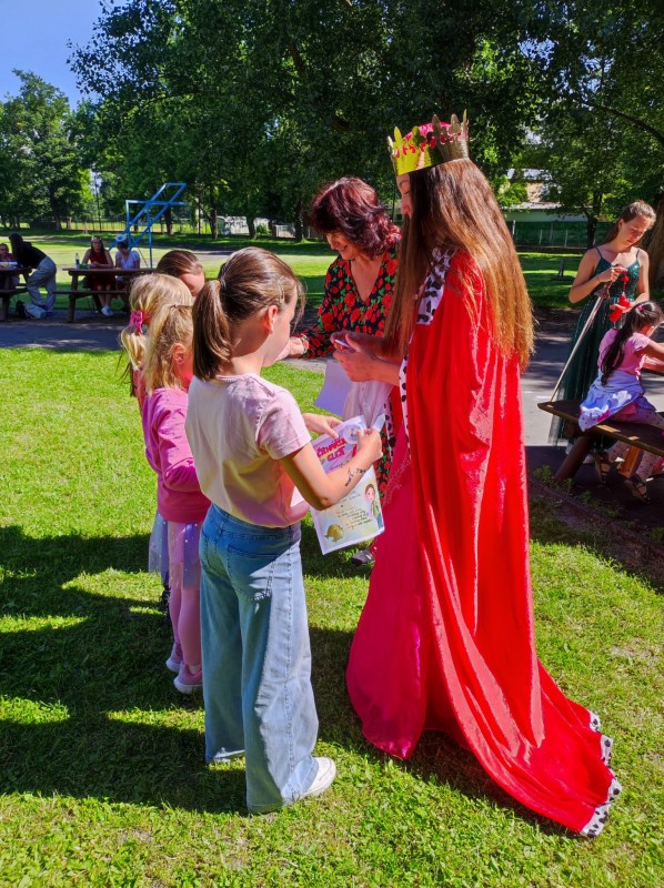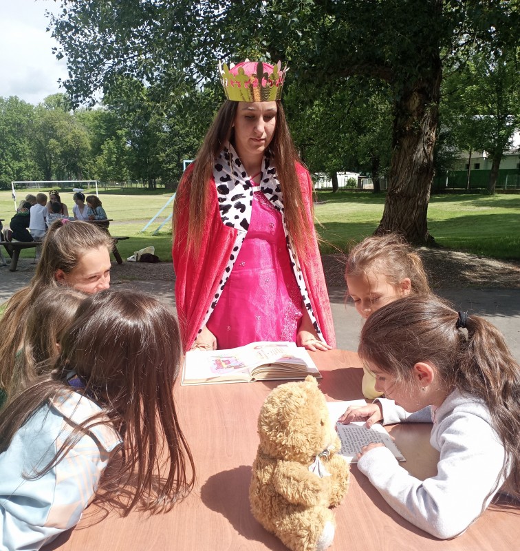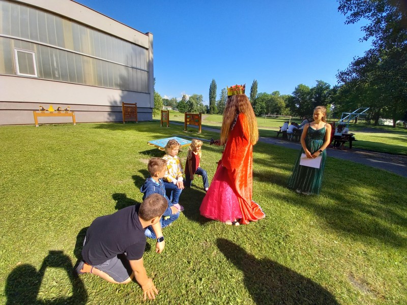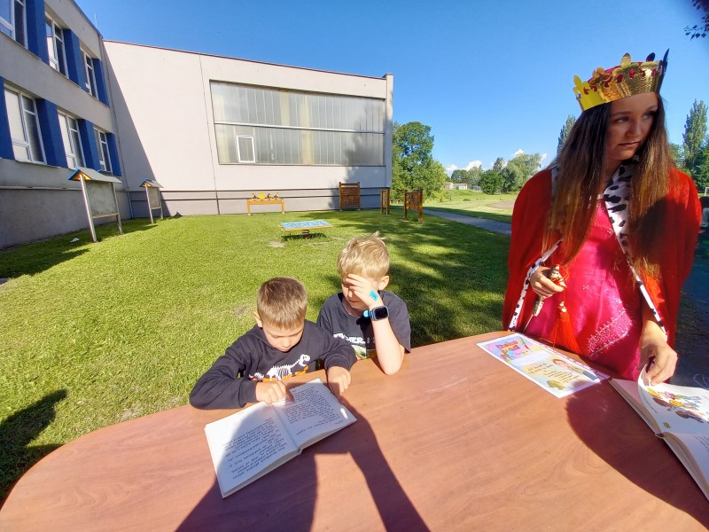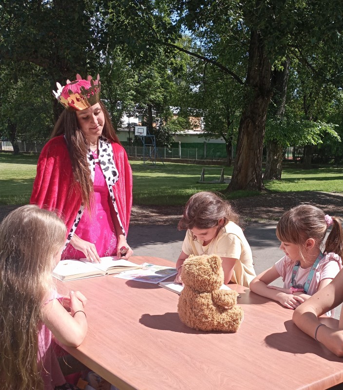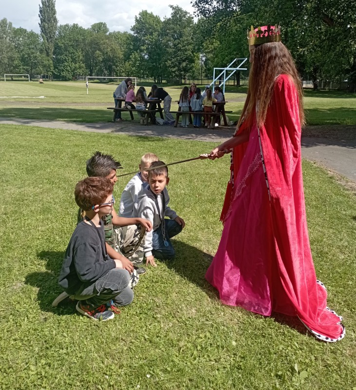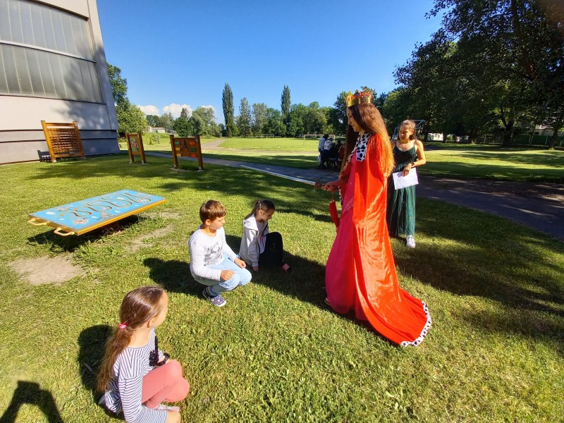 Ve středu 12. června jsme se s prvňáčky vydali na naše školní hřiště. Tentokrát nás tam čekala i královna se svojí sestrou a pohádkovou družinou.