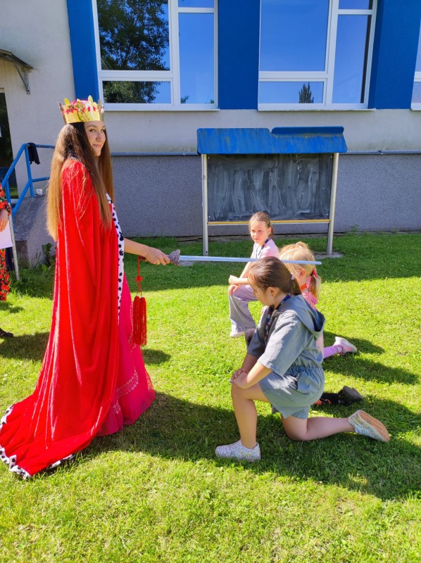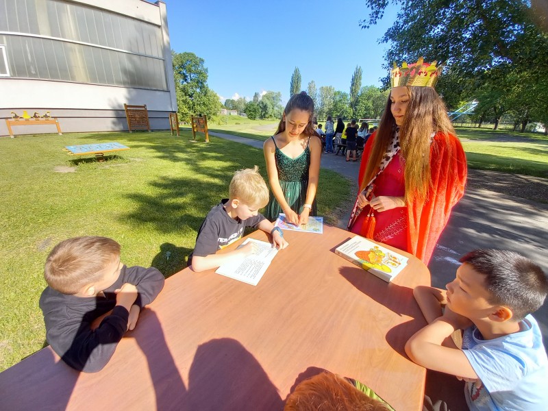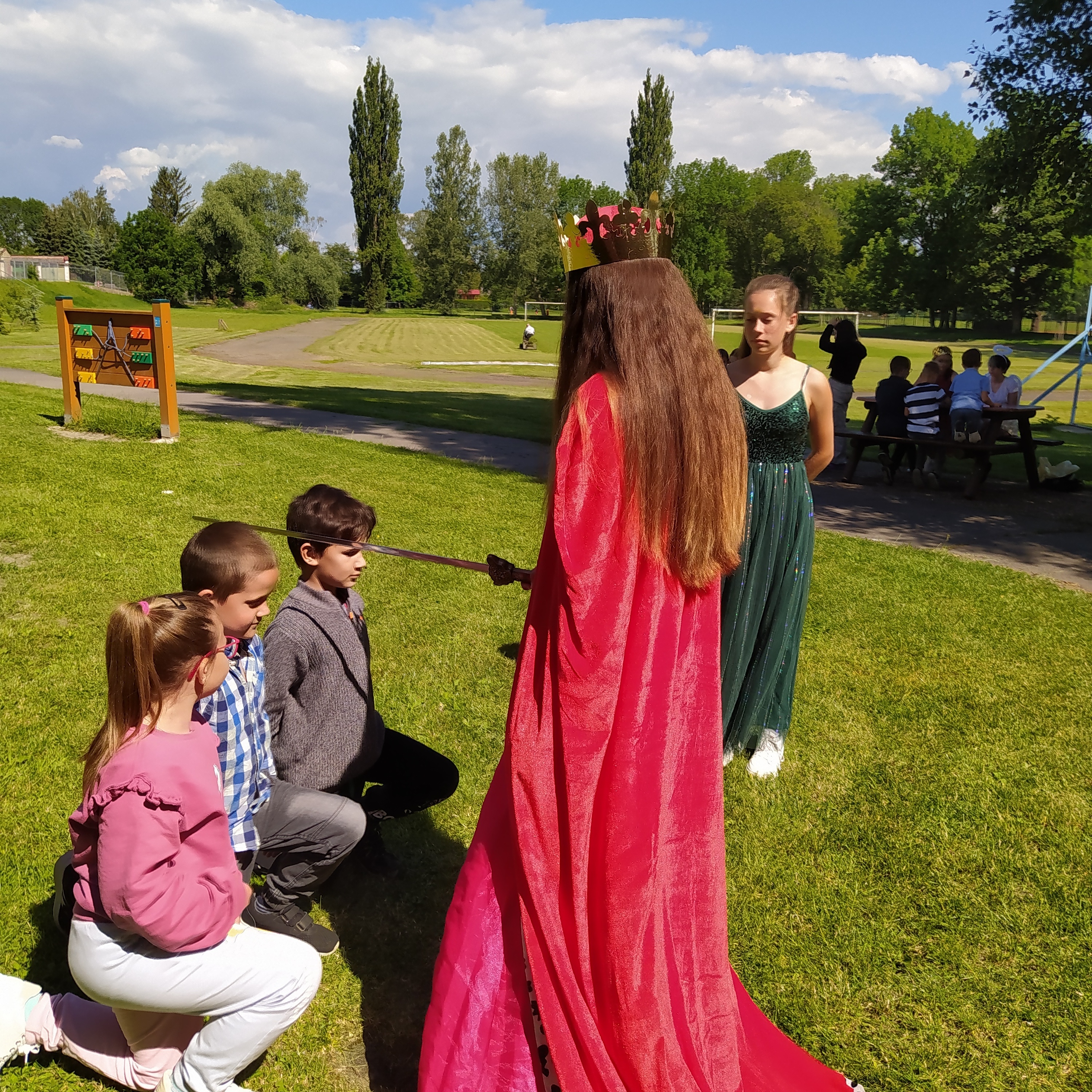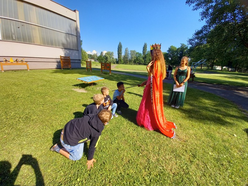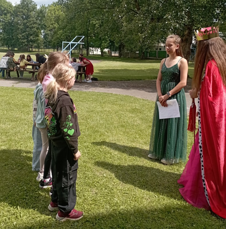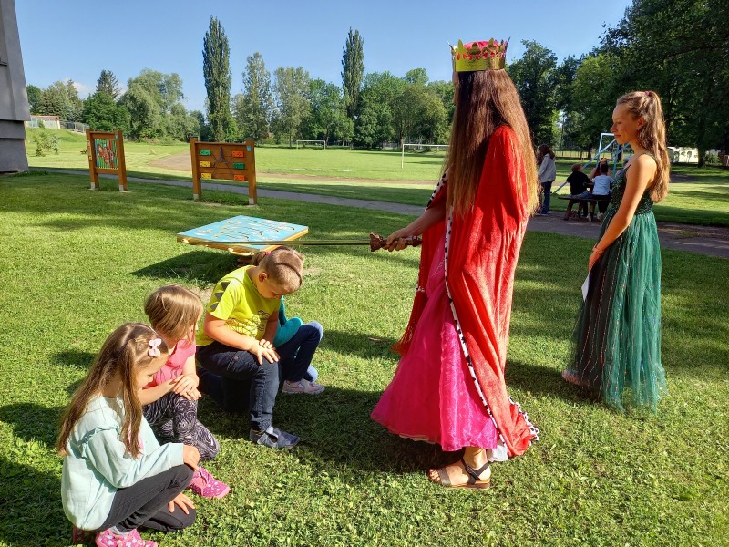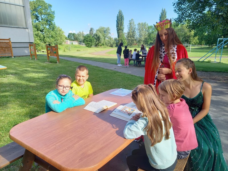 Ve středu 12. června jsme se s prvňáčky vydali na naše školní hřiště. Tentokrát nás tam čekala i královna se svojí sestrou a pohádkovou družinou.