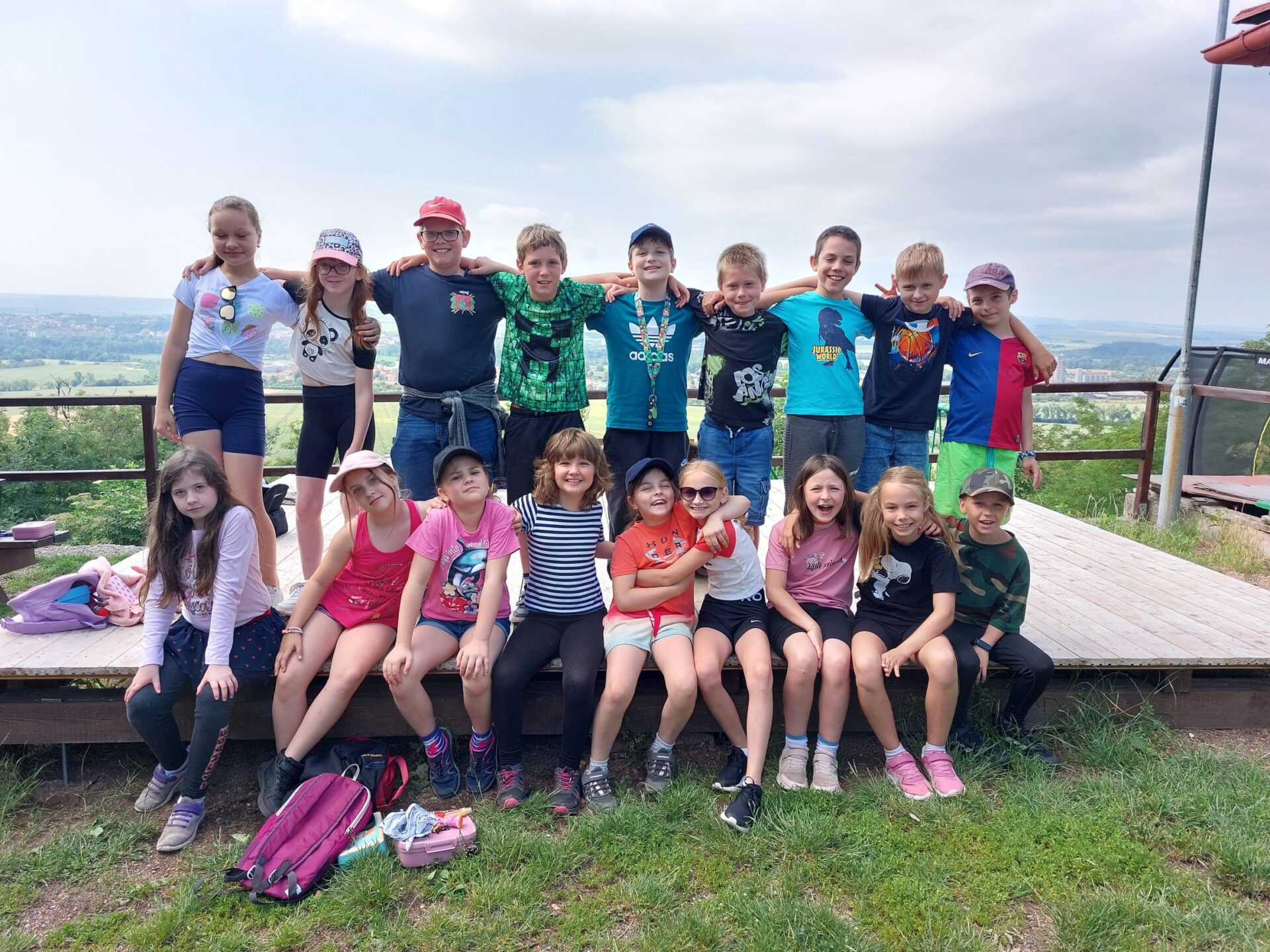 Na vrcholu nás čekala zasloužená odměna – výhled do širokého okolí z výšky a svačinka. Cestou zpět jsme si ještě stačili nasbírat pár listů a kamínků na památku.