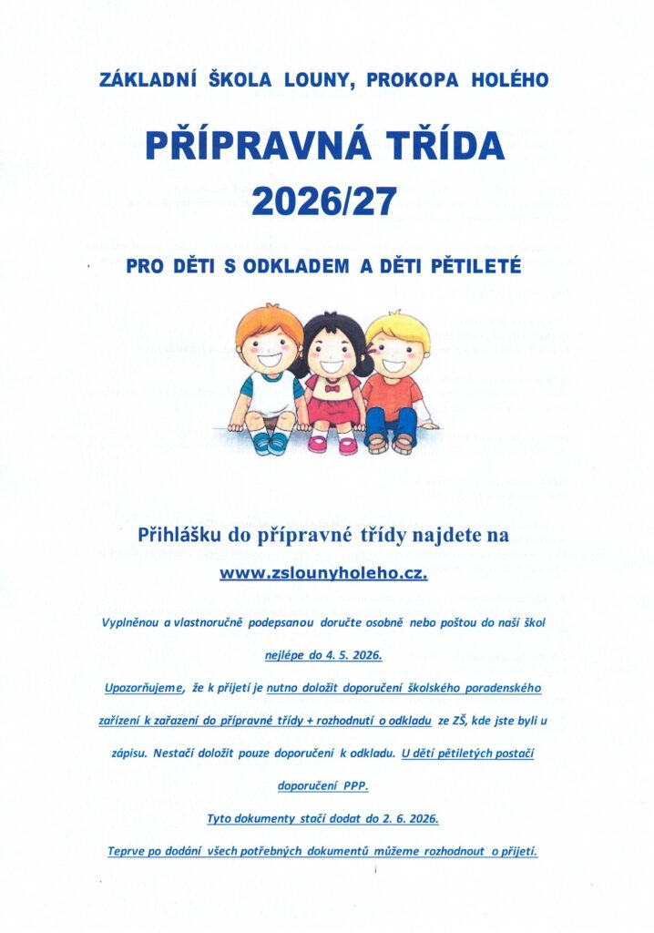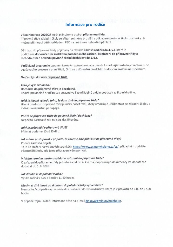 V příštím školním roce budeme opět otevírat přípravnou třídu pro děti s odkladem a děti pětileté. Více informací najdete na přiloženém letáčku.