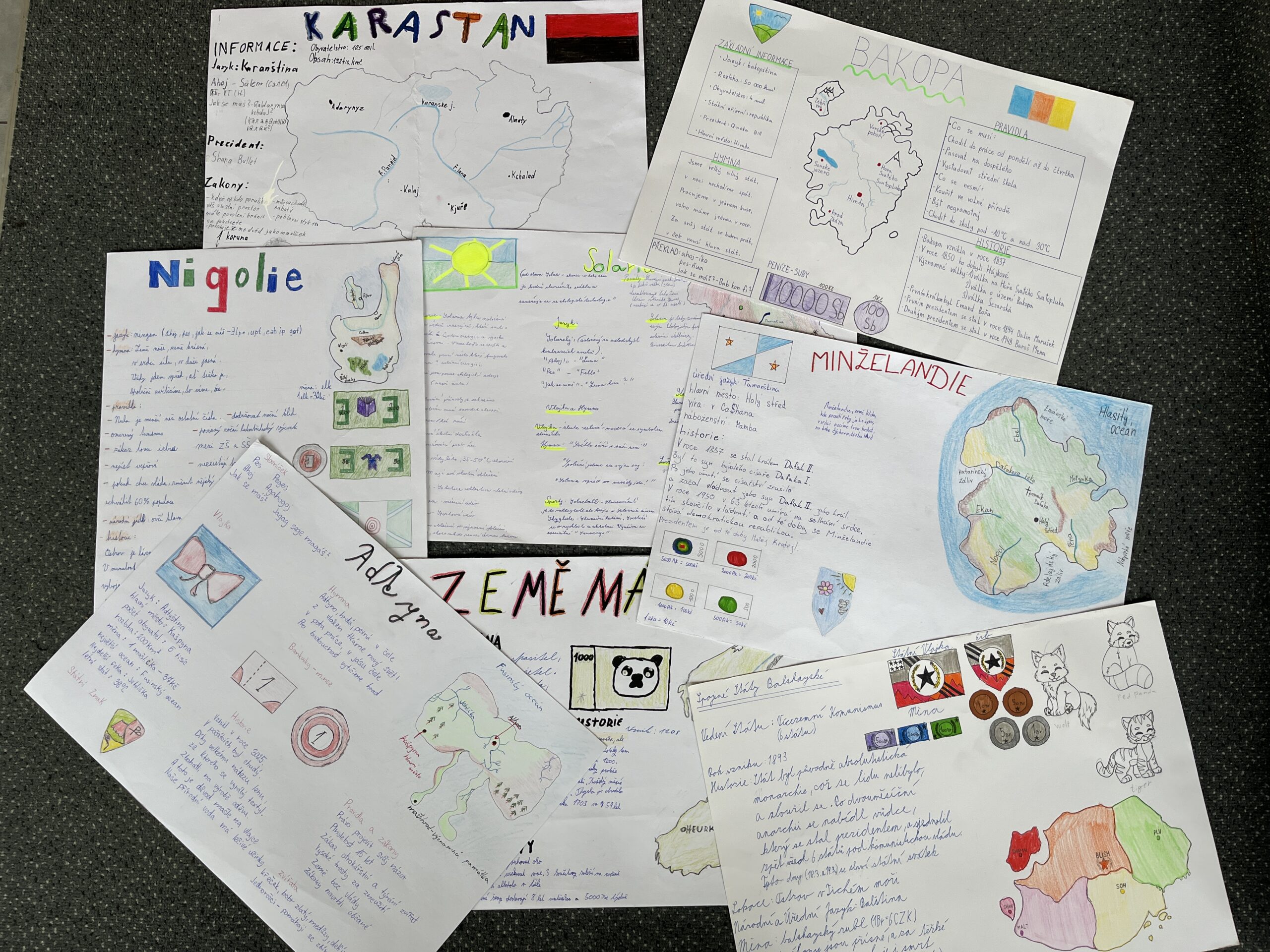 V hodinách výchovy k občanství si děti ve skupinách založily vlastní státy, vymyslely vlastní státní symboly, jazyk, zákony. V některých státech by se opravdu krásně žilo...