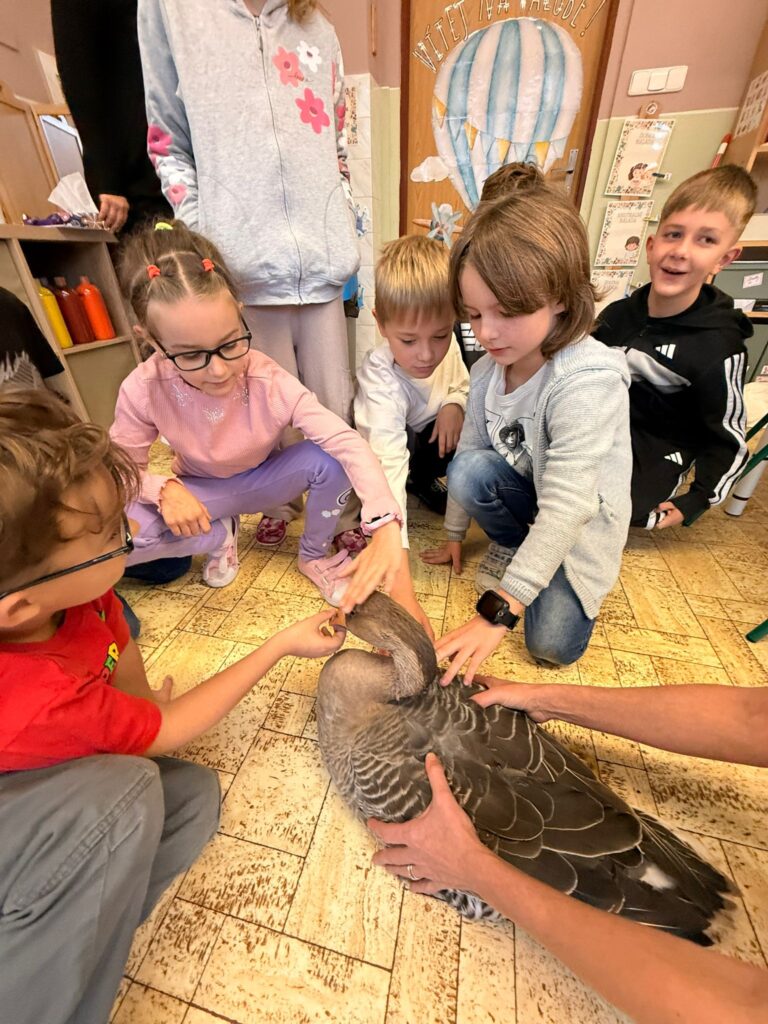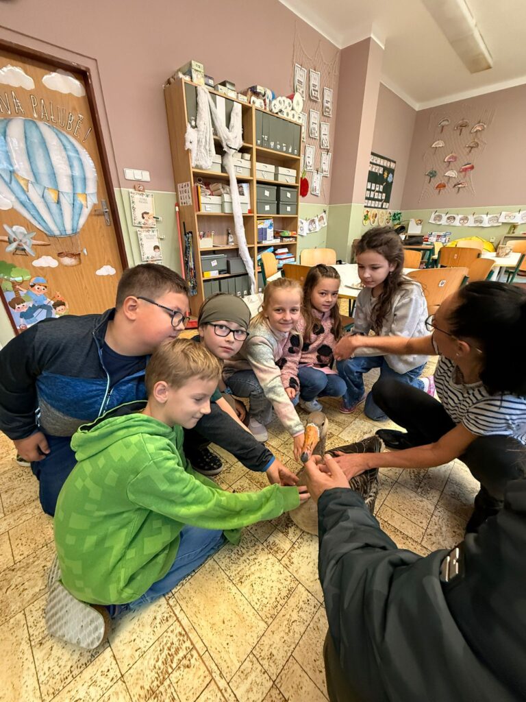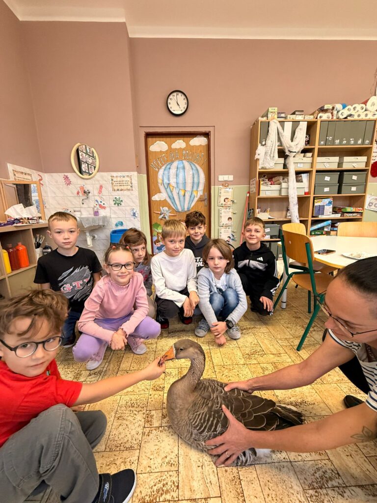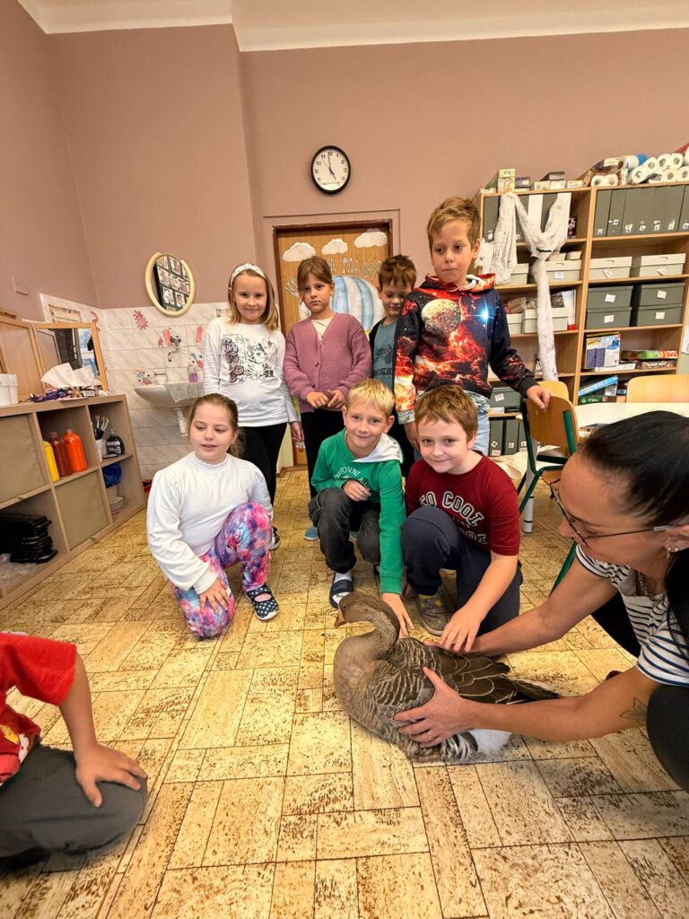 V prvouce probíráme ptáky. Měli jsme možnost si názorně prohlédnout a pohladit husu přímo v naší škole.