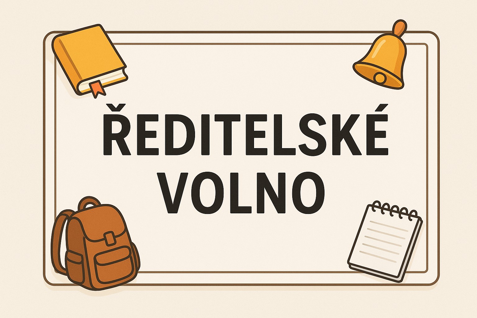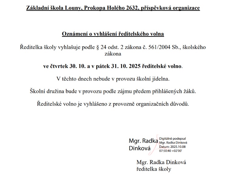 Ředitelka školy vyhlašuje podle §24 odst. 2 zákona č. 561/2004 Sb., školského zákona ve čtvrtek 30. 10. a v pátek 31. 10. 2025 ředitelské volno. V těchto dnech nebude v provozu školní jídelna. Školní družina bude v provozu podle zájmu předem přihlášených žáků. Ředitelské volno je vyhlášeno z provozně organizačních důvodů.