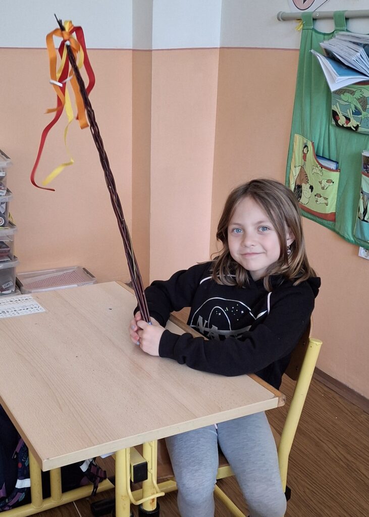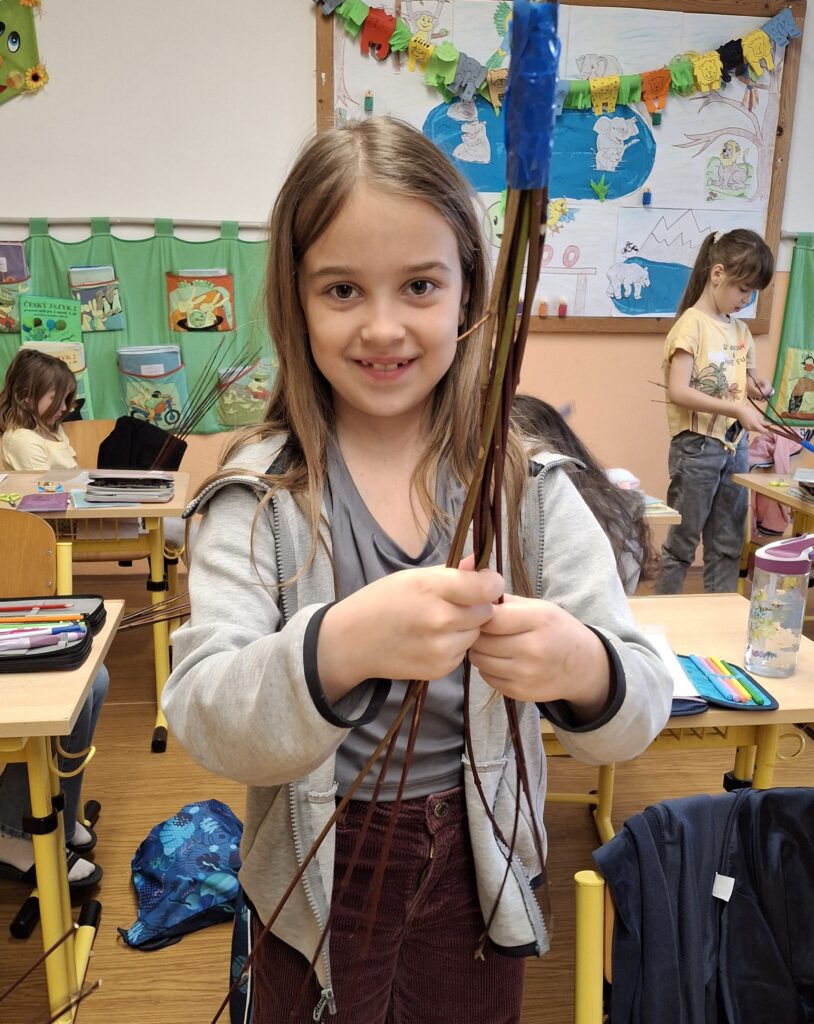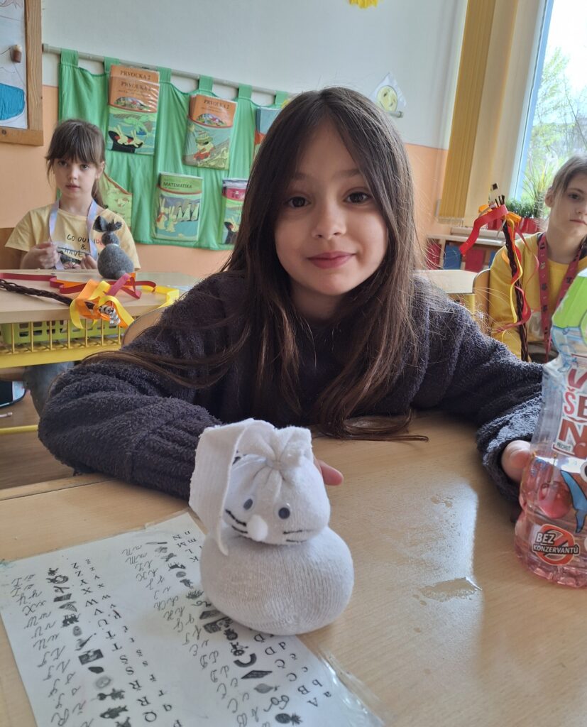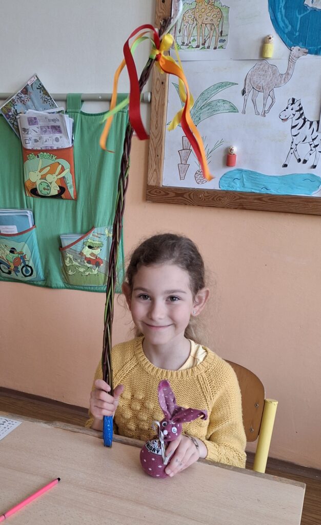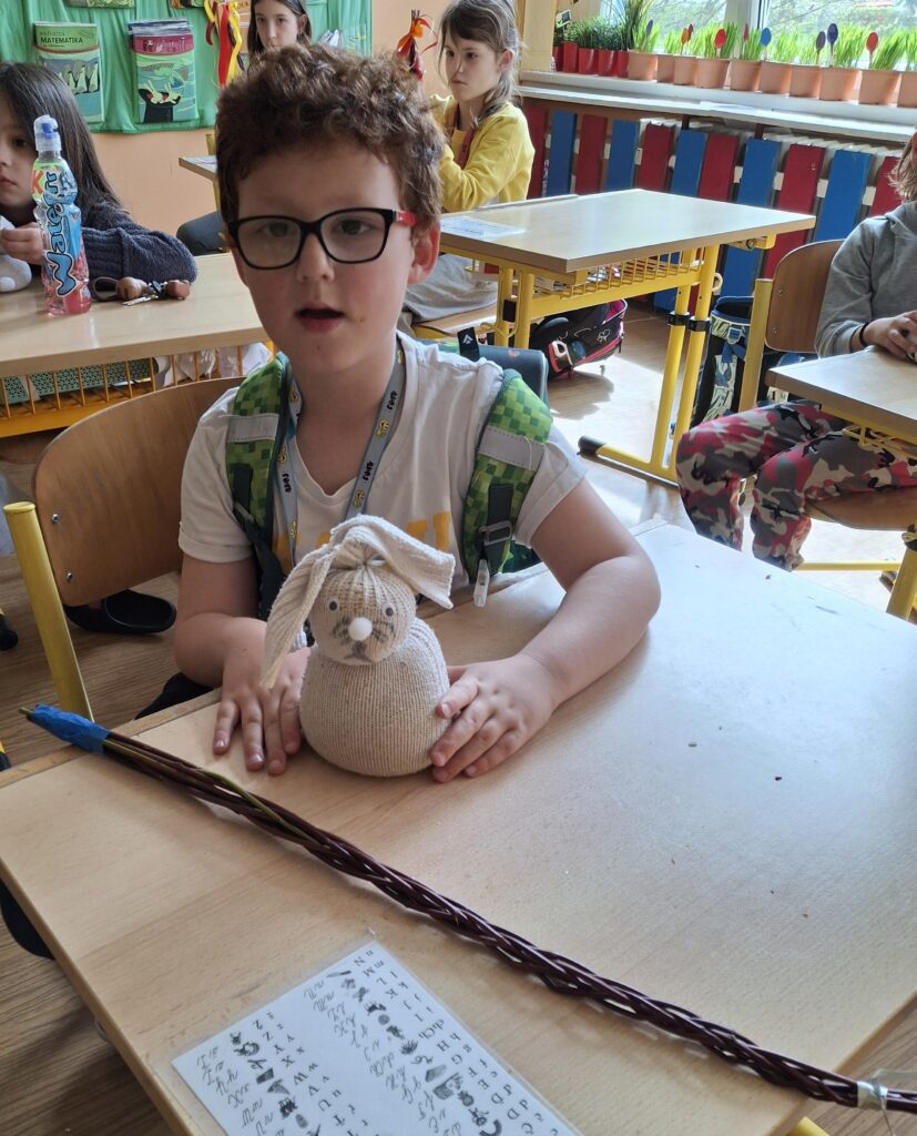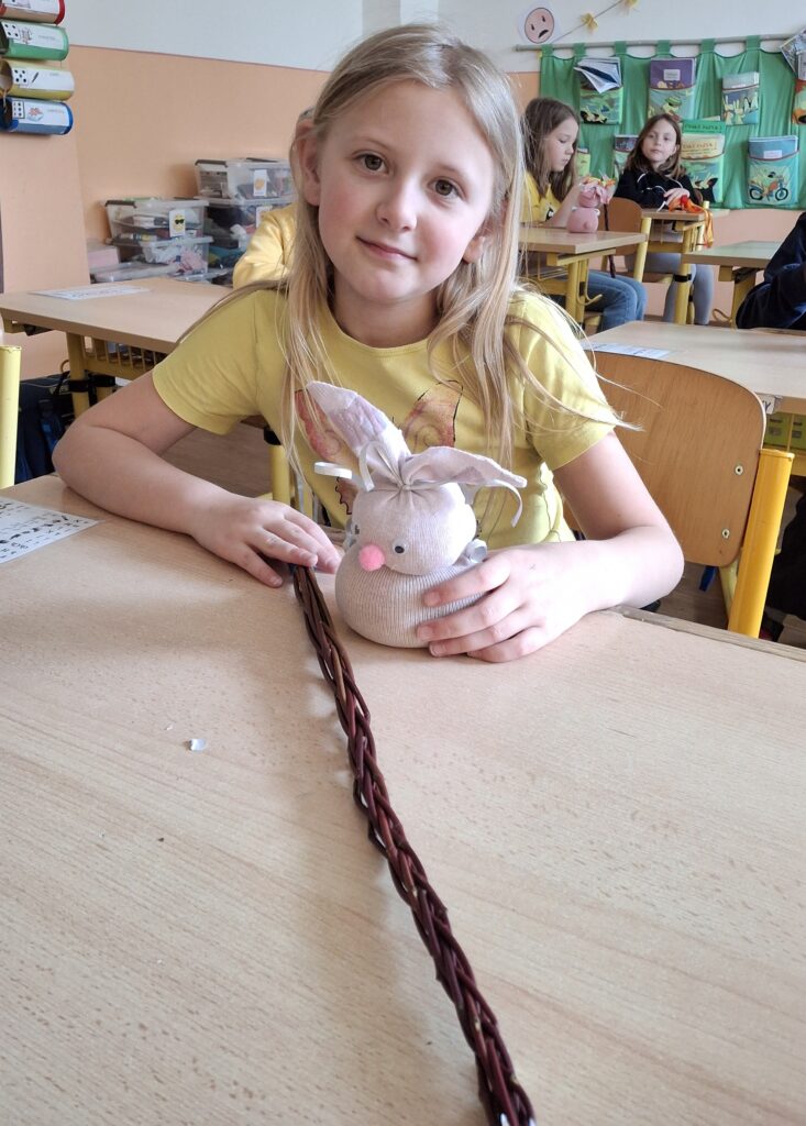 Také dnes děti čekaly nové informace o pašijovém dni a plnění různých úkolů. Soutěžili jsme o nejrychleji složené "rozbité" vejce. Někteří dokončovali pomlázky, jiní tvořili velikonočního zajíce z ponožky. Také jsme si udělali zápich do osení. V hodině tělesné výchovy si děti zahrály hru "Vejce - kuře - slepice" a pak z trampolíny naskákaly do "kurníku". Poslední hodinu nás čekal výlet za jarními kytičkami.