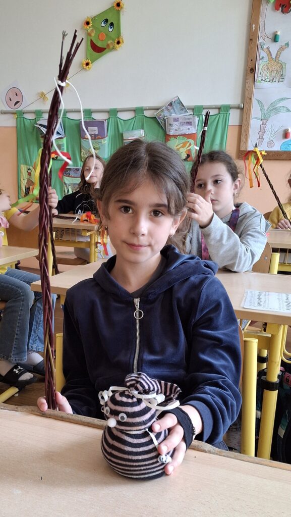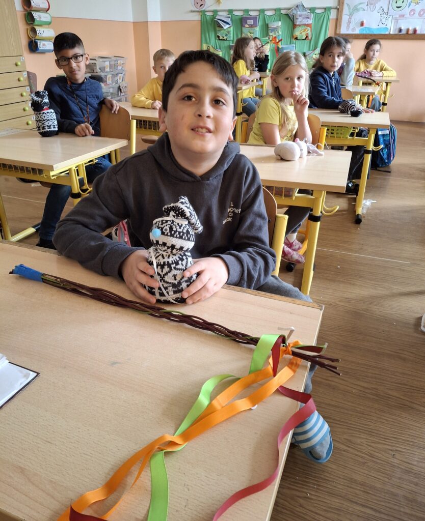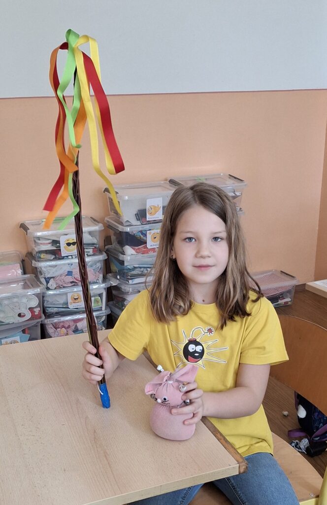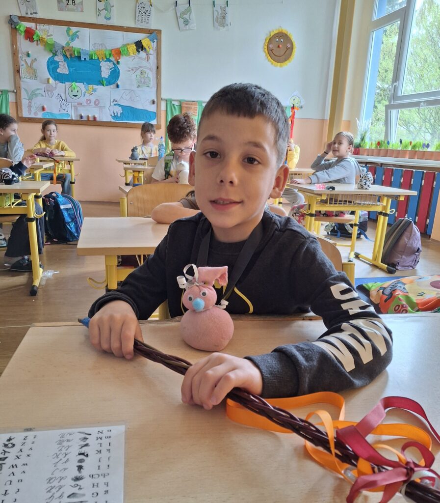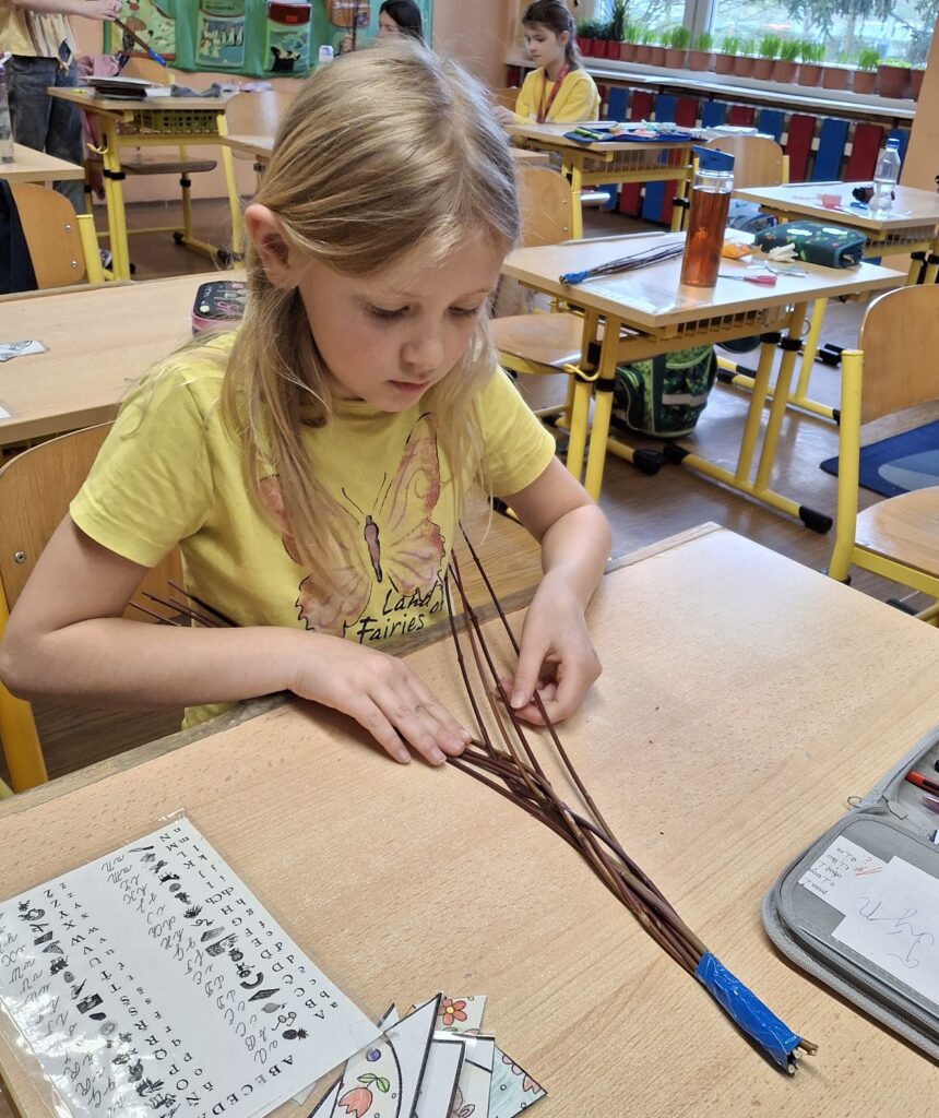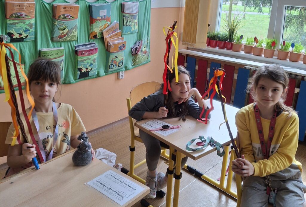 Také dnes děti čekaly nové informace o pašijovém dni a plnění různých úkolů. Soutěžili jsme o nejrychleji složené "rozbité" vejce. Někteří dokončovali pomlázky, jiní tvořili velikonočního zajíce z ponožky. Také jsme si udělali zápich do osení. V hodině tělesné výchovy si děti zahrály hru "Vejce - kuře - slepice" a pak z trampolíny naskákaly do "kurníku". Poslední hodinu nás čekal výlet za jarními kytičkami.