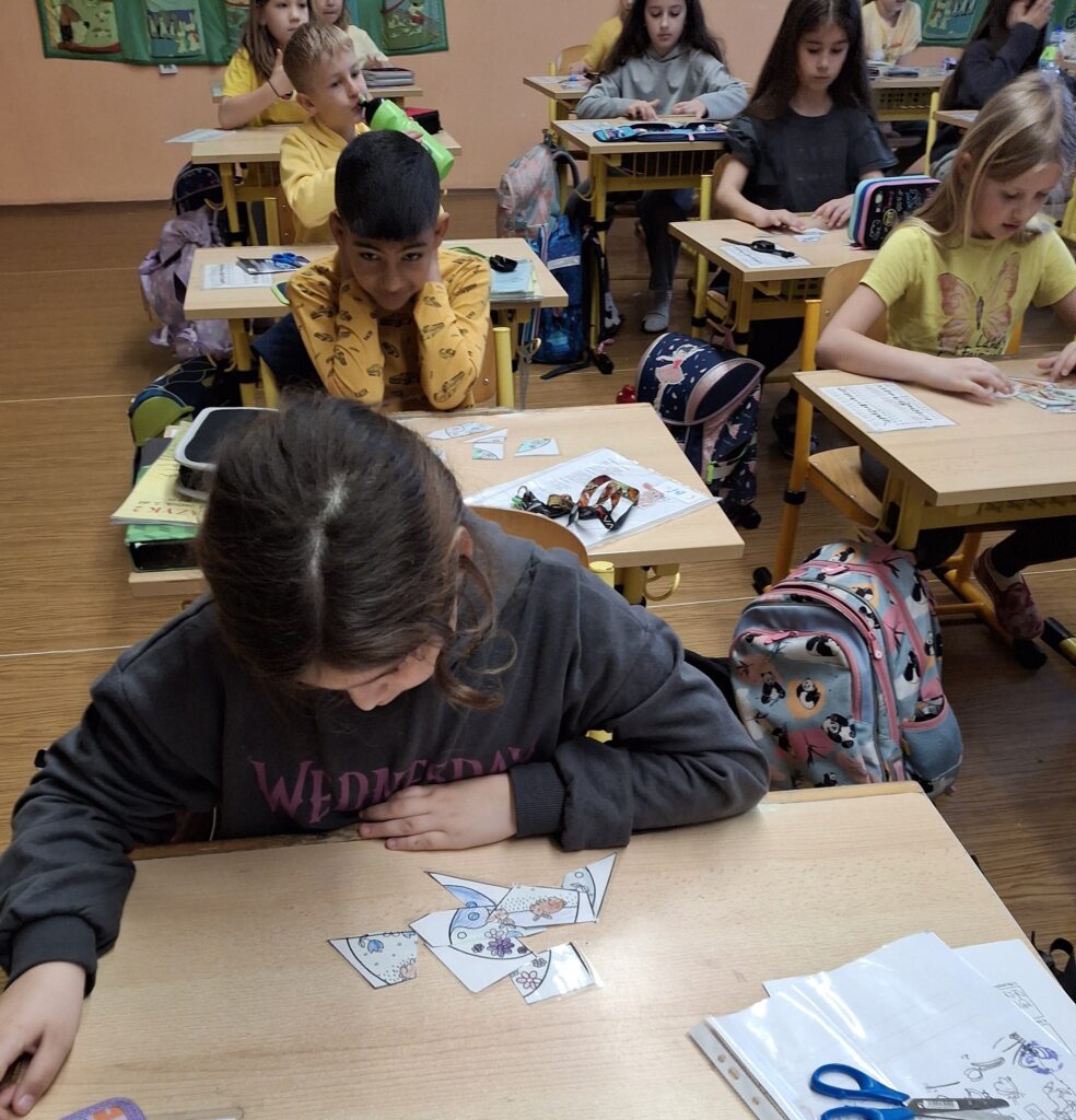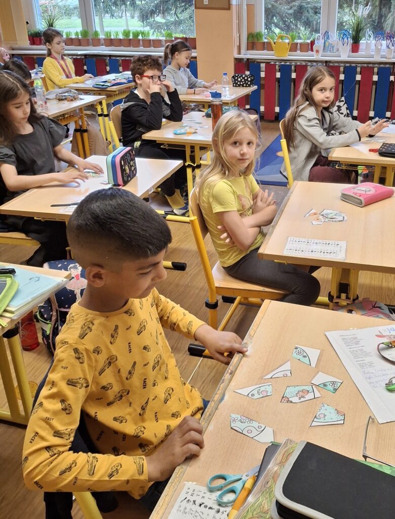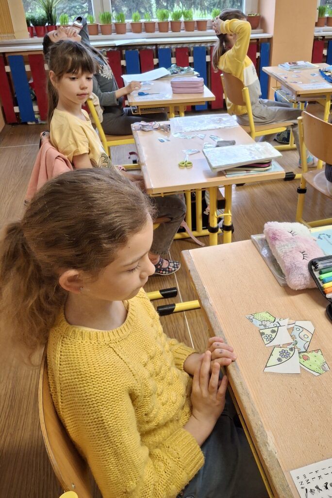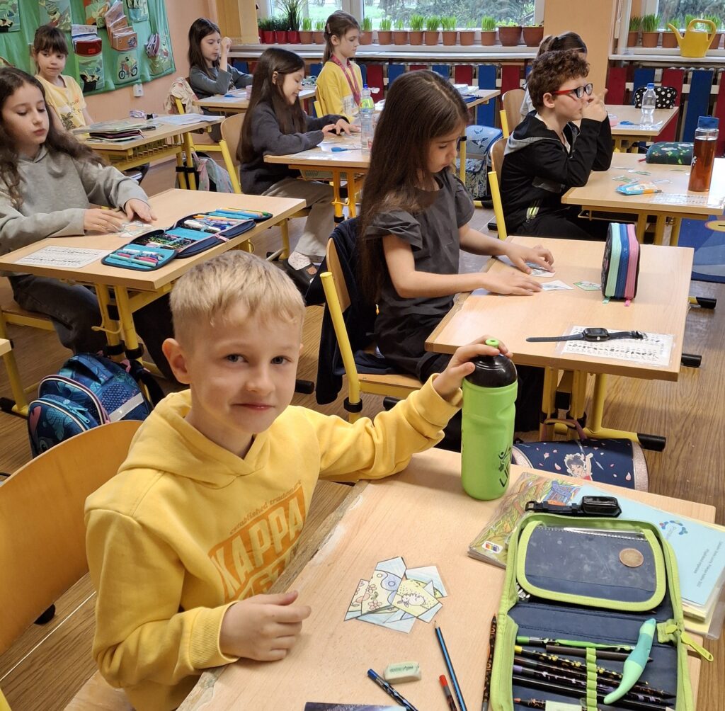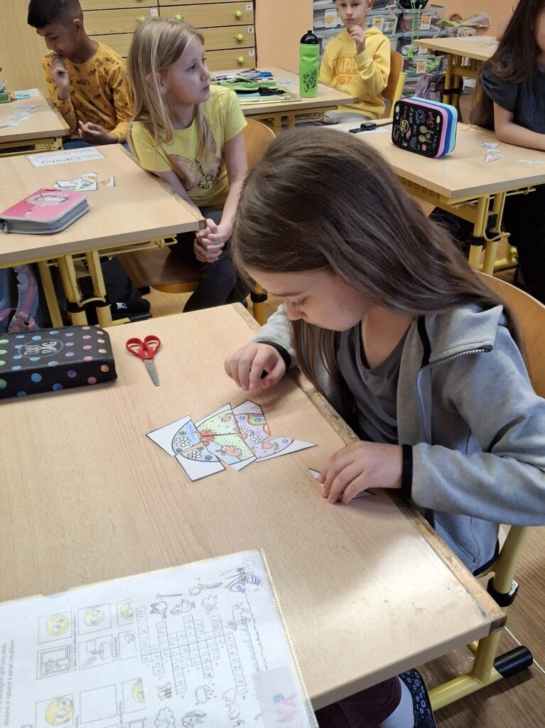 Také dnes děti čekaly nové informace o pašijovém dni a plnění různých úkolů. Soutěžili jsme o nejrychleji složené "rozbité" vejce. Někteří dokončovali pomlázky, jiní tvořili velikonočního zajíce z ponožky. Také jsme si udělali zápich do osení. V hodině tělesné výchovy si děti zahrály hru "Vejce - kuře - slepice" a pak z trampolíny naskákaly do "kurníku". Poslední hodinu nás čekal výlet za jarními kytičkami.