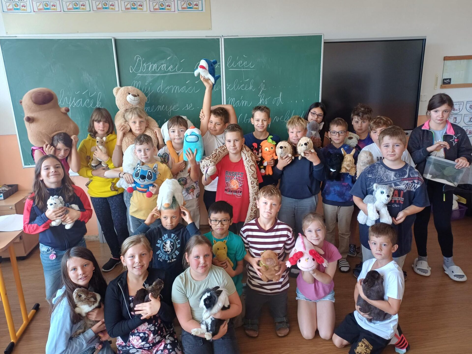 V hodině slohu jsme si tentokrát povídali o našich domácích mazlíčcích. Každý žák si přinesl svého zvířecího kamaráda – nebo alespoň jeho fotografii či hračku – a popsal ho spolužákům. Dozvěděli jsme se, jak se mazlíčci jmenují, co mají rádi a čím jsou výjimeční. Bylo to veselé setkání plné vyprávění, zajímavostí i smíchu.