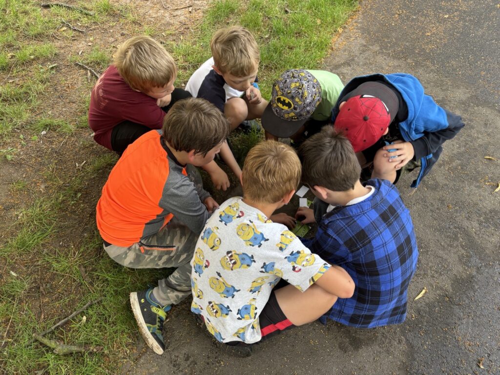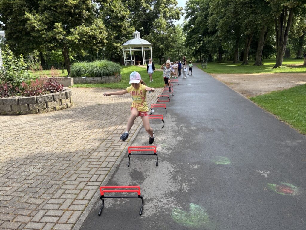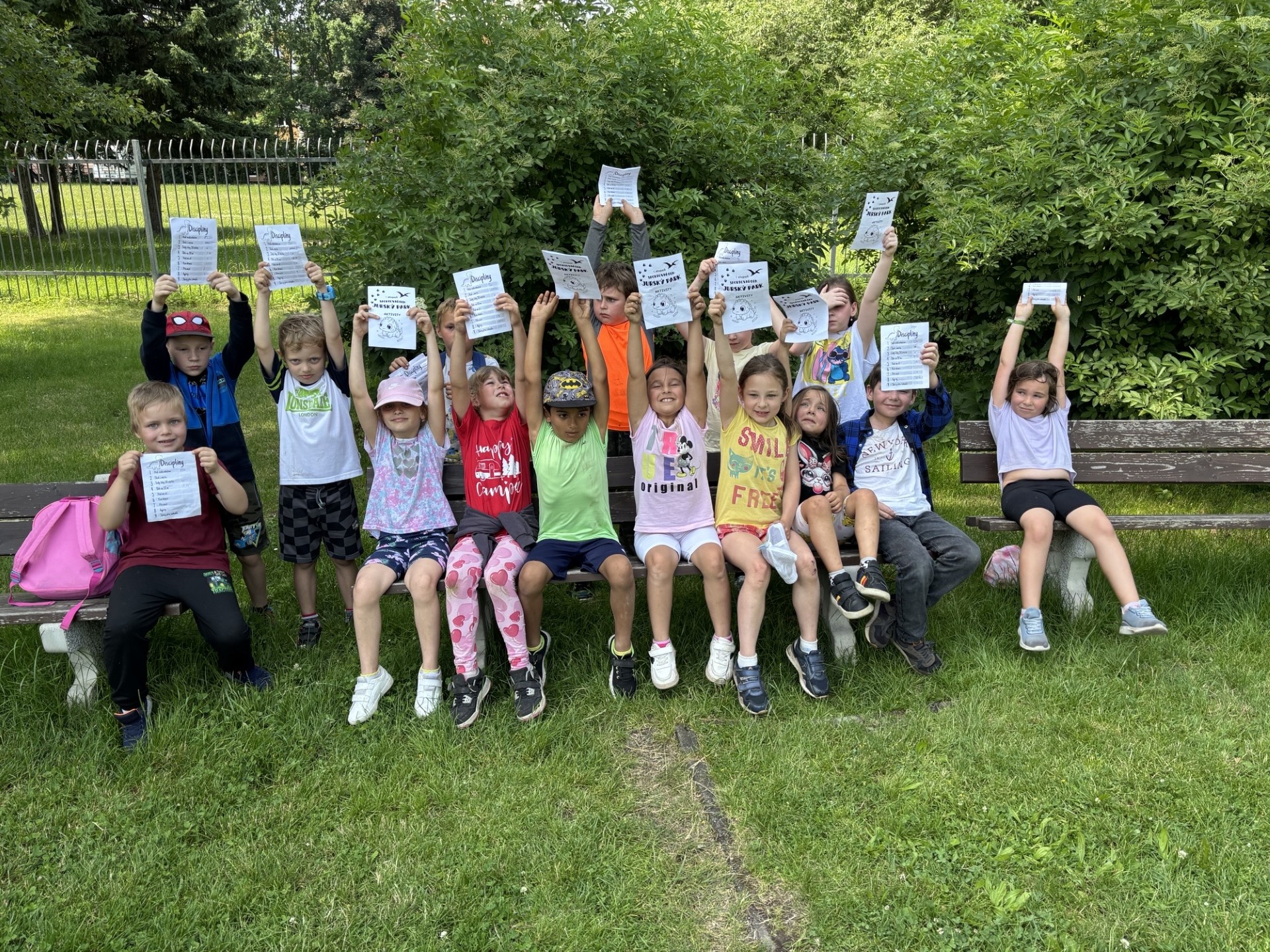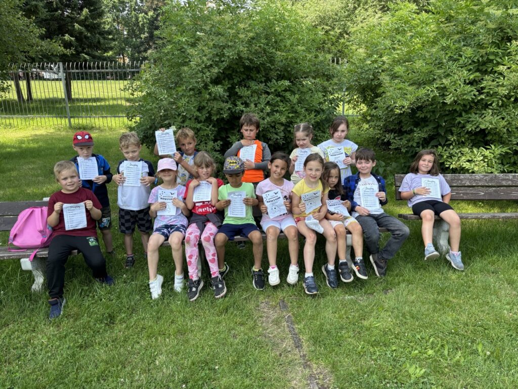 Sportovali jsme na školním hřišti a splnili 9 disciplín... V parku jsme pak pokračovali ve sportování a lovení dinosaurů...