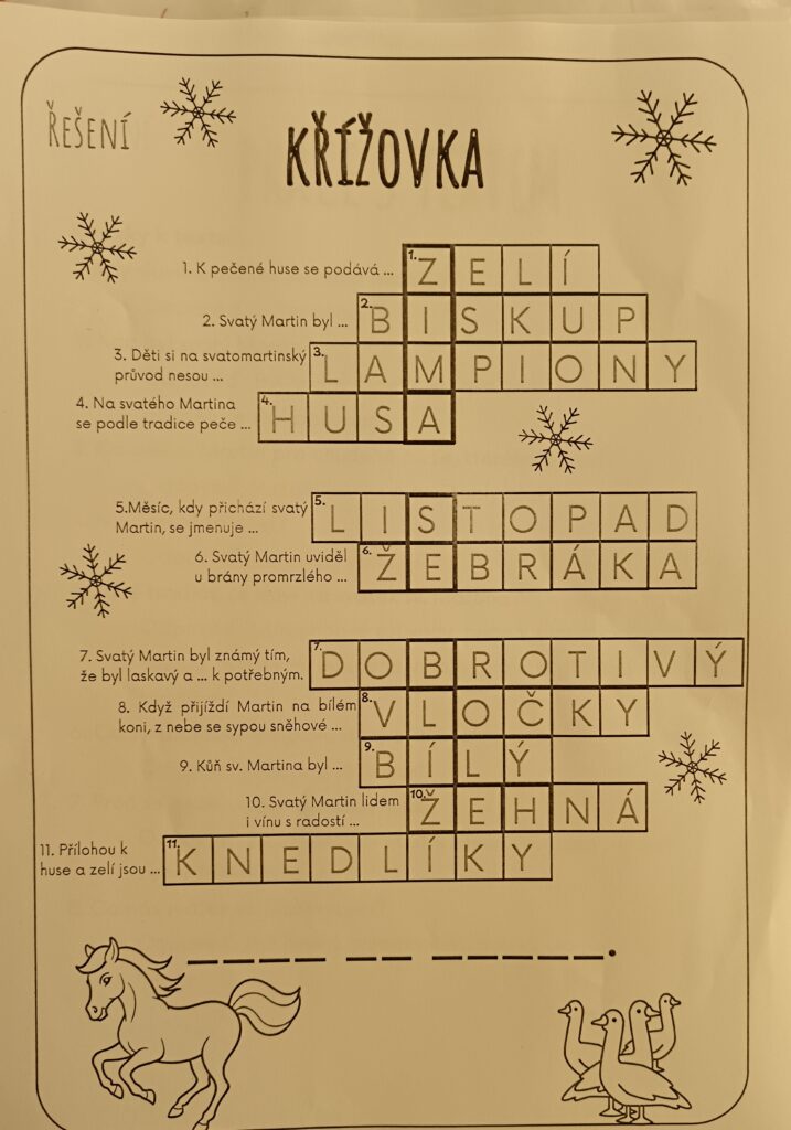 Dnes jsme si připomněli svátek sv. Martina a toto téma se nám prolínalo celým dnem. Luštili jsme křížovku, počítali jsme, vyráběli různé symboly hodící se k tomuto svátku.