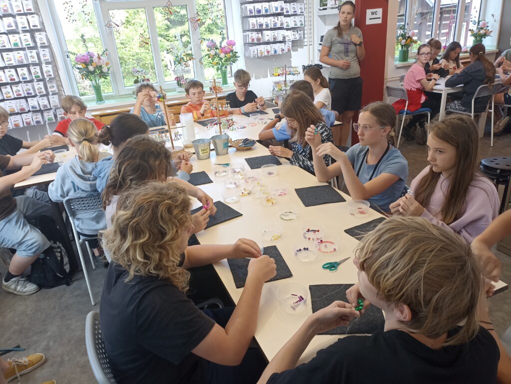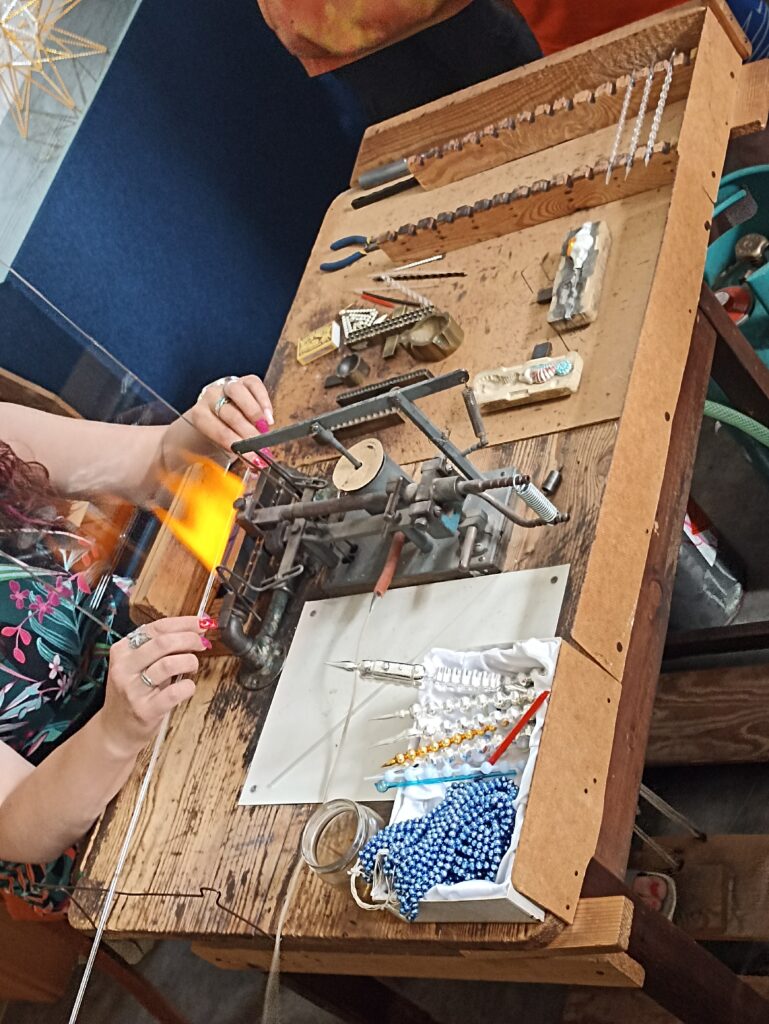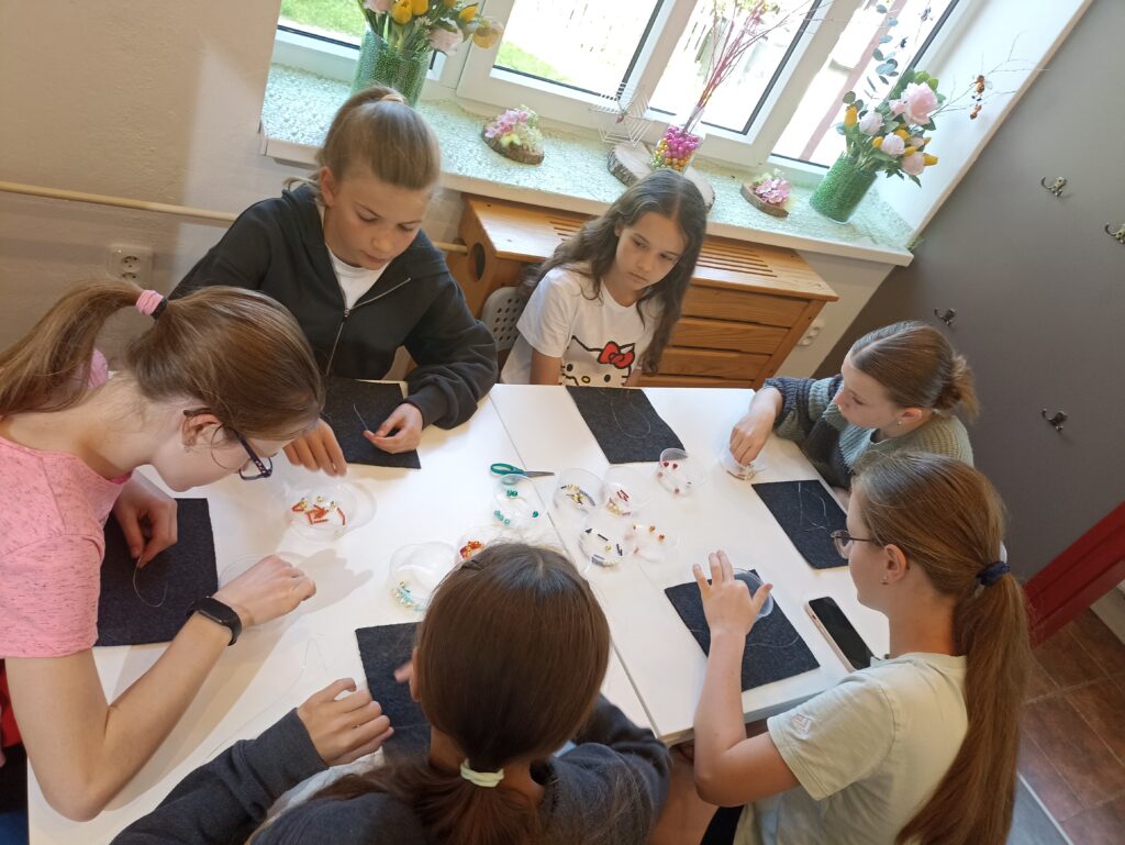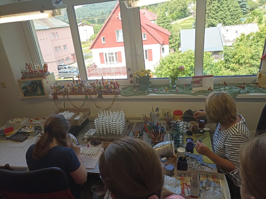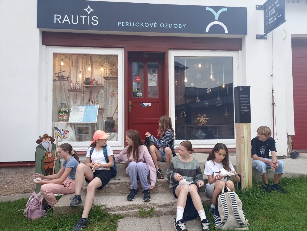 Dopoledne bylo ve znamení návštěvy řemeslné dílny v obci Poniklá. Vydali jsme se na exkurzi do rodinné firmy Rautis, která se zabývá foukáním skleněných perlí a výrobou perličkových vánočních ozdob. Od roku 2020 je zapsána na seznamu nehmotného kulturního dědictví UNESCO. Prohlédli jsme si samotnou výrobu, kdy jsme mohli nakouknout zaměstnancům přes rameno, a pak si žáci zkusili vyrobit vlastní ozdobu.