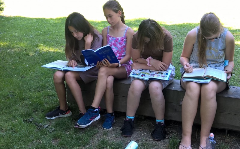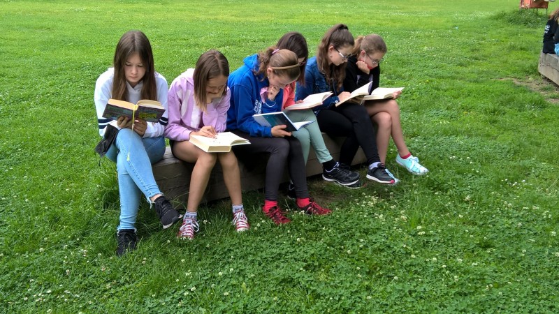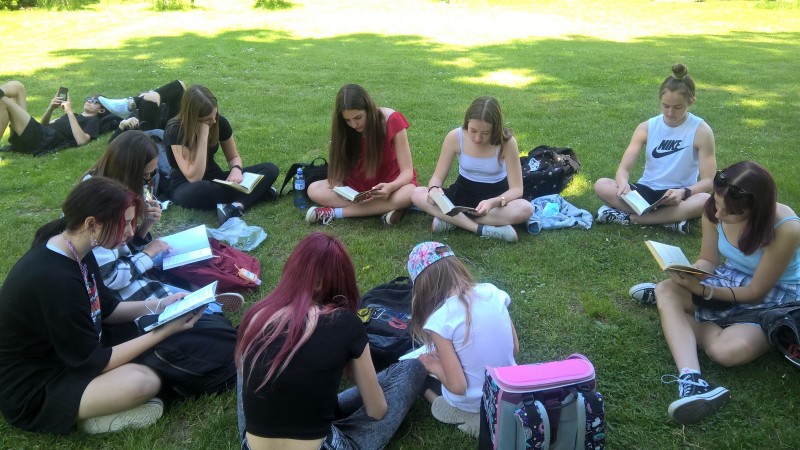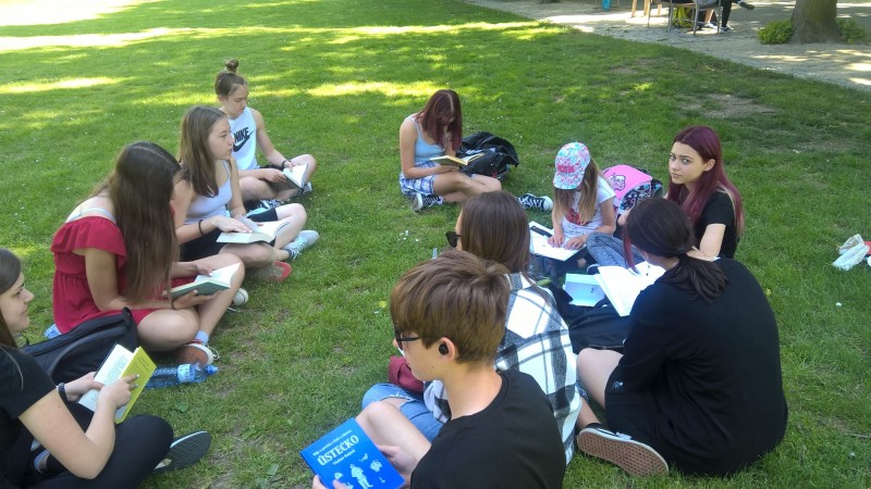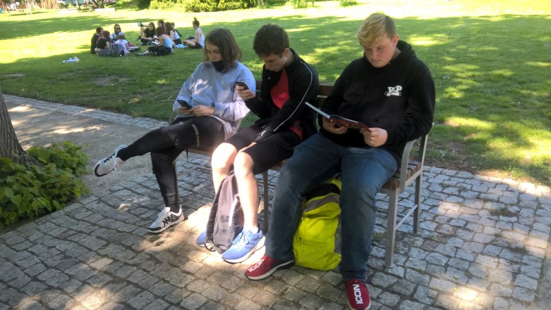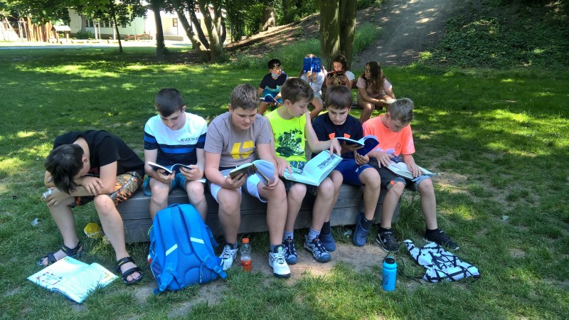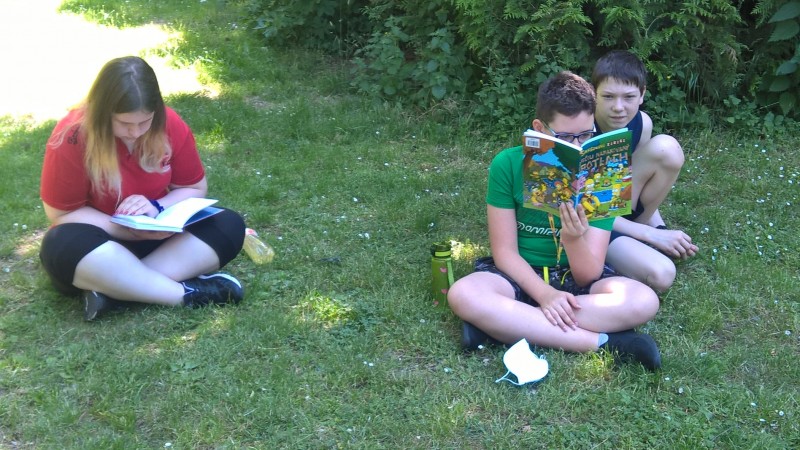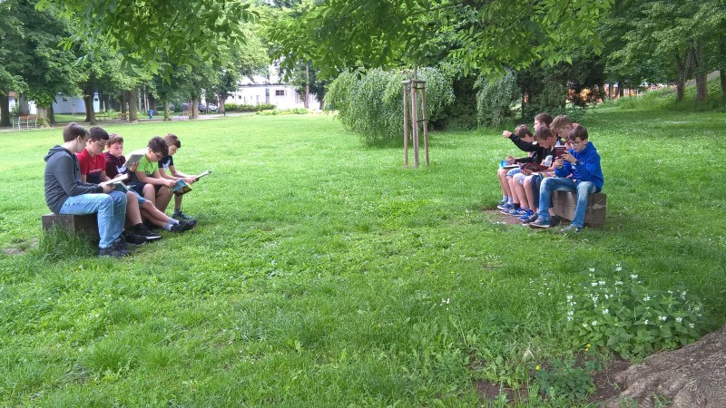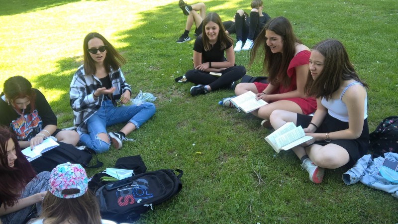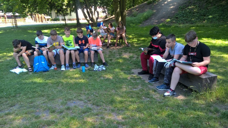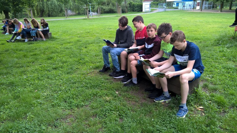 Poslední hodiny literatury jsme trávili v lounském parku. Každý si přinesl svou oblíbenou knihu, kdo neměl, dostal knihu pověstí z našeho regionu. Před a při čtení jsme si povídali o titulu a přečteném textu. Někteří vyprávěli o nedalekém Bořeni, či jiných místech Českého středohoří.
