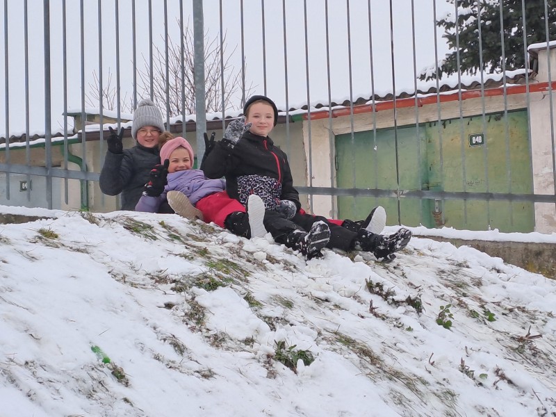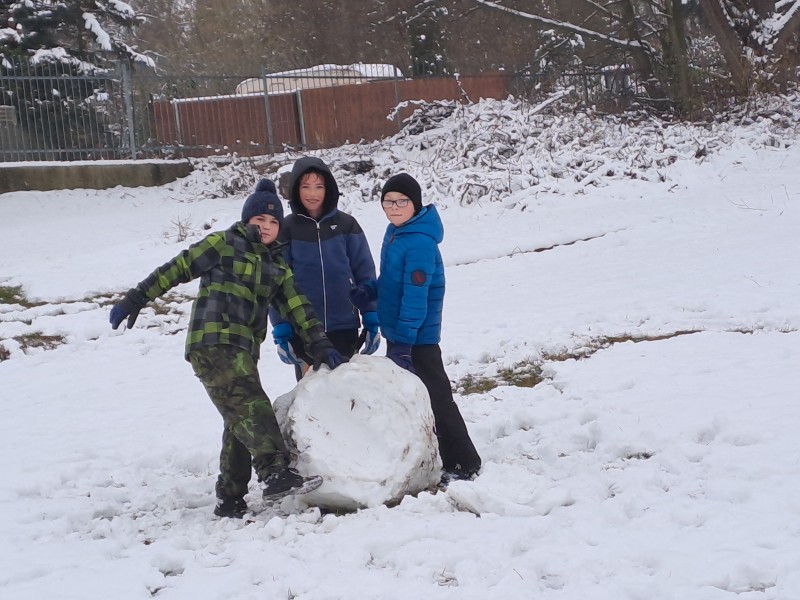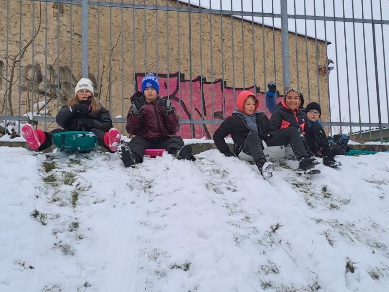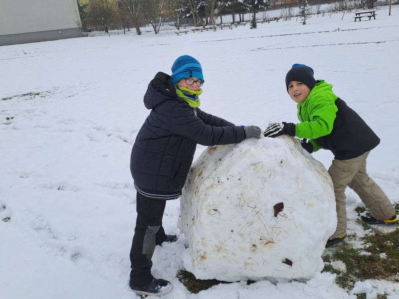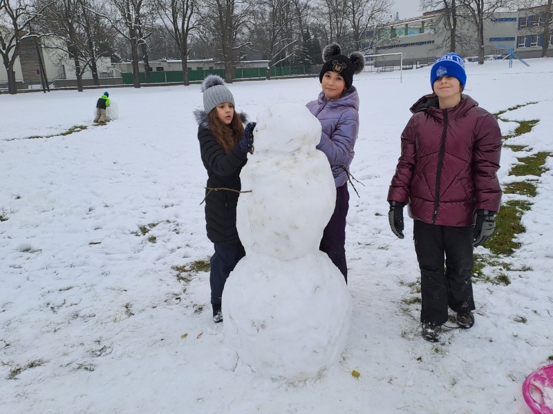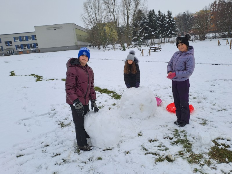 V prosinci jsme si užili sněhovou nadílku. Na školním hřišti jsme se svezli a nakonec i vyzkoušeli sněhové stavby.