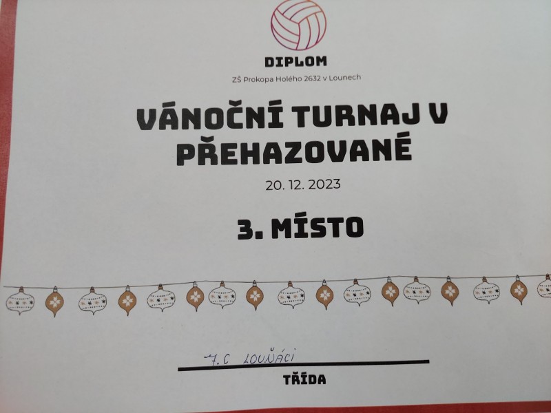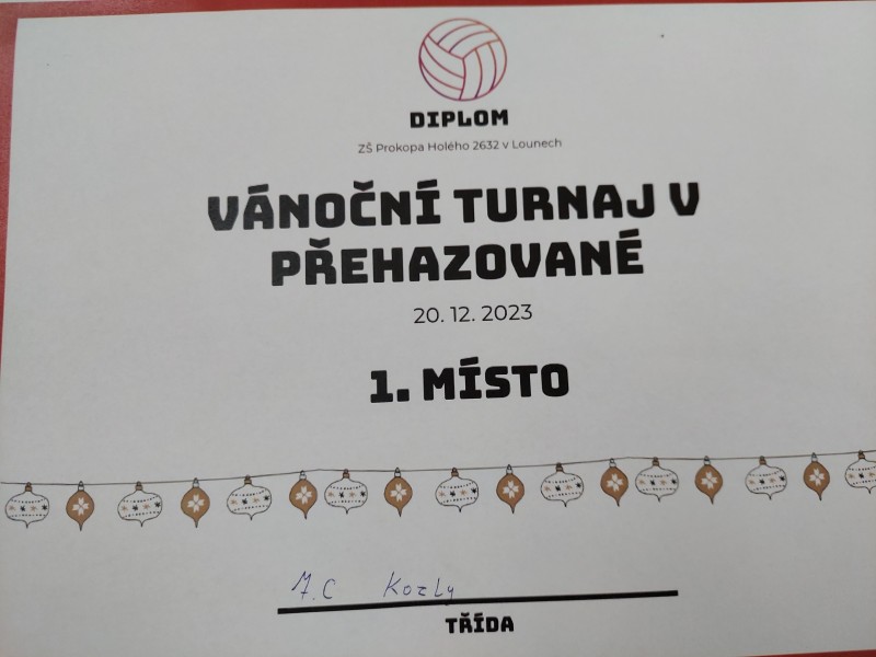 Ve středu 20. prosince proběhl na naší škole turnaj v přehazované. V malé tělocvičně se sešly čtyři týmy ze 7. ročníku. Všechna družstva odehrála vzájemné zápasy v jedné skupině „ každý s každým“. Turnaj nabídl vzrušující momenty a skvělé výkony od všech týmů. Hráči byli nadšeni a ukázali všem, že hrají fair a mohou se pochlubit soutěžním duchem. Jasným vítězem v přehazované se stal náš tým „ Kozly“, složený z Kryštofa, Michala, Adama T., Filipa, Daniely, Elen, Adély P. a Adély K. Ani náš druhý tým „Louňáci“ se neměli za co stydět, protože předvedli výborné výkony, krásné akce, a především snahu a chuť hrát. Krásné 3. místo vybojovali Terka Br., Terka, Petr, Žofie, Tolik, Katka, Daniela K., Martina a Adam V.