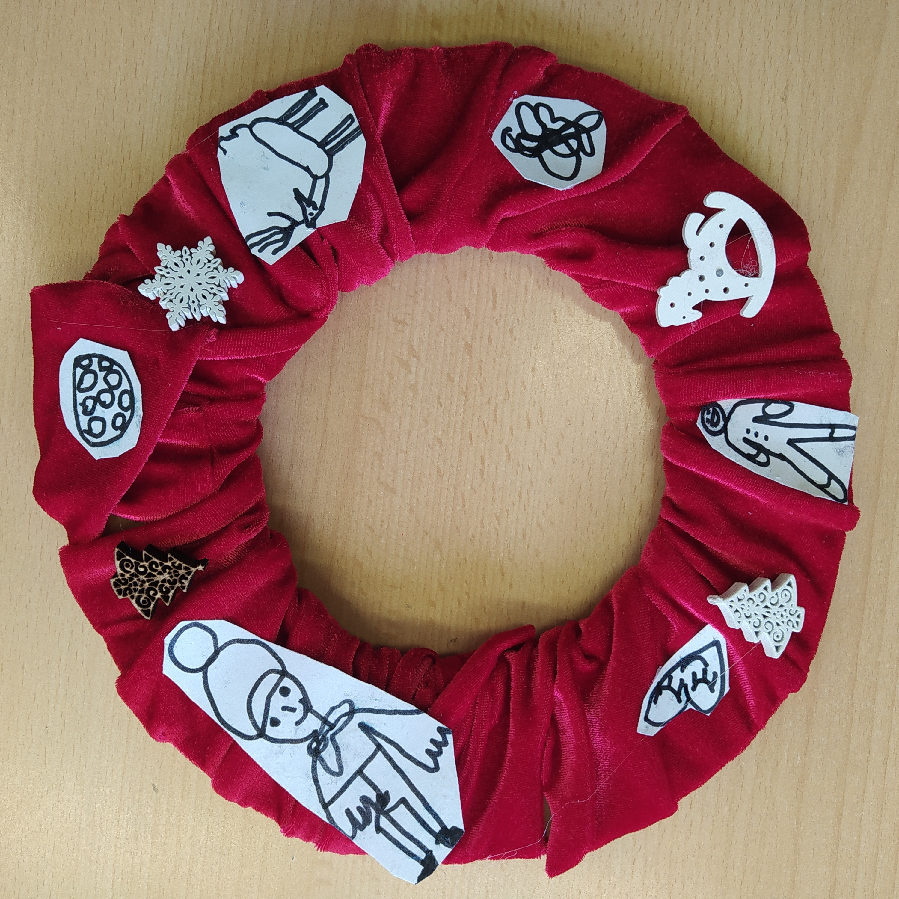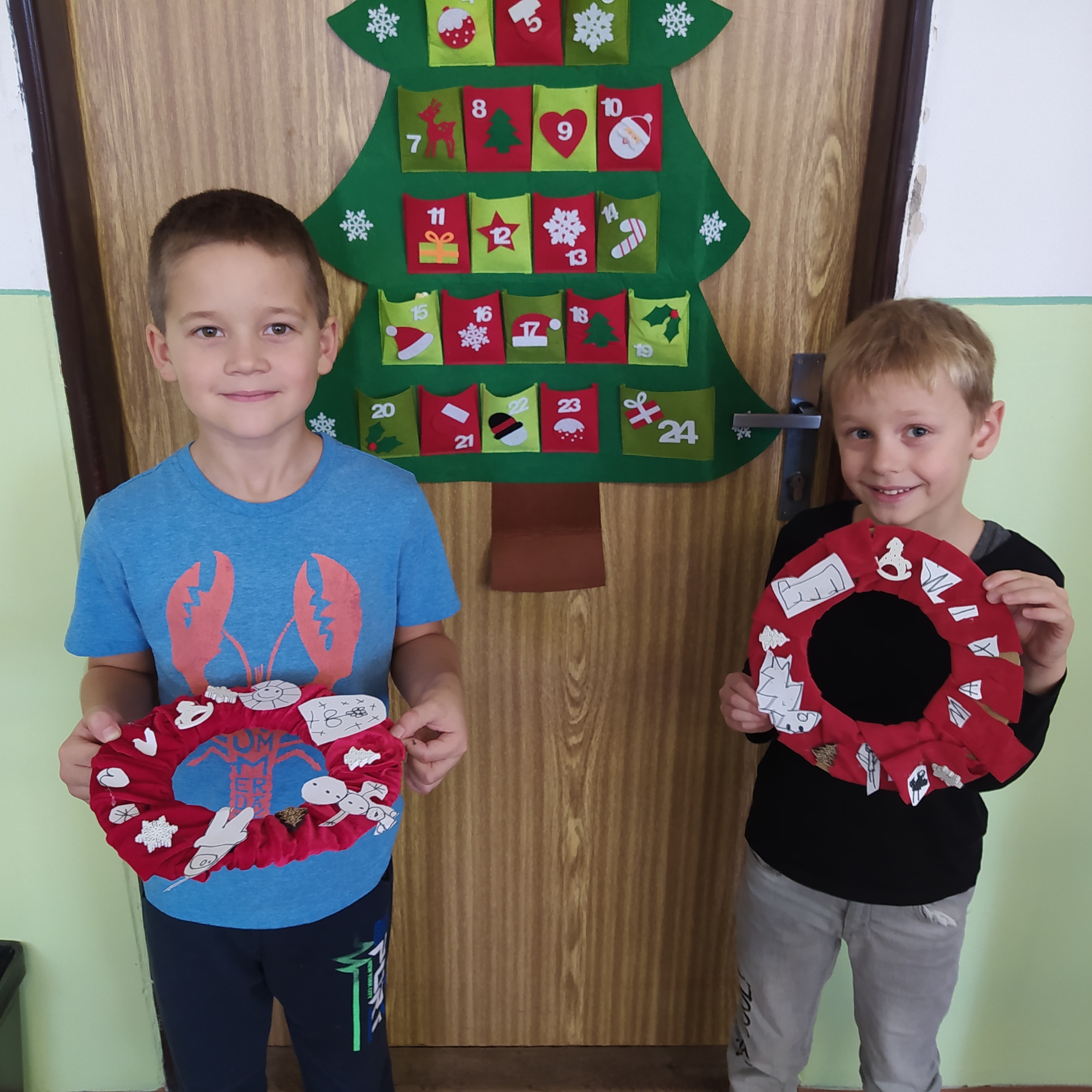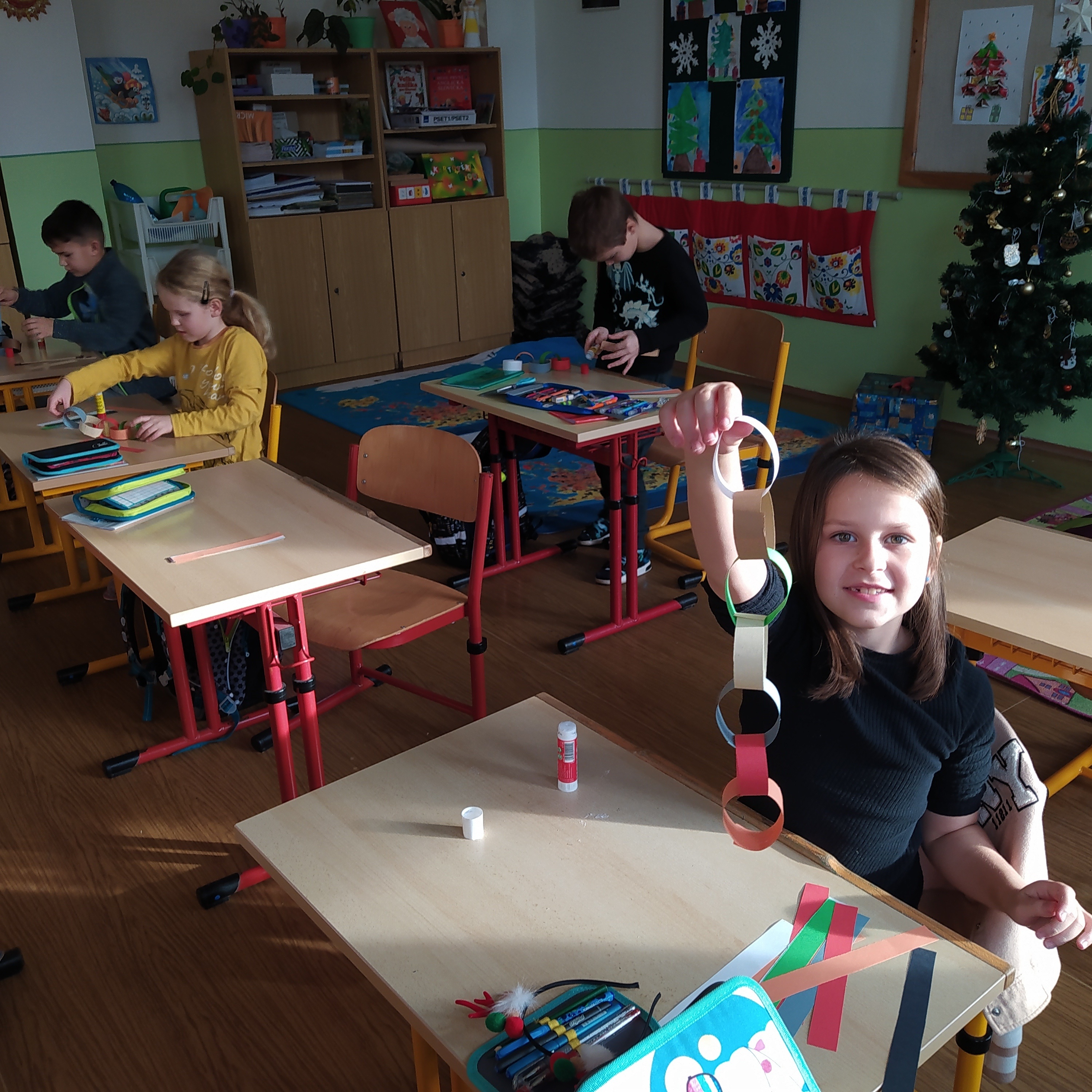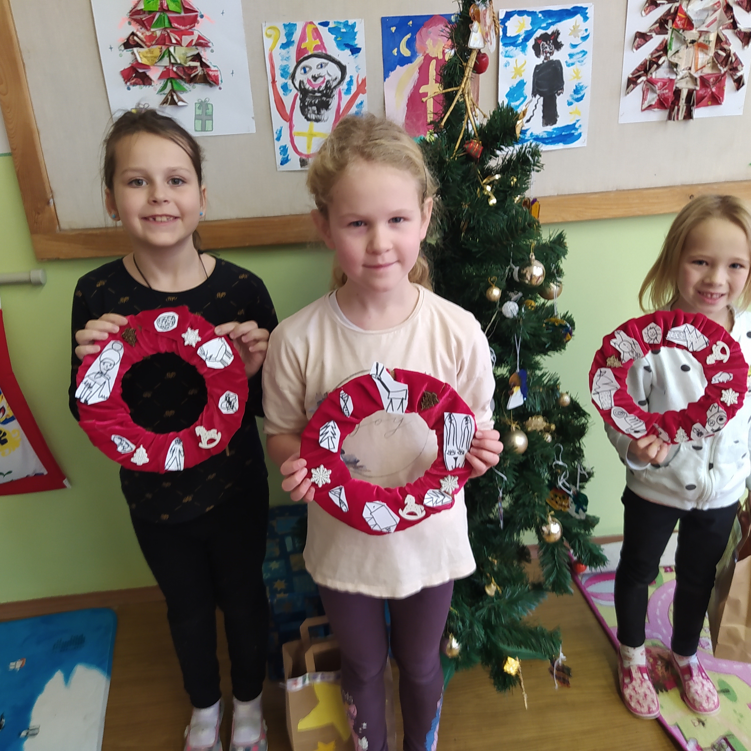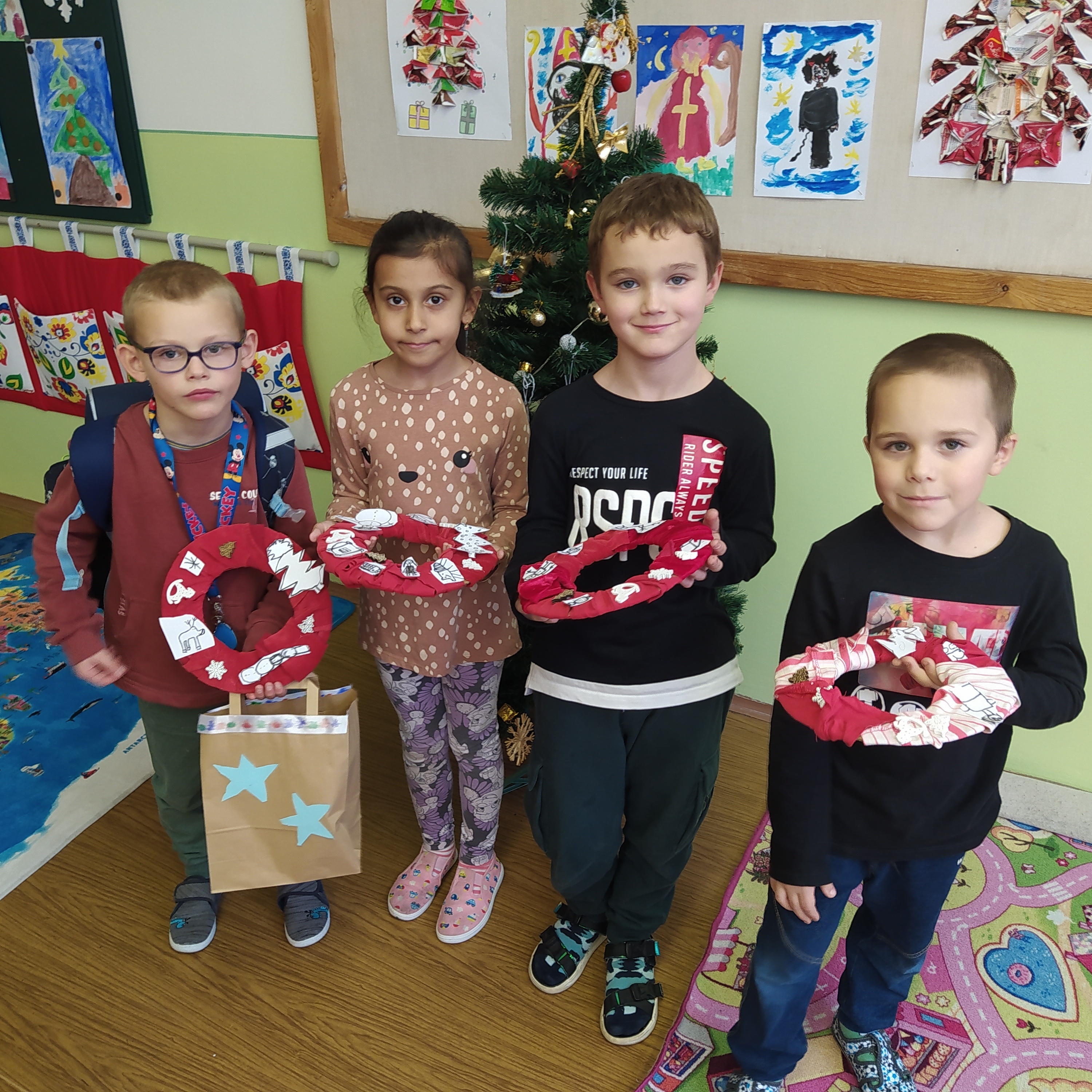 Vytvořili jsme si vánoční věnec, vánoční papír na dárky, vánoční řetěz na stromeček a vánoční dárkovou tašku.
