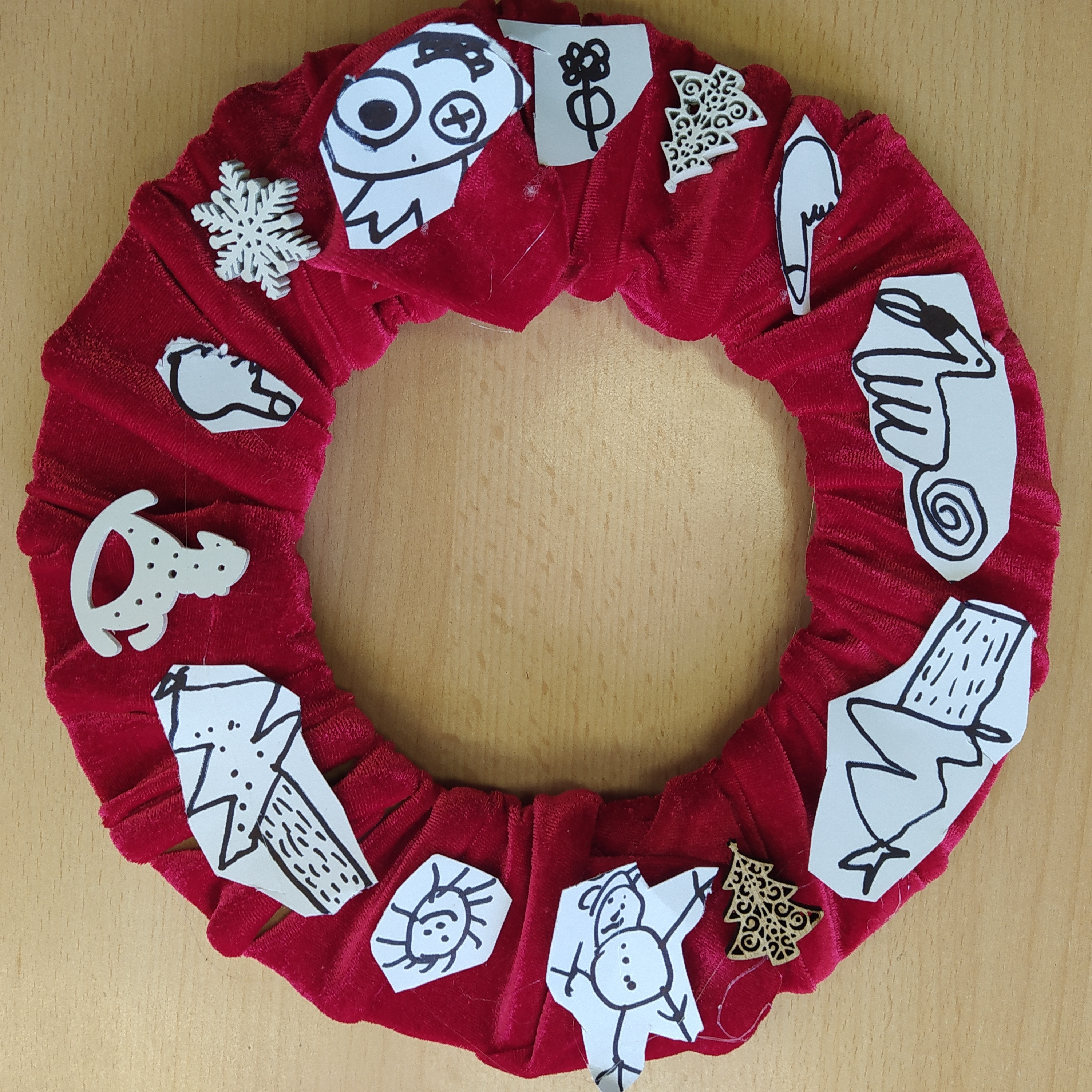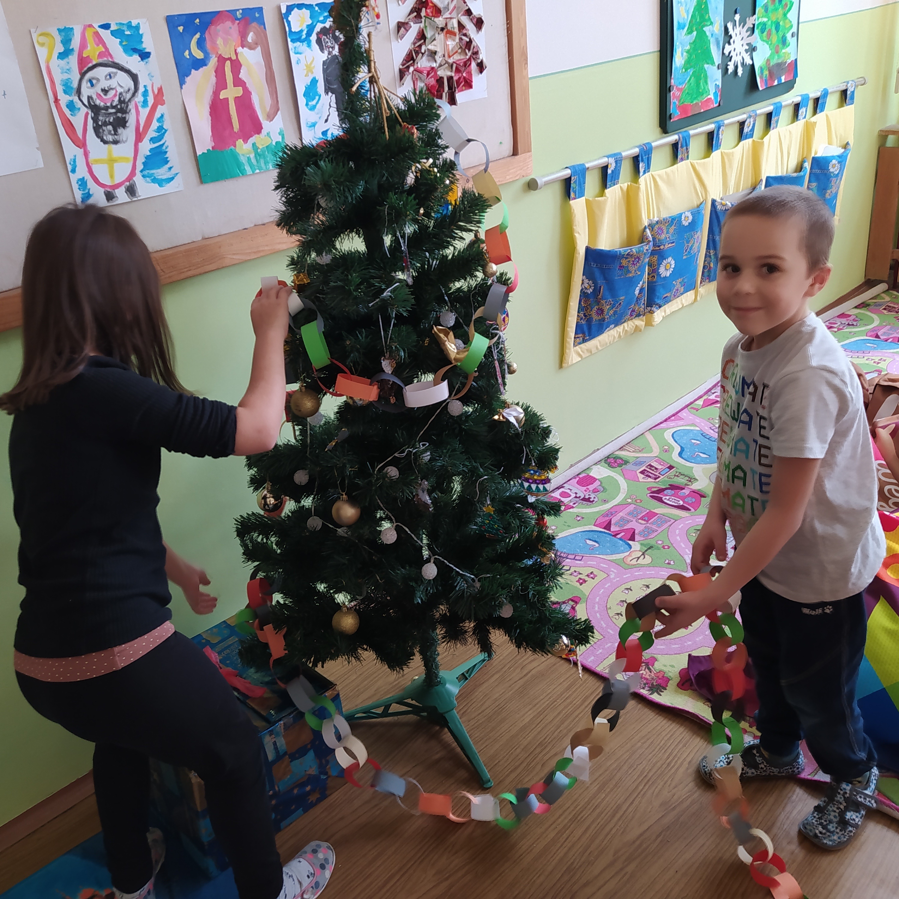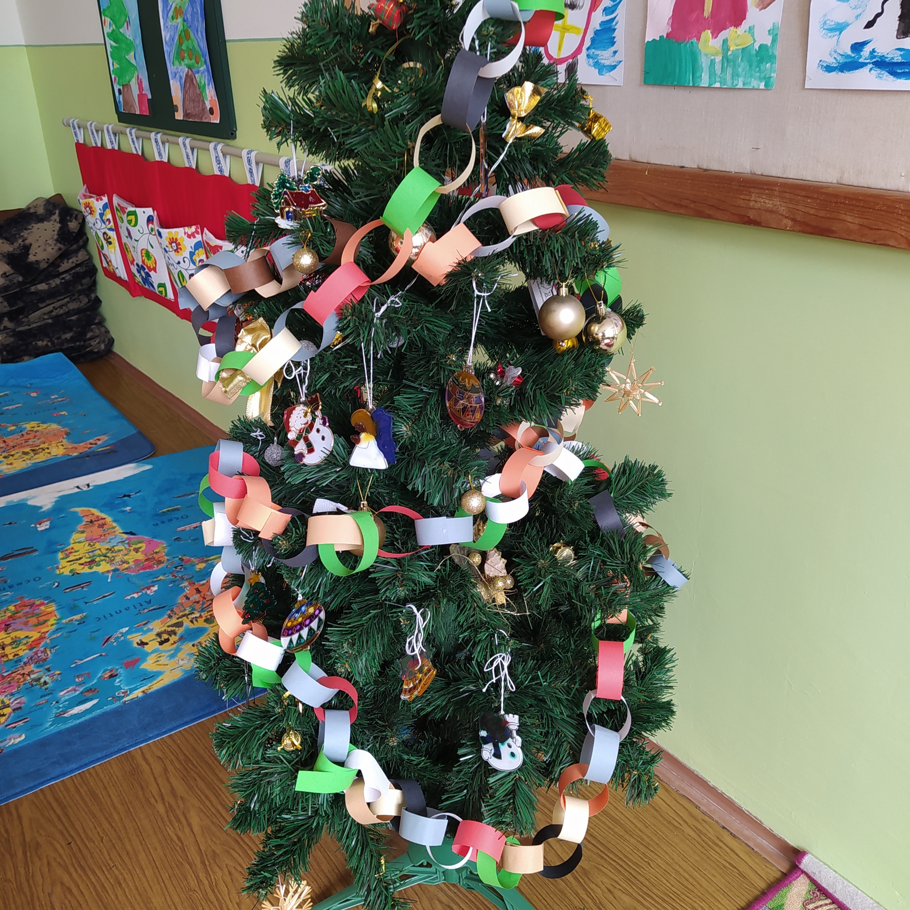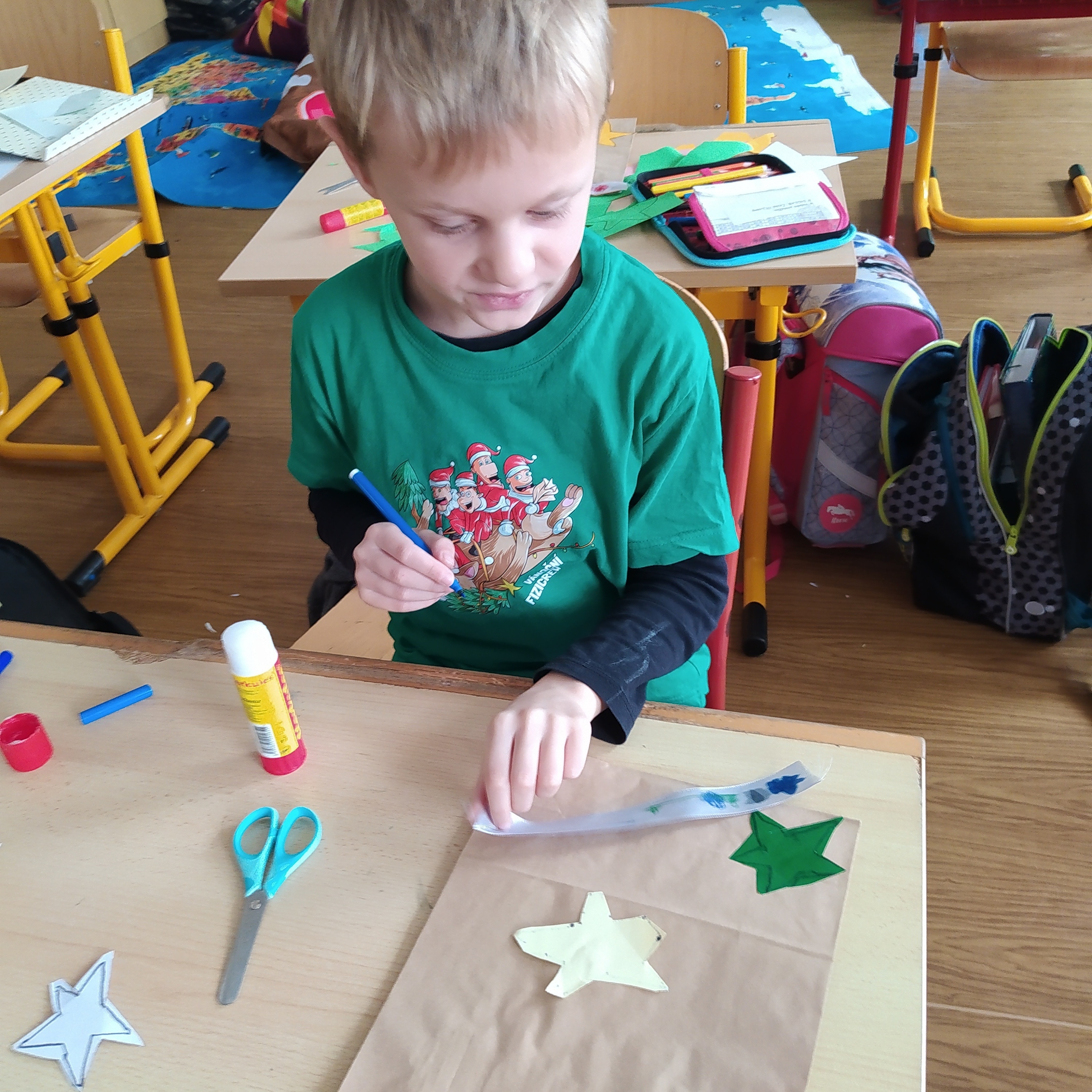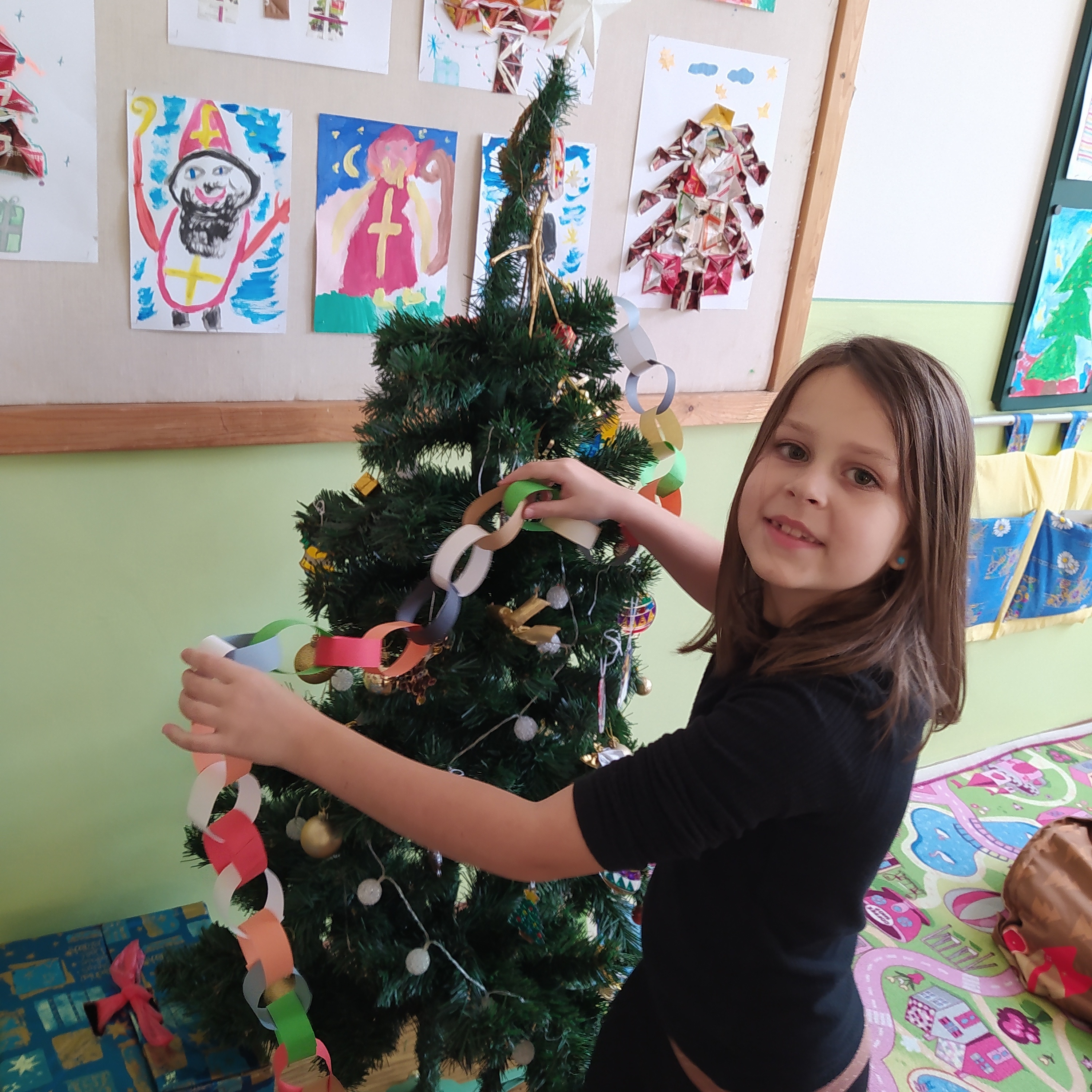 Vytvořili jsme si vánoční věnec, vánoční papír na dárky, vánoční řetěz na stromeček a vánoční dárkovou tašku.