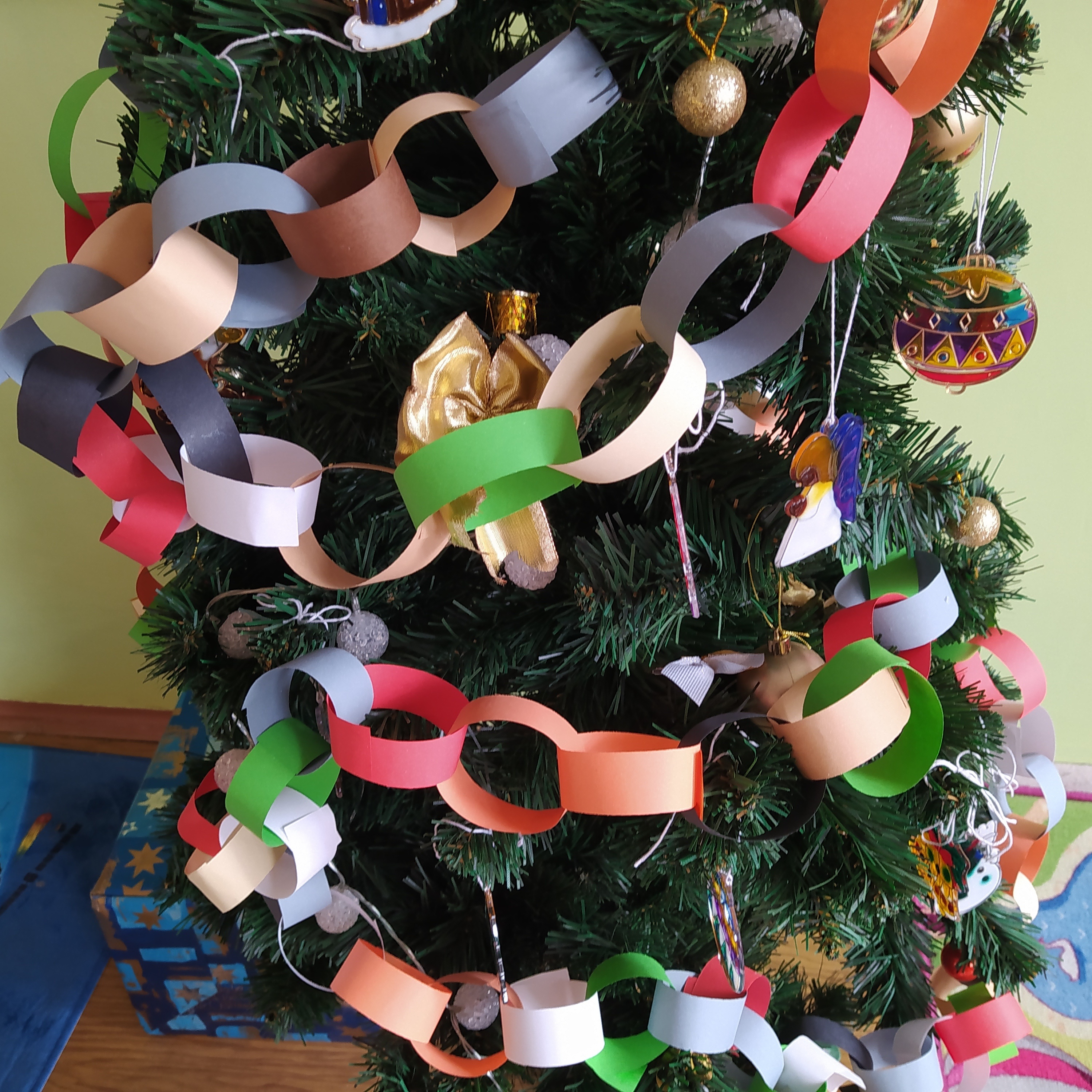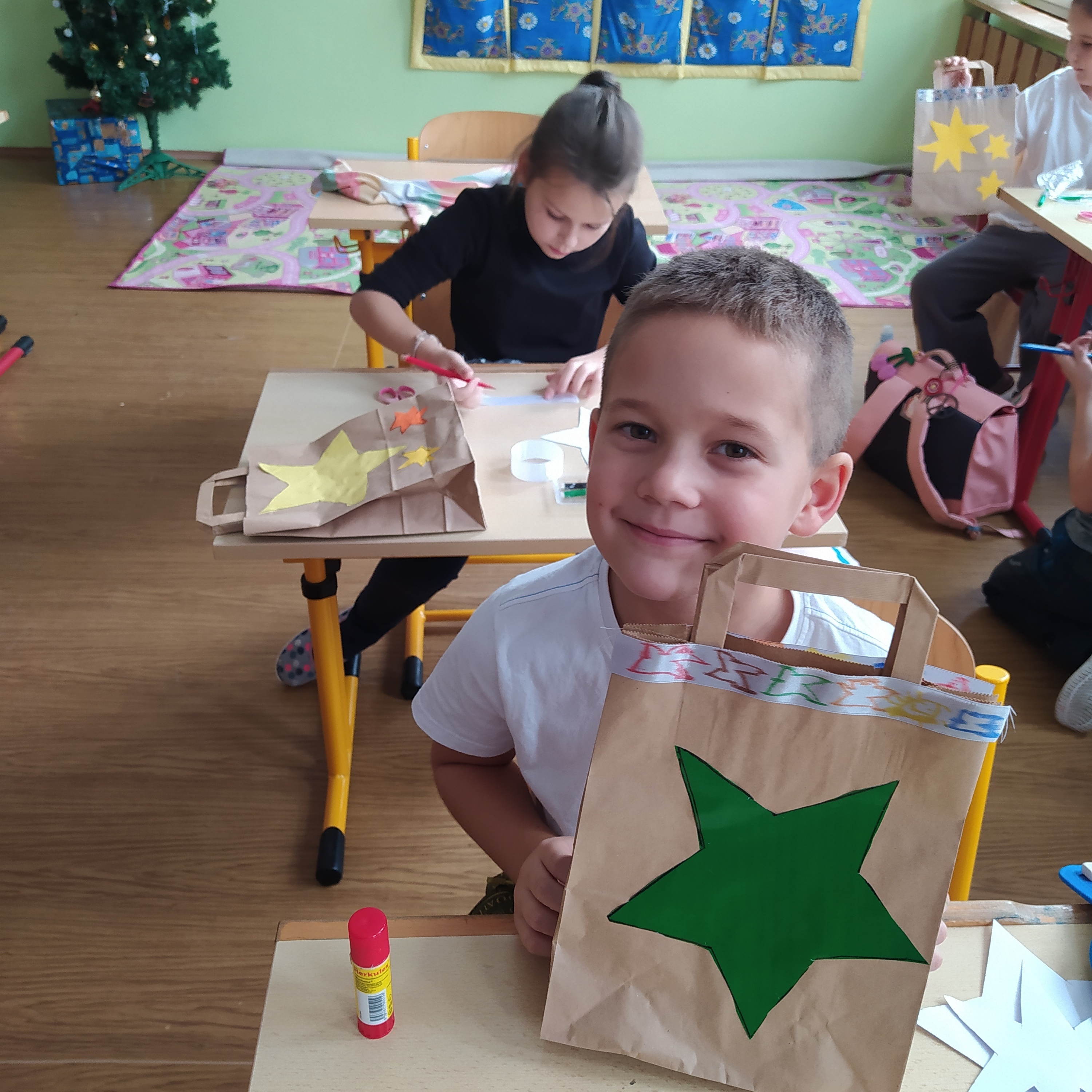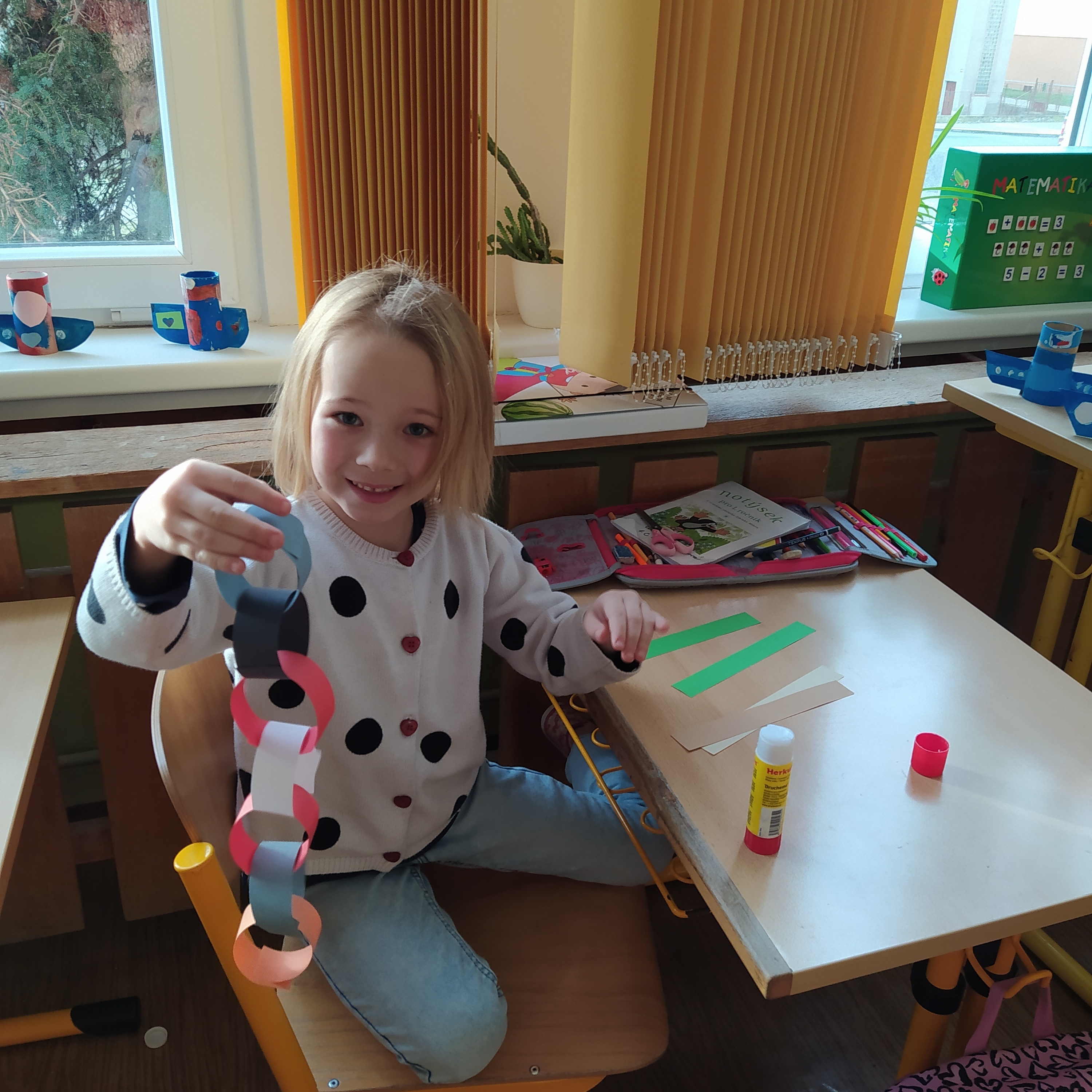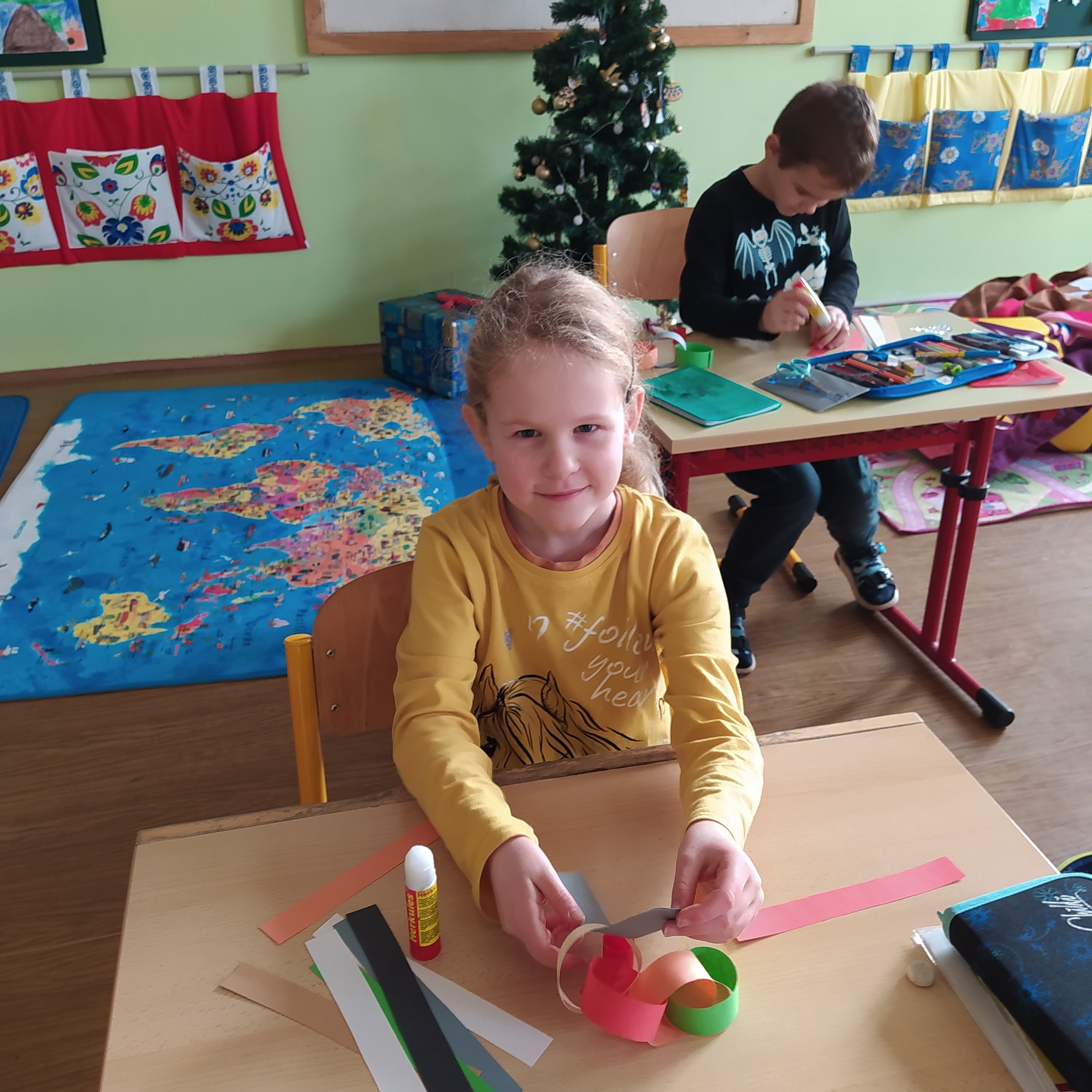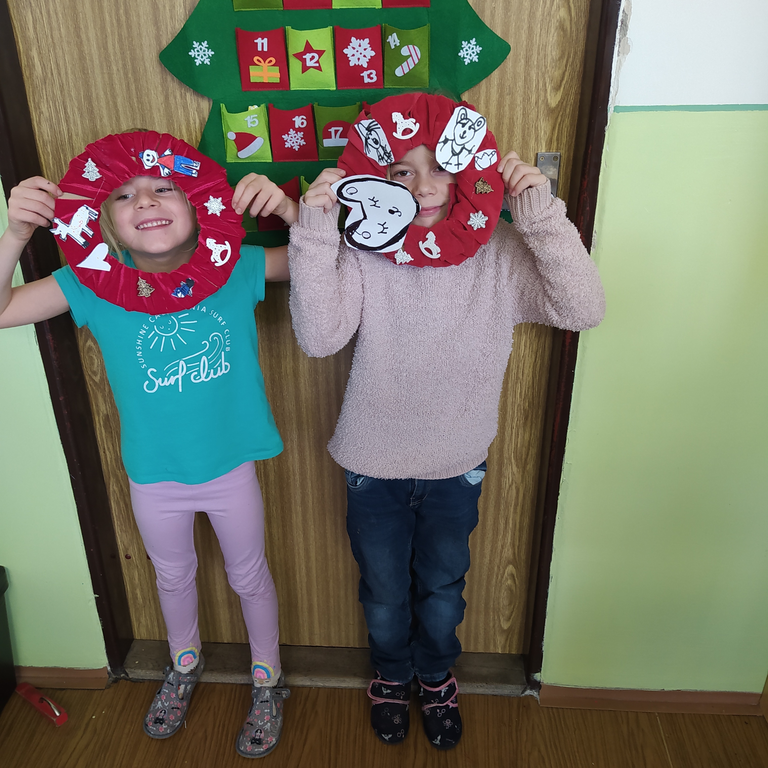 Vytvořili jsme si vánoční věnec, vánoční papír na dárky, vánoční řetěz na stromeček a vánoční dárkovou tašku.