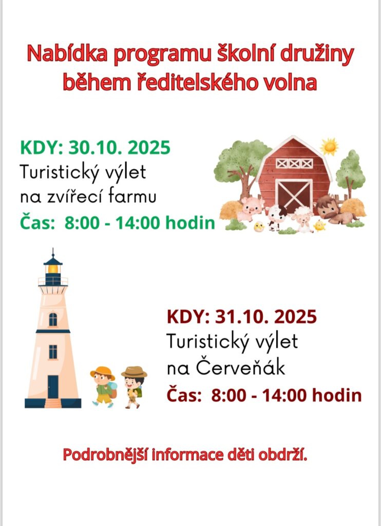 Oznámení o vyhlášení ředitelského volna Ředitelka školy vyhlašuje podle §24 odst. 2 zákona č. 561/2004 Sb., školského zákona ve čtvrtek 30. 10. a v pátek 31. 10. 2025 ředitelské volno. V těchto dnech nebude v provozu školní jídelna. Školní družina bude v provozu podle zájmu předem přihlášených žáků. Ředitelské volno je vyhlášeno z provozně organizačních […]